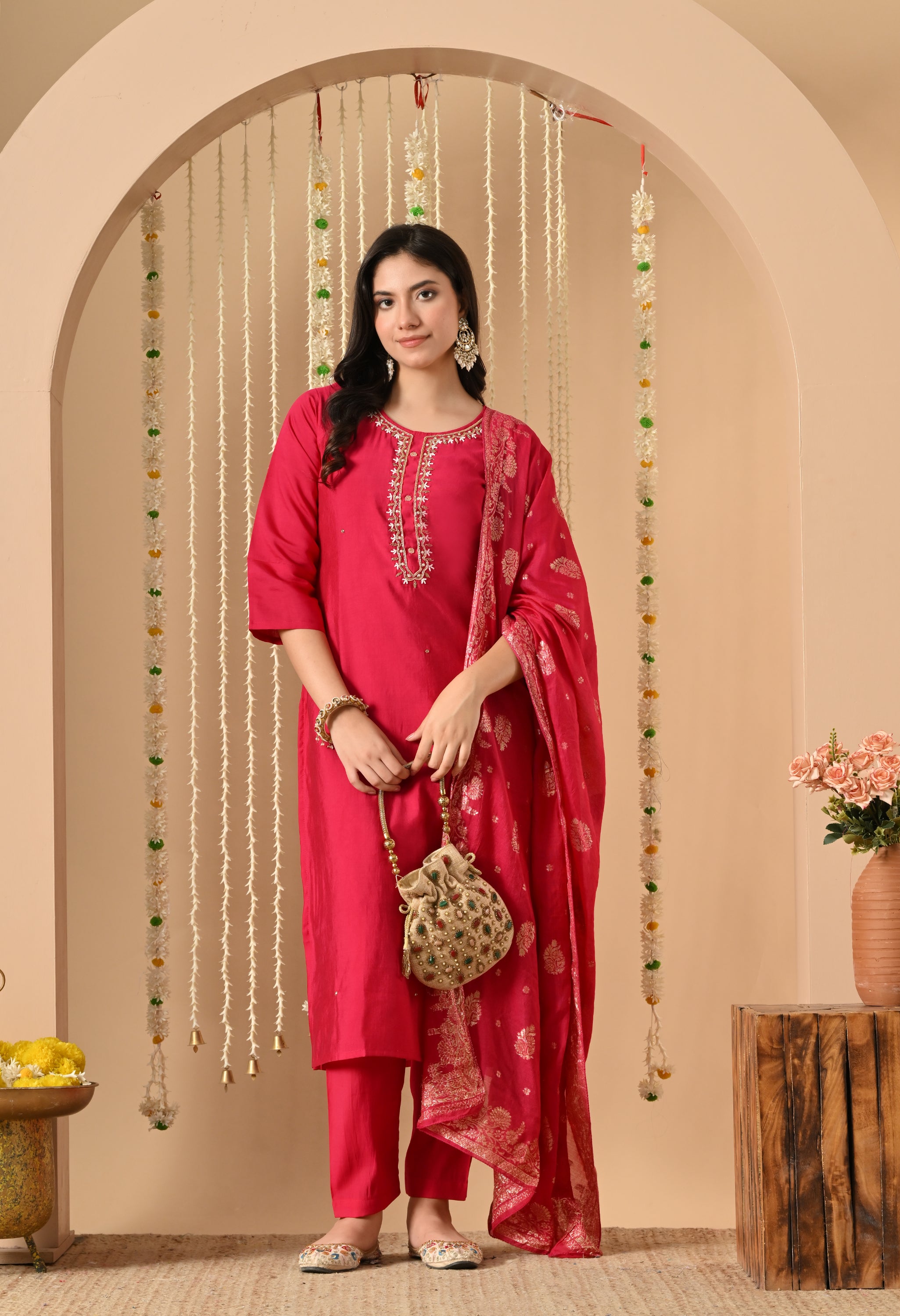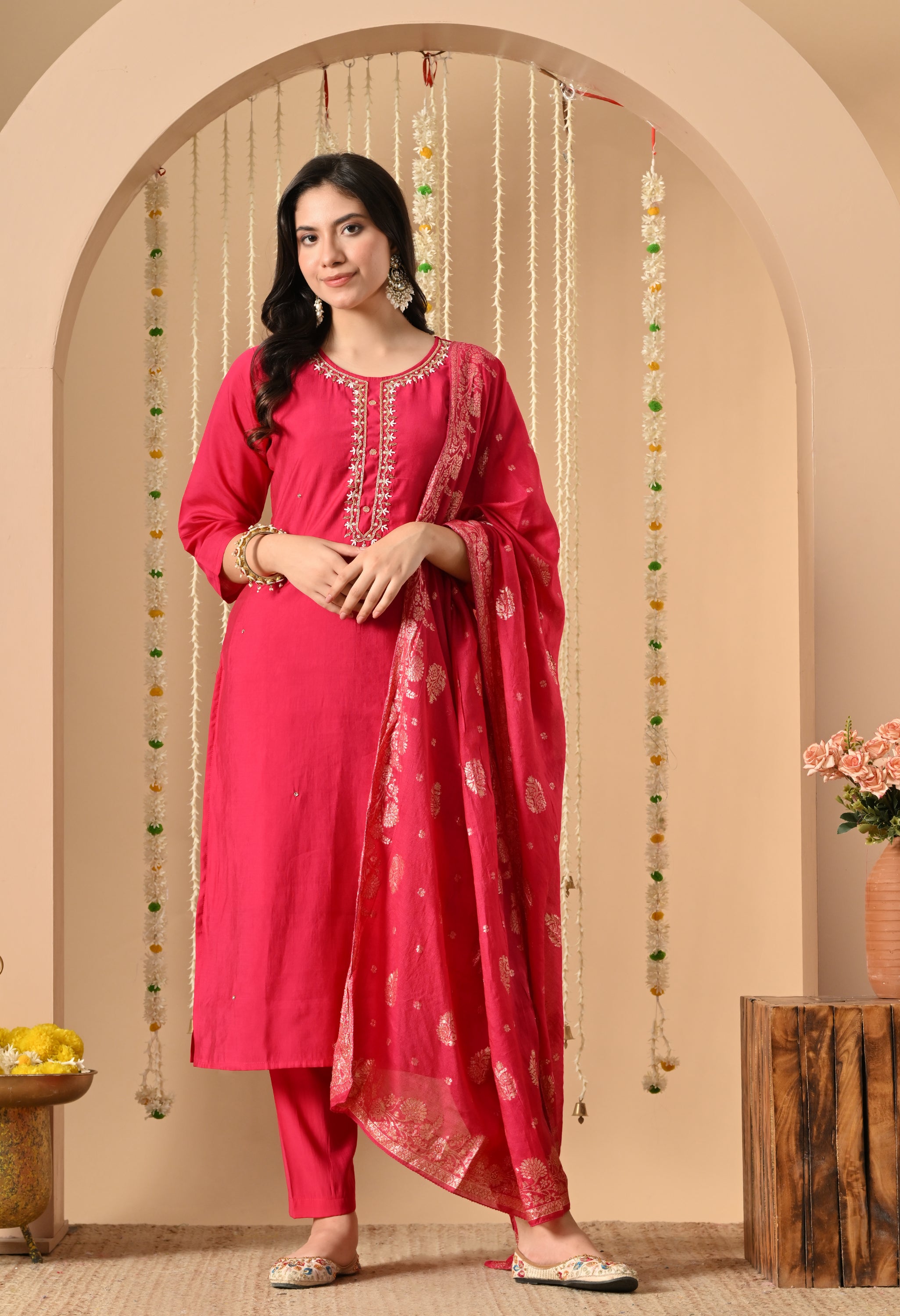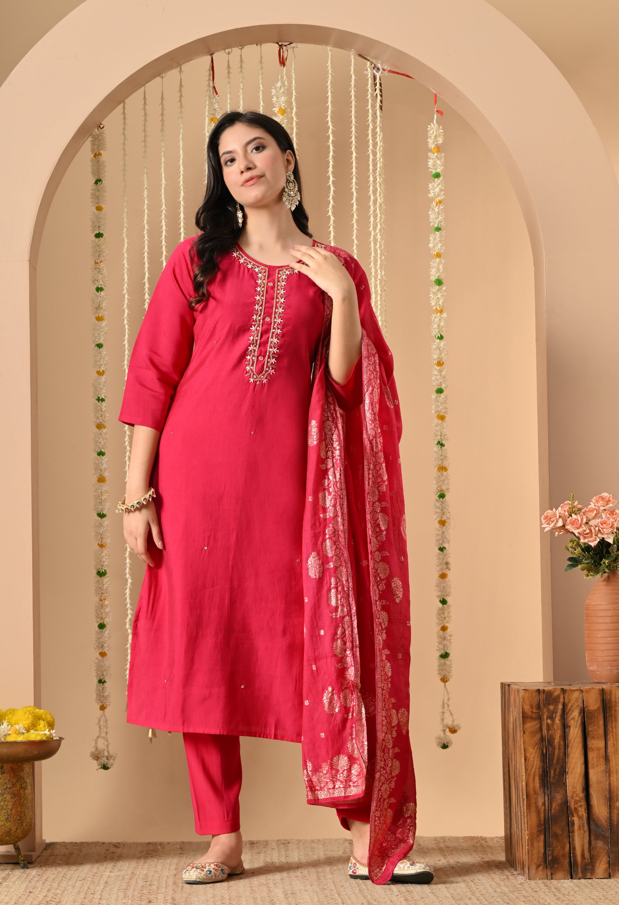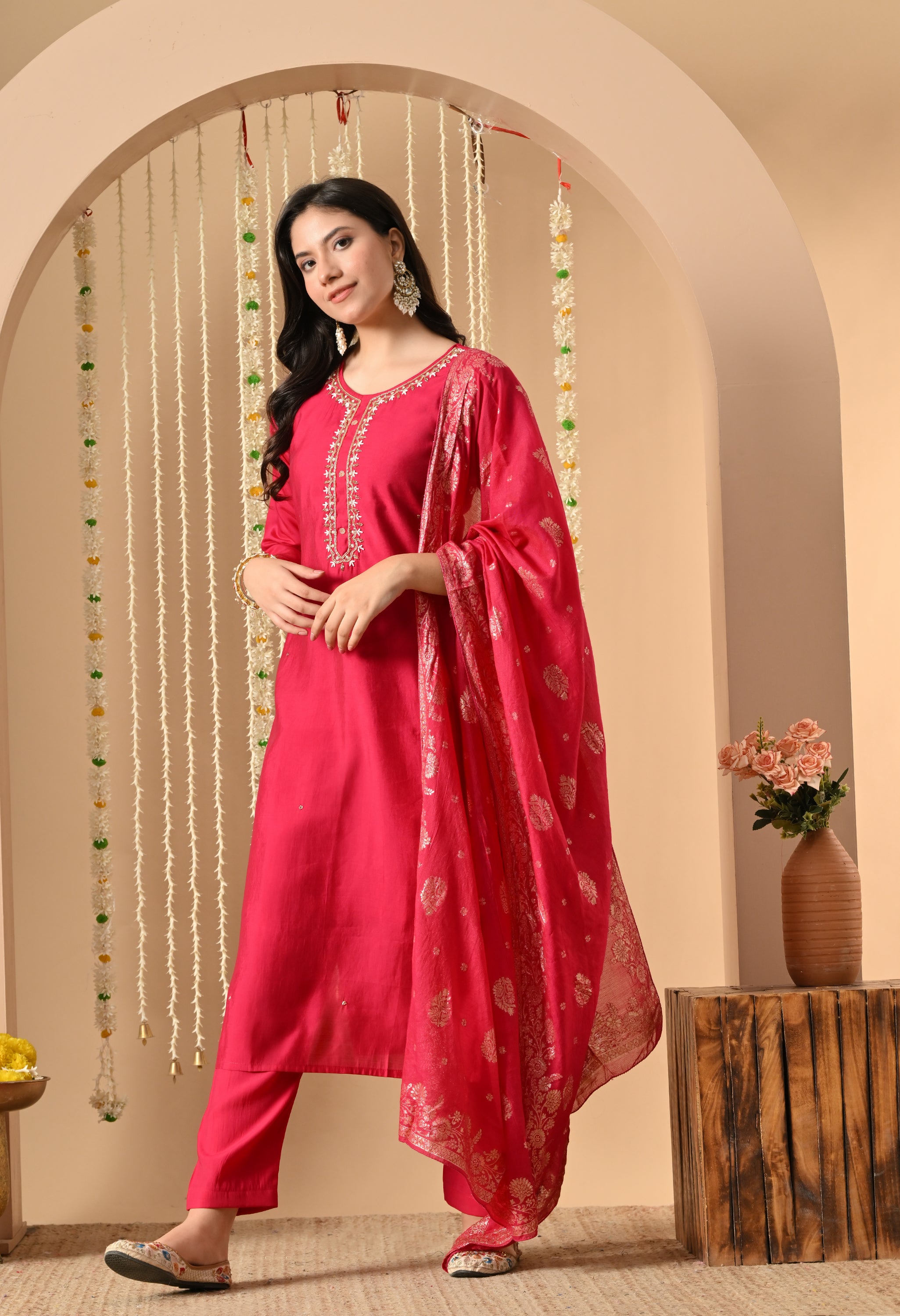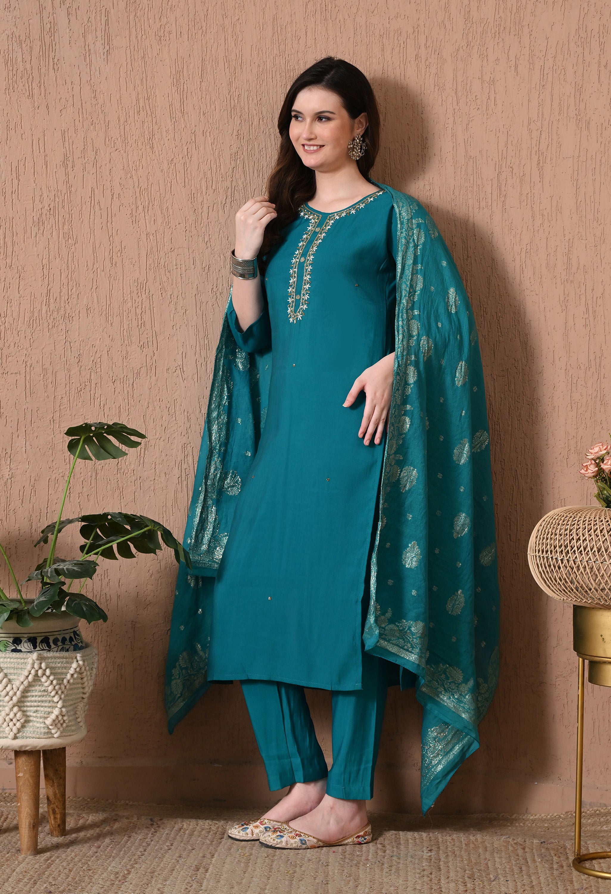 Embrace timeless elegance with our utsavi teal suit set, a beautifully designed ensemble in a rich teal hue that radiates understated grace. The kurta features delicate thread embroidery along the neckline, complemented by subtle gold zari work that adds a hint of shimmer. Paired with a stunning Banarasi-style dupatta adorned with traditional motifs and matching solid pants, this outfit is a perfect blend of simplicity and festive finesse.