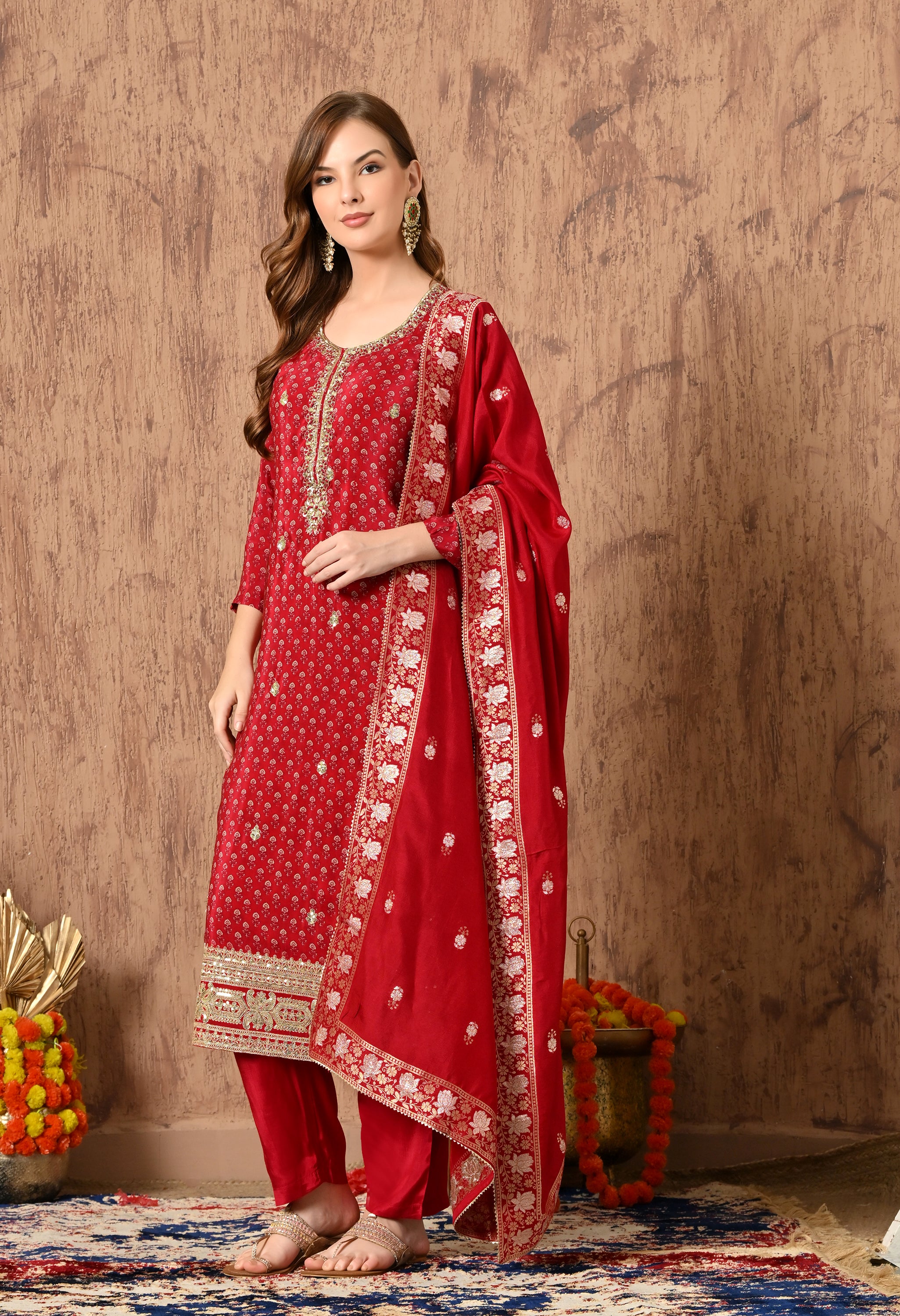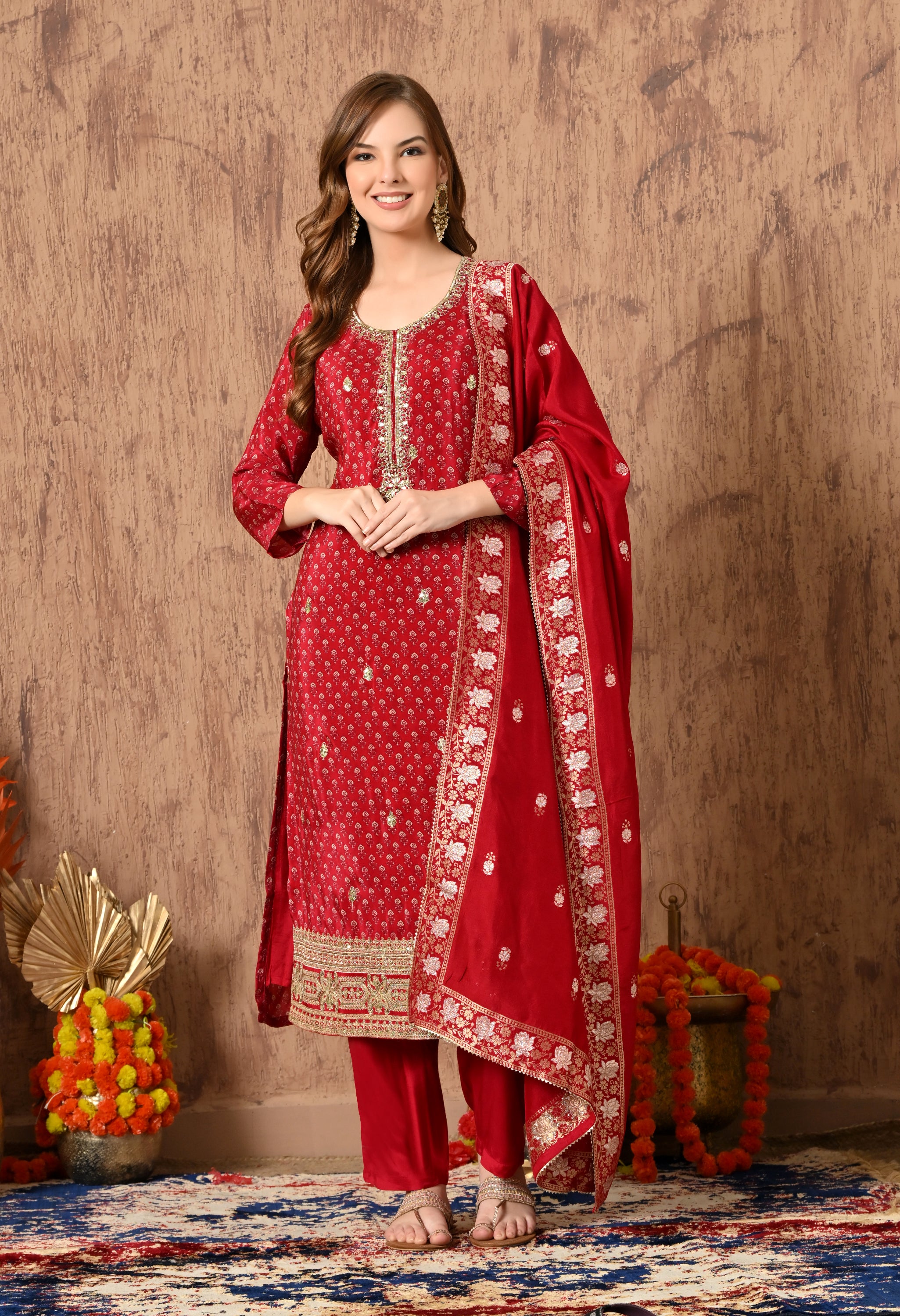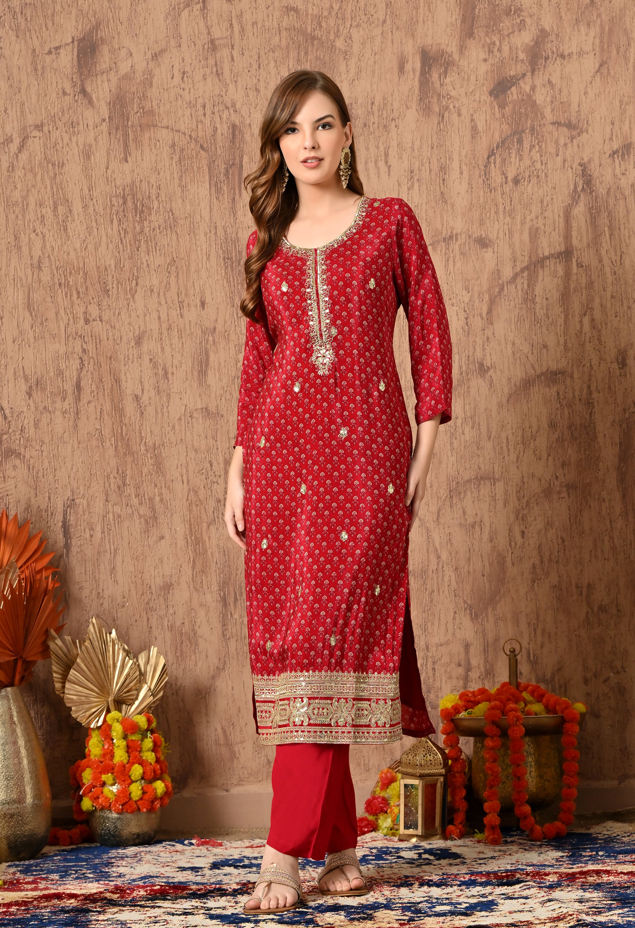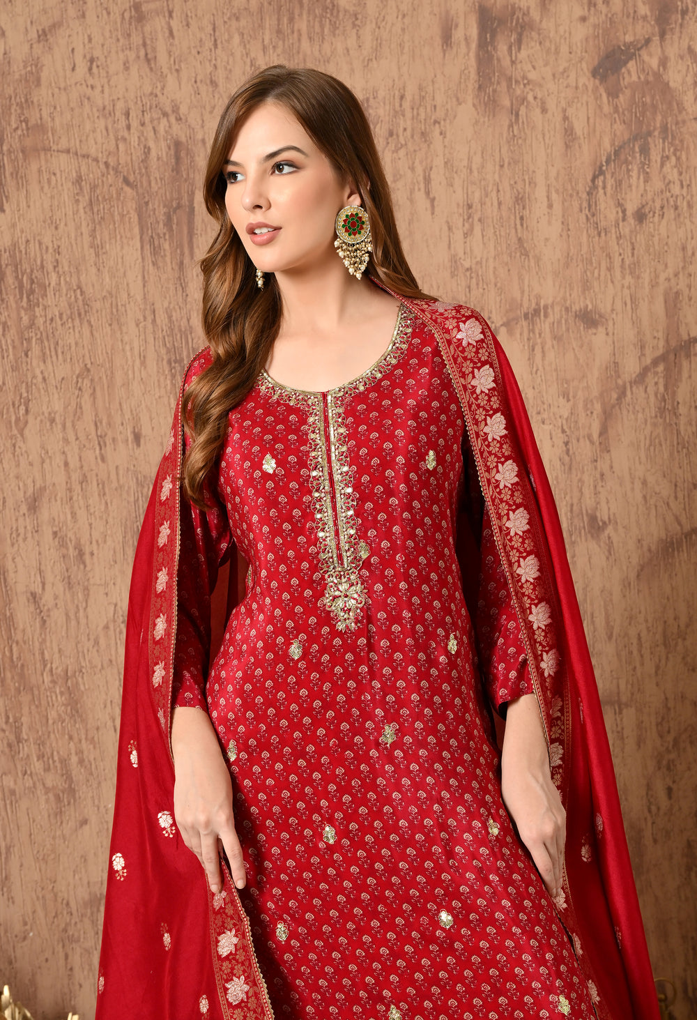 Turn heads with our Lal Pari a timeless ensemble crafted in rich red fabric adorned with intricate golden embroidery. The straight-cut kurta features a delicately embellished neckline and hemline, paired with matching bottoms for effortless grace. for festive occasions, weddings, and celebrations.