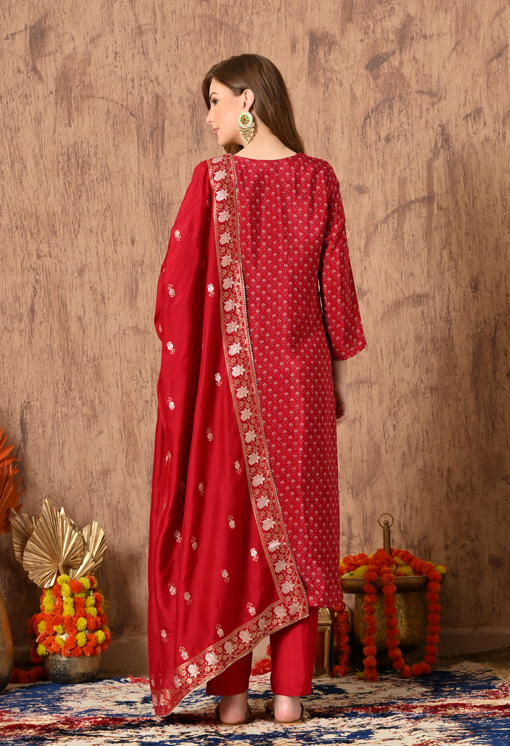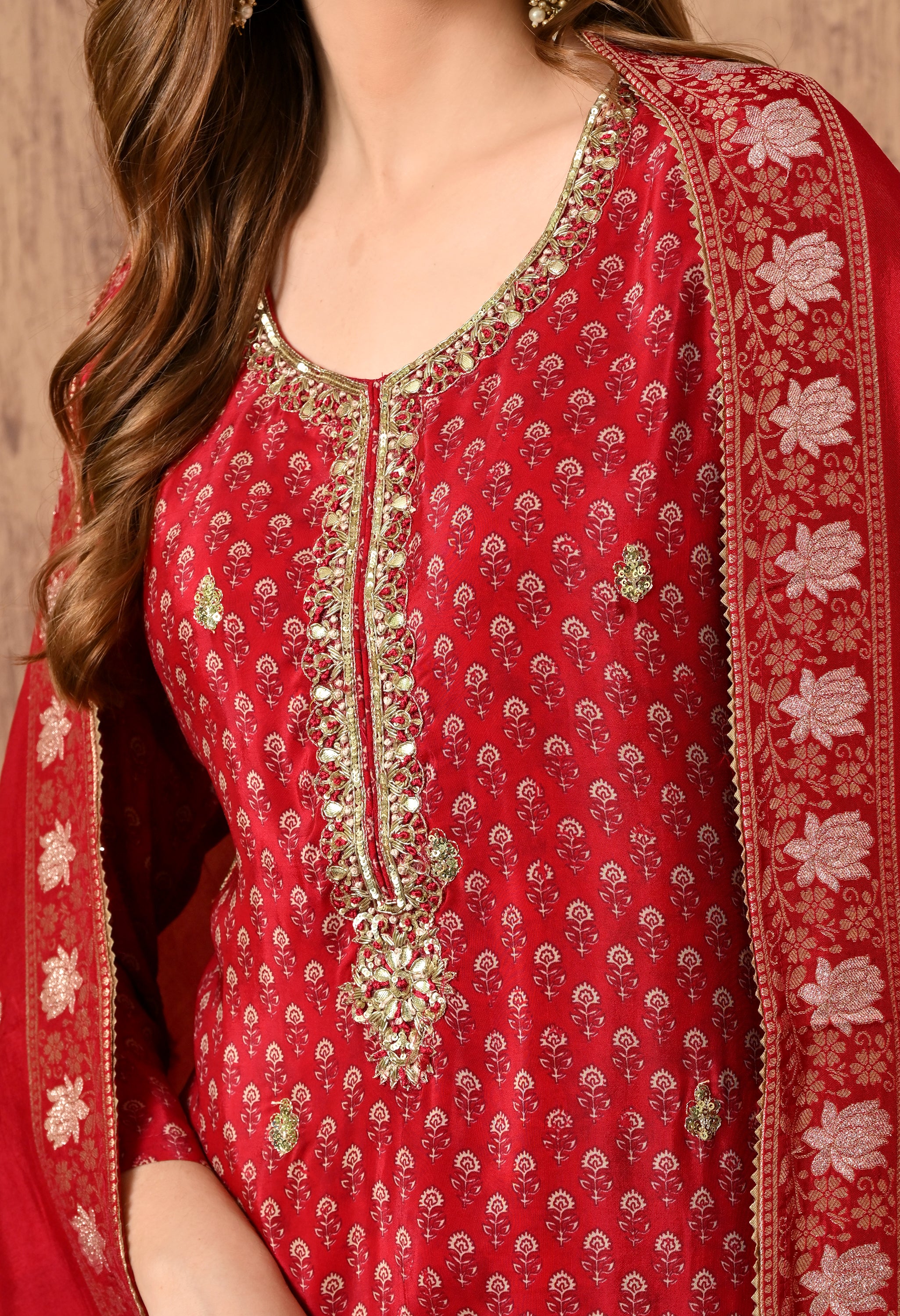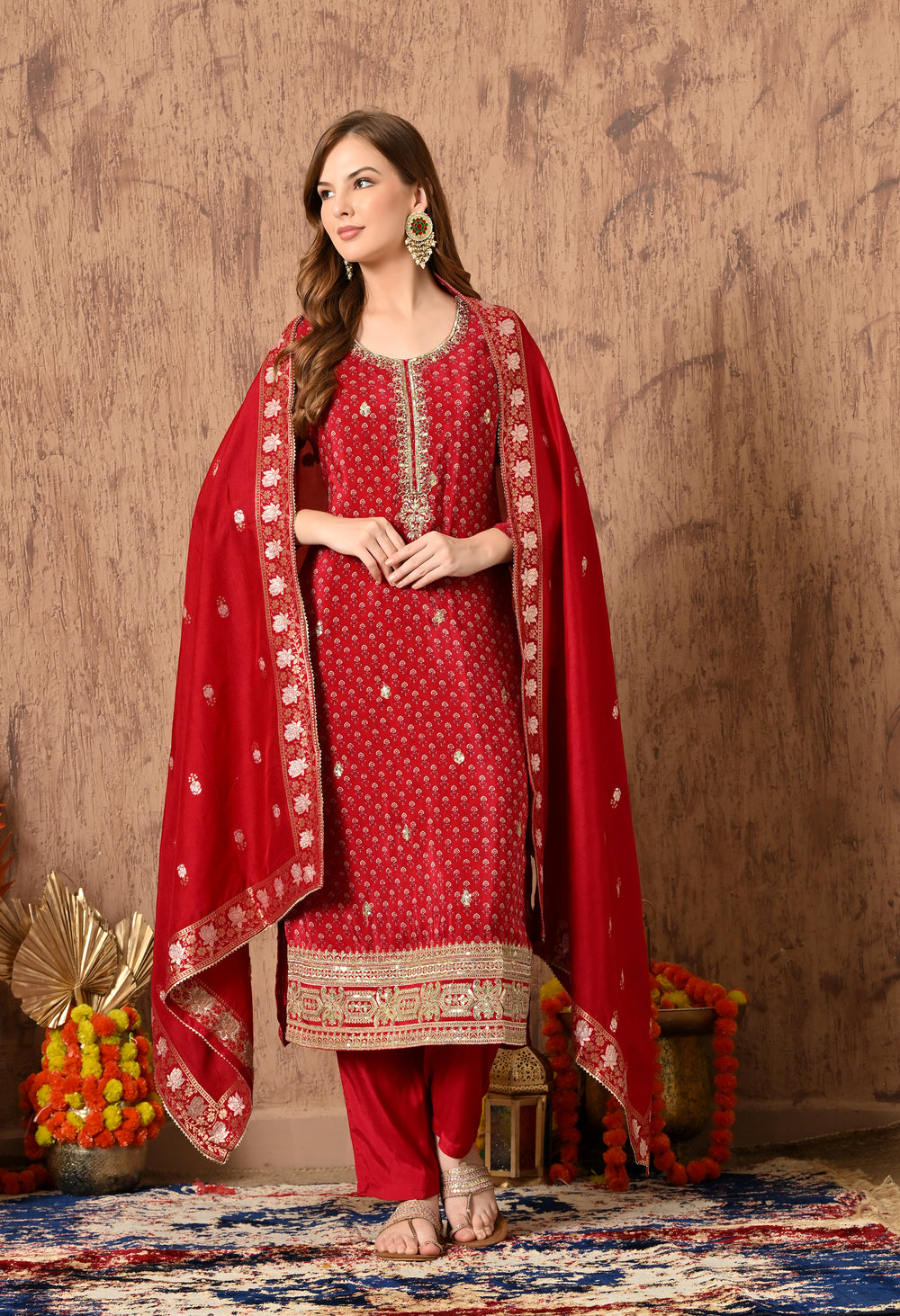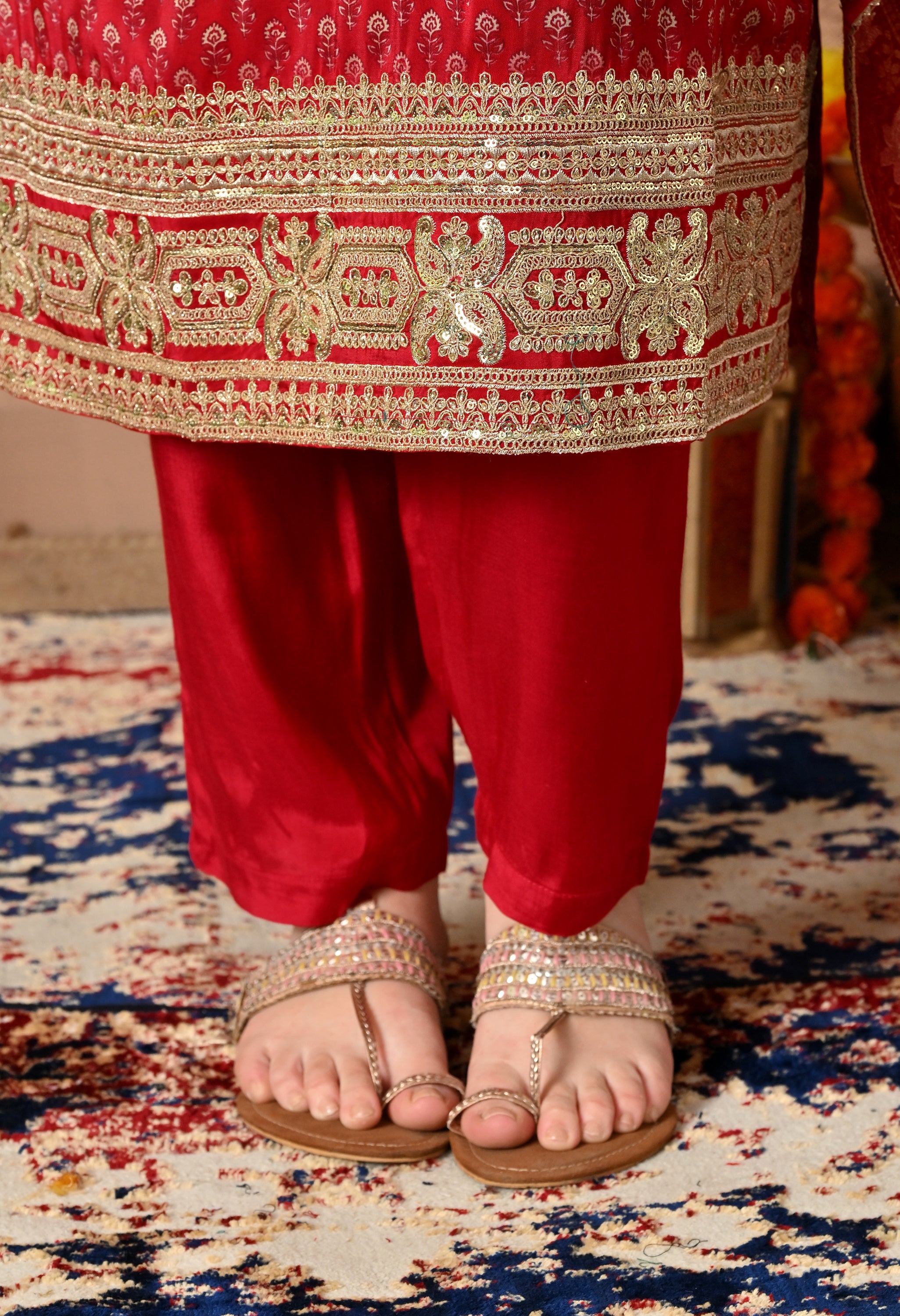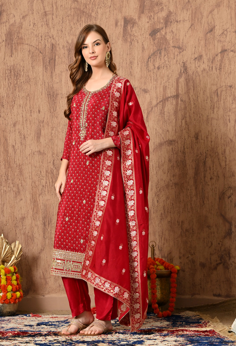 Turn heads with our Lal Pari a timeless ensemble crafted in rich red fabric adorned with intricate golden embroidery. The straight-cut kurta features a delicately embellished neckline and hemline, paired with matching bottoms for effortless grace. for festive occasions, weddings, and celebrations.