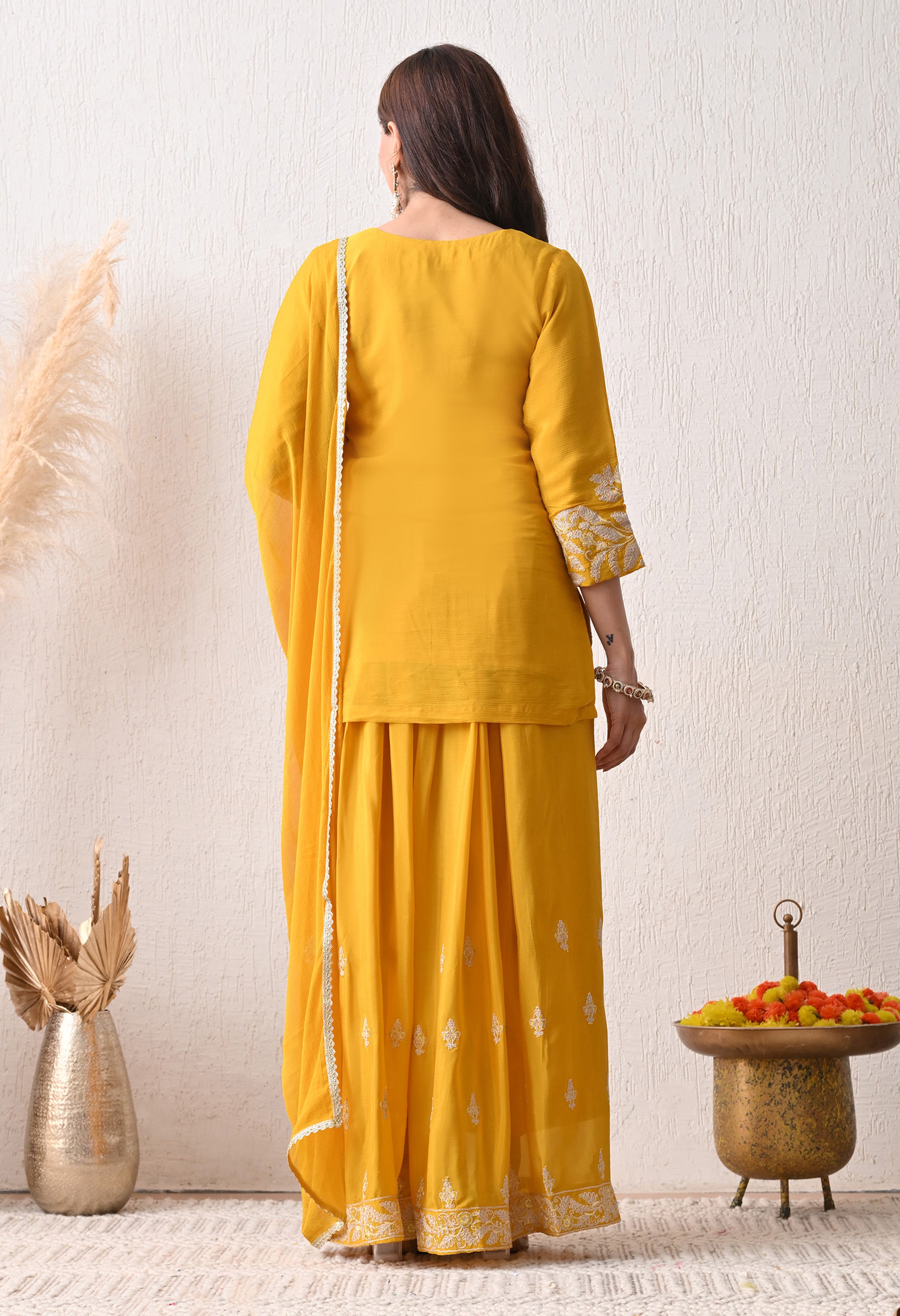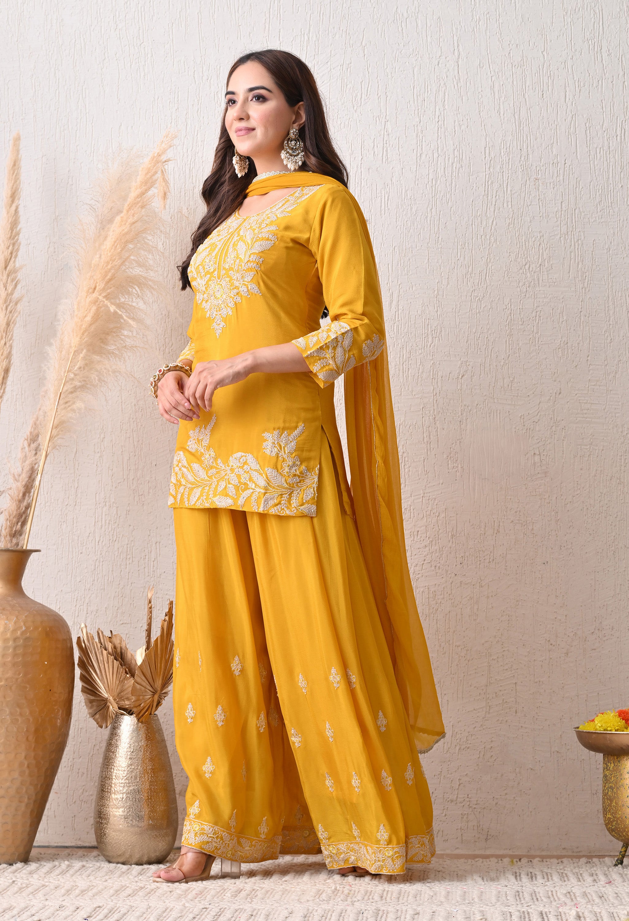 Bring brightness to every occasion with our Haldi Sunshine Sharara designed in a radiant mustard yellow hue. The kurta features intricate white thread embroidery on the neckline, hemline, and sleeves, perfectly balanced with wide palazzo embellished with delicate motifs. Paired with a soft matching dupatta, this outfit is a festive must-have for weddings, haldi functions, and special celebrations.
