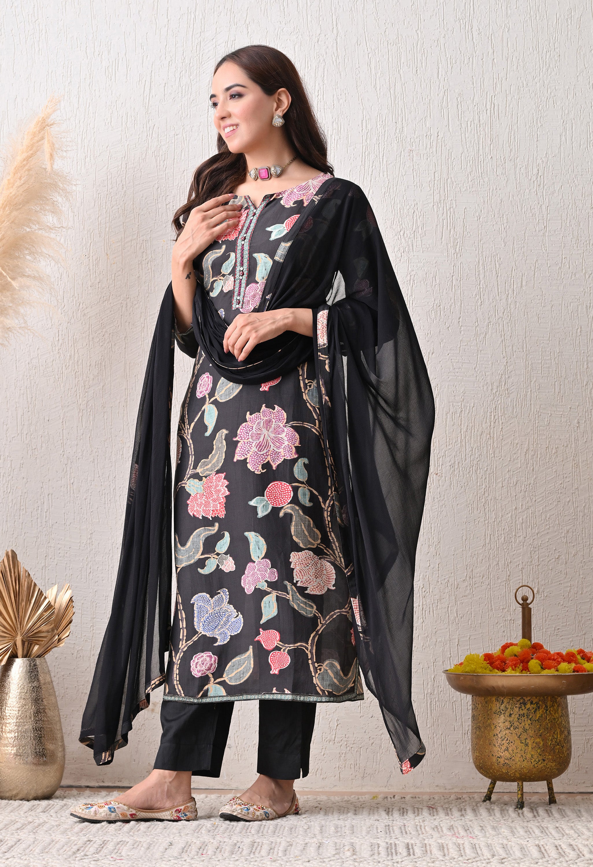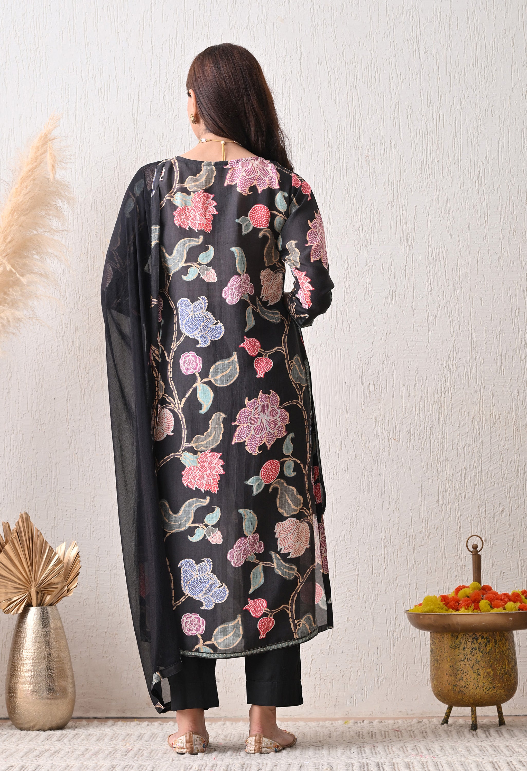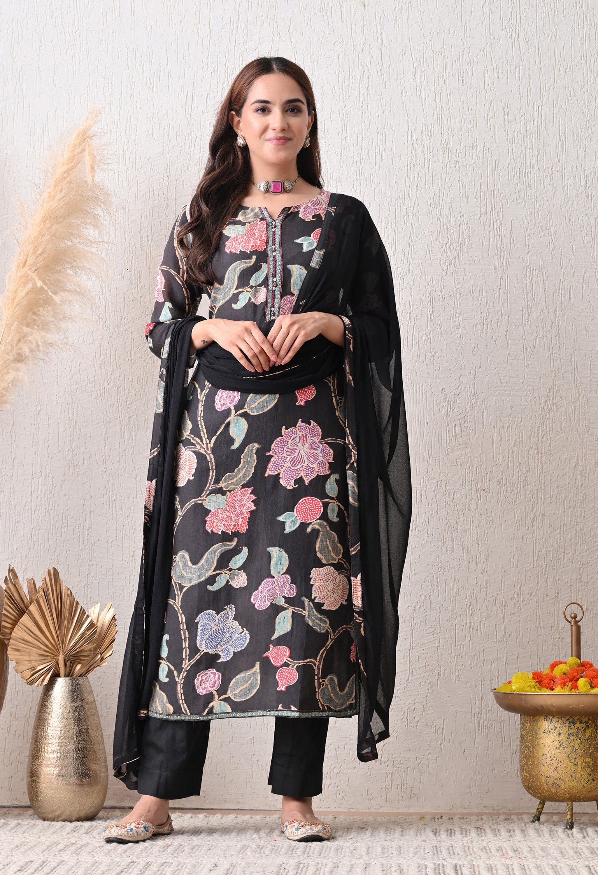 Make a bold yet graceful statement in this black kurta set, beautifully adorned with multi-colored floral prints.