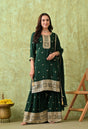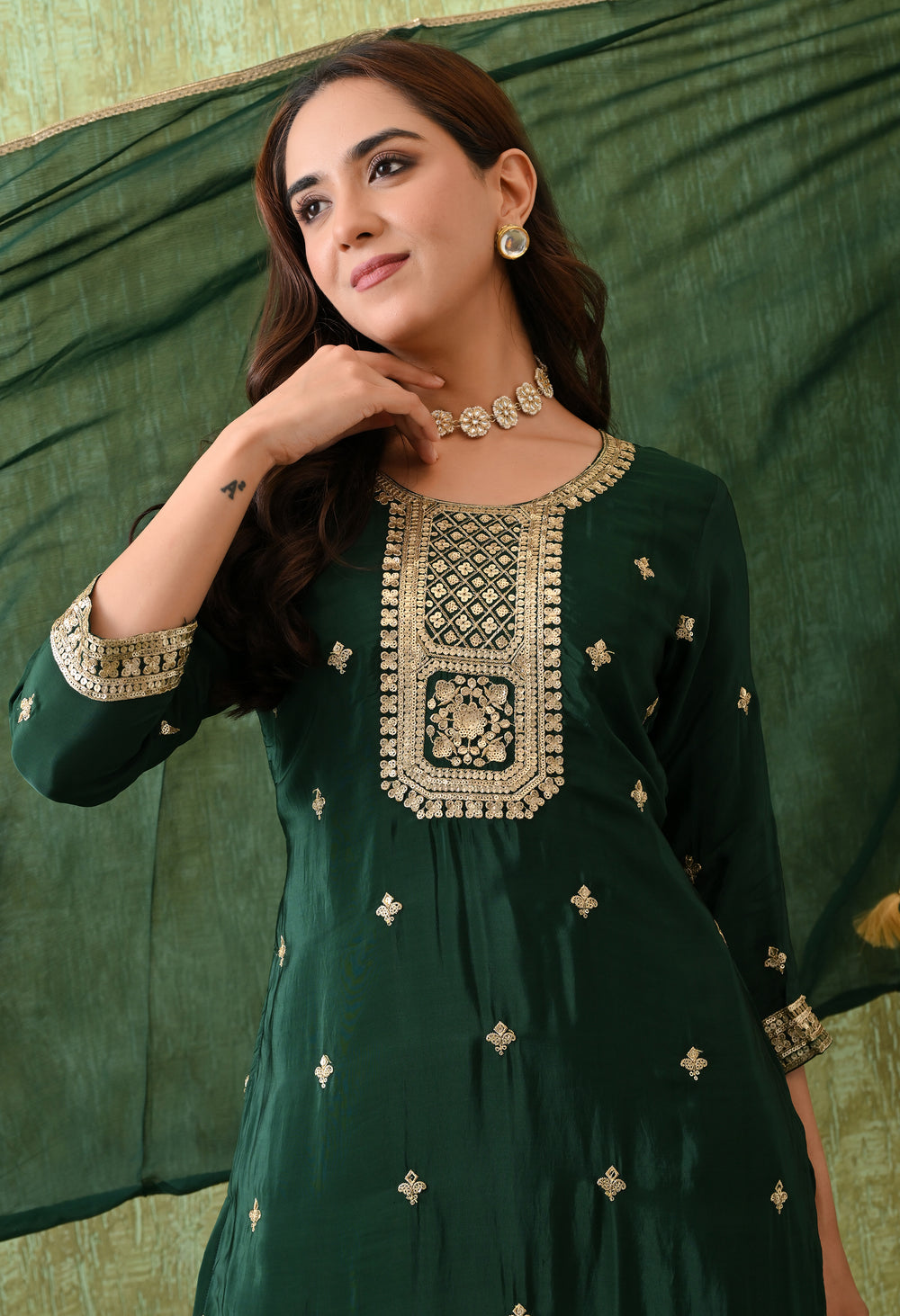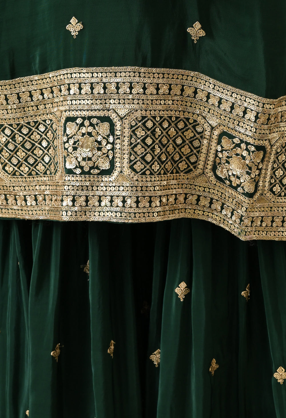 An elegant forest green adorned with intricate golden embroidery, designed to exude timeless grace. The rich embroidery on the neckline, hemline, and sharara gives this outfit a festive grandeur, making it ideal for weddings, festive celebrations, and cultural events.