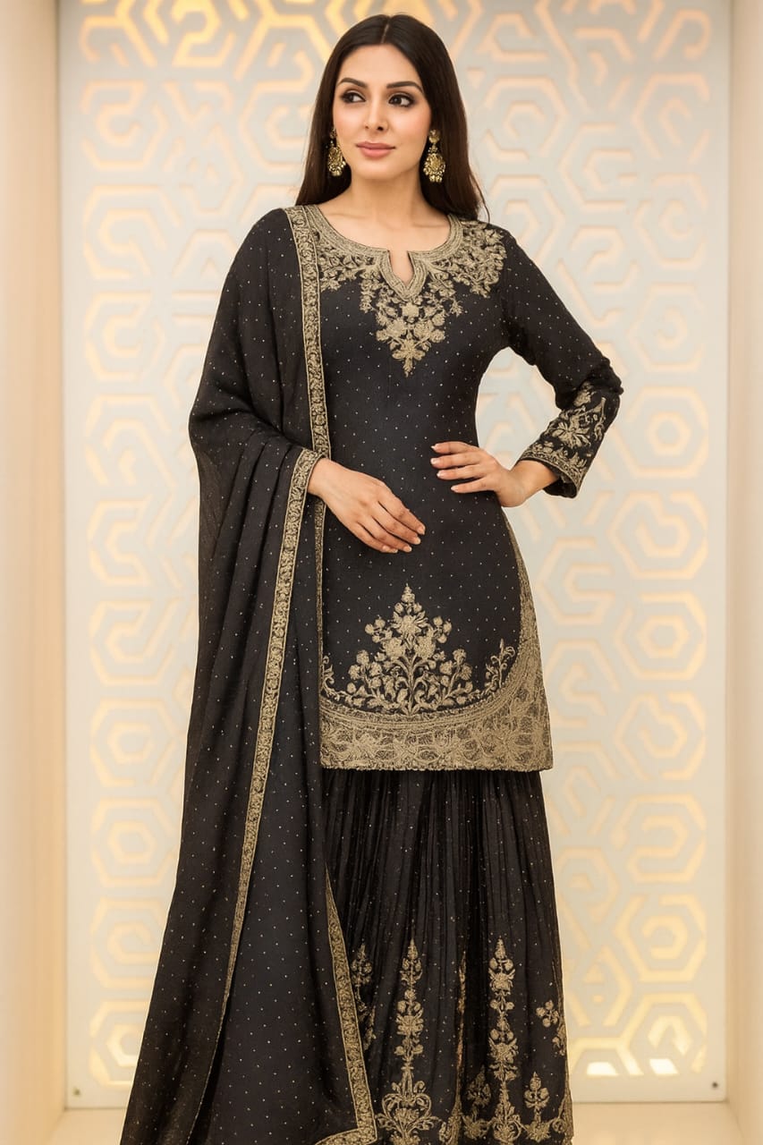 Step into timeless elegance with this exquisite black embroidered sharara set. Crafted from soft and flowy georgette fabric, the outfit features intricate zari and thread embroidery that enhances its luxurious appeal. The straight-cut kurta with gold-toned floral motifs is paired with a beautifully flared sharara and a matching dupatta adorned with delicate embroidery. Perfect for festive occasions, weddings, or evening celebrations, this ensemble effortlessly combines tradition with modern sophistication.
