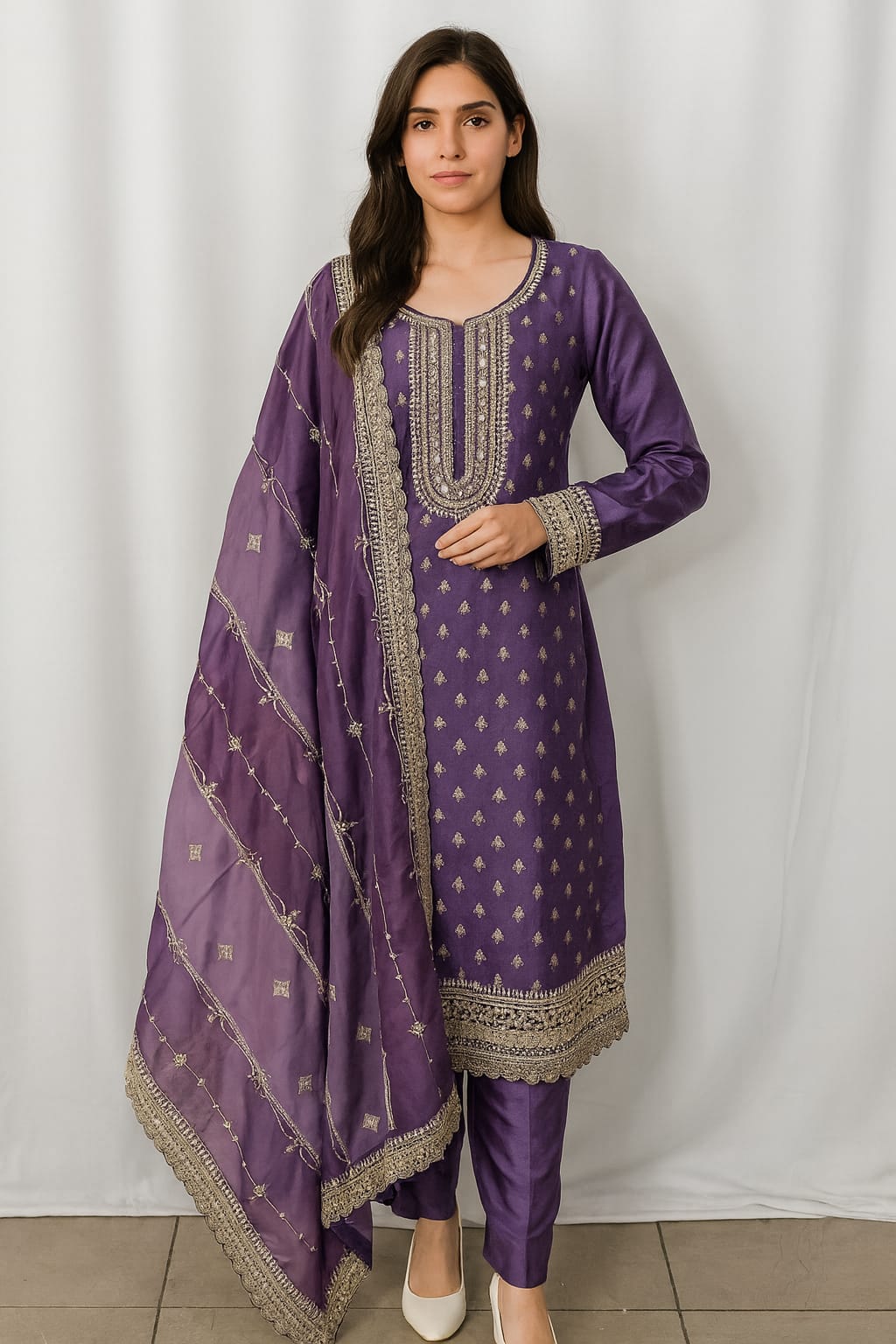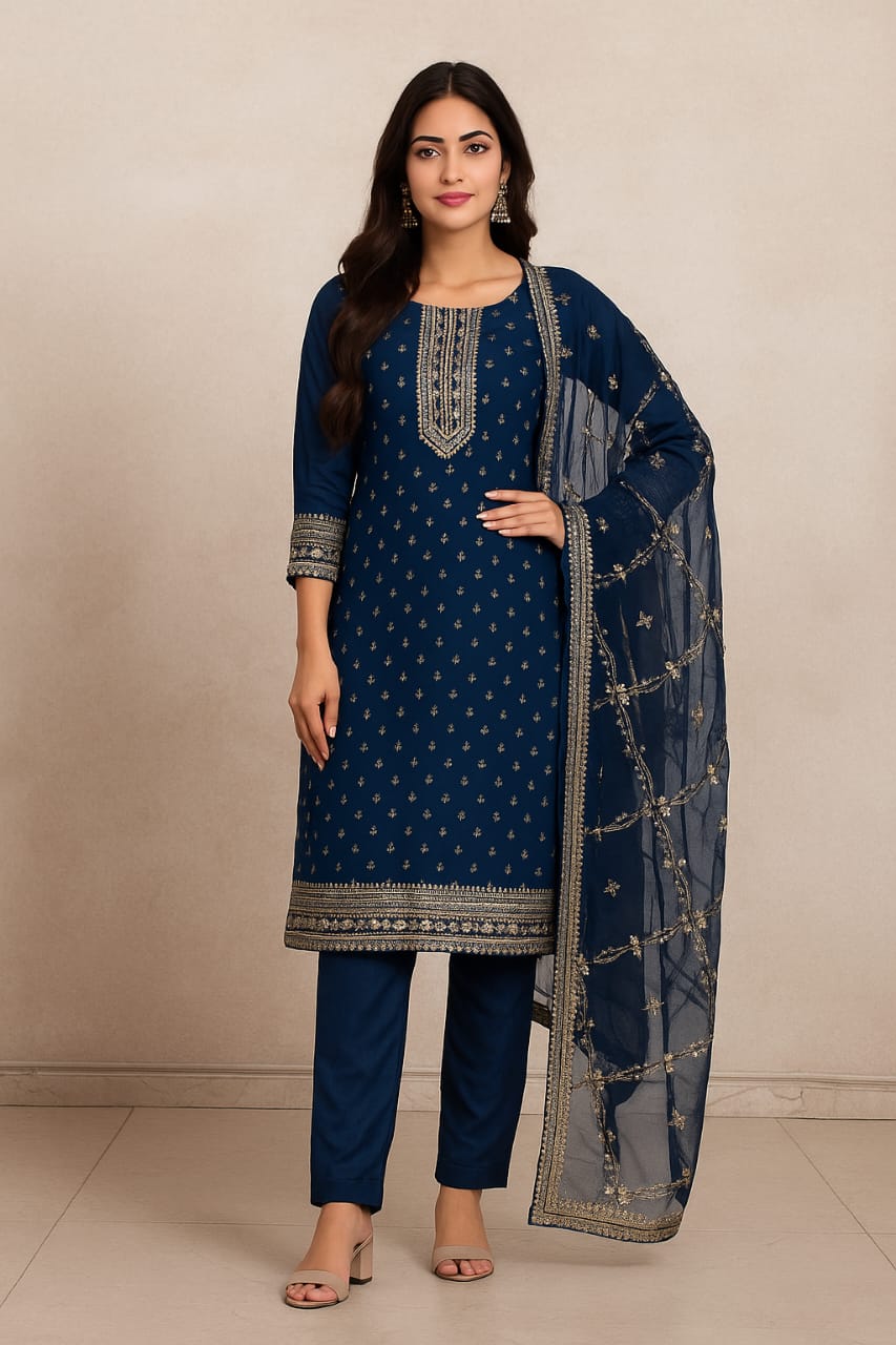 Step into timeless sophistication with this elegant navy blue embroidered kurta set. Adorned with intricate golden threadwork and delicate motifs, this ensemble beautifully combines classic style with contemporary appeal. Paired with straight-fit pants and a matching embroidered dupatta, it’s perfect for festive occasions, weddings, and evening gatherings.