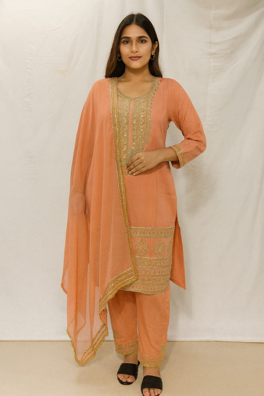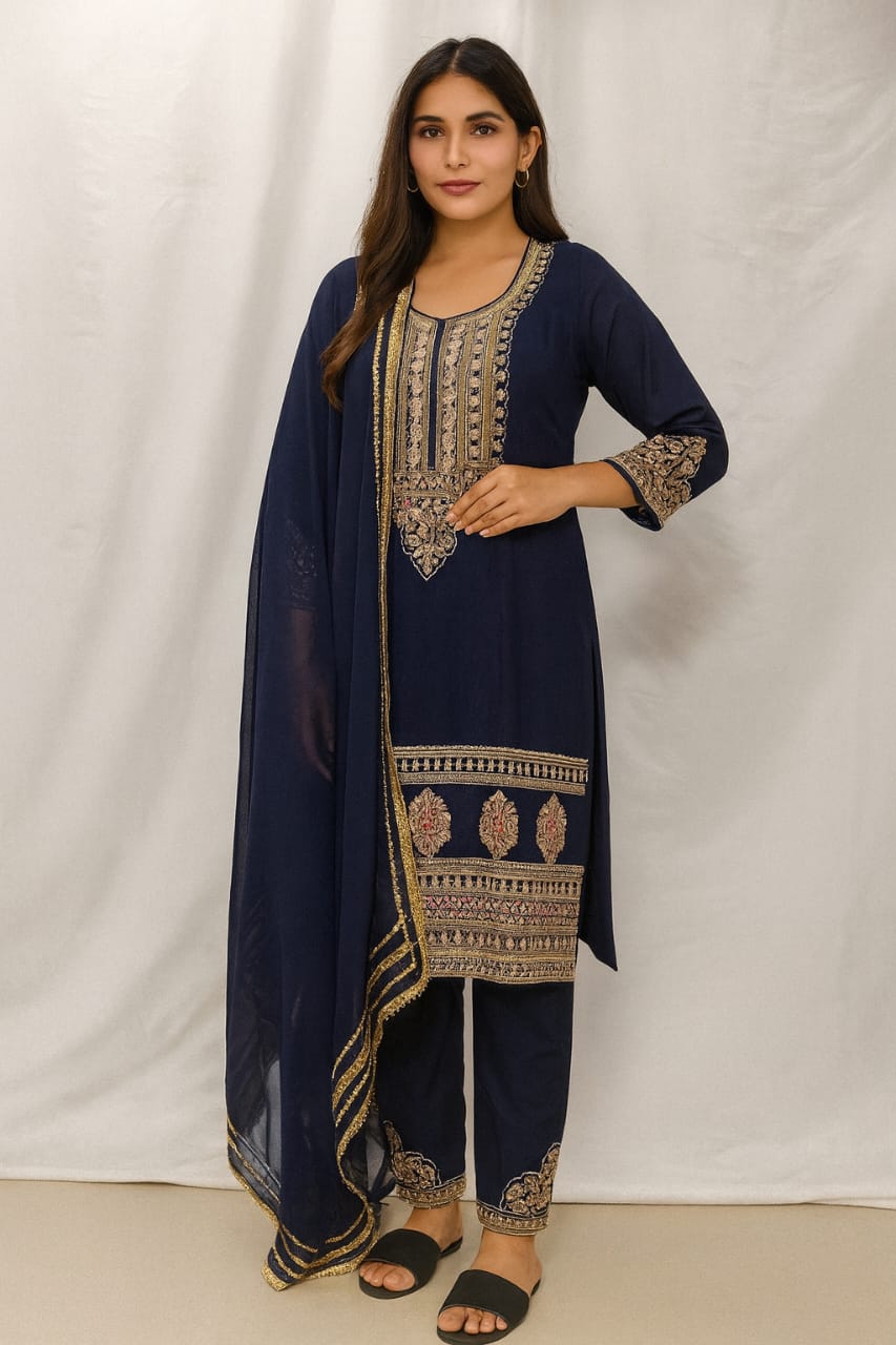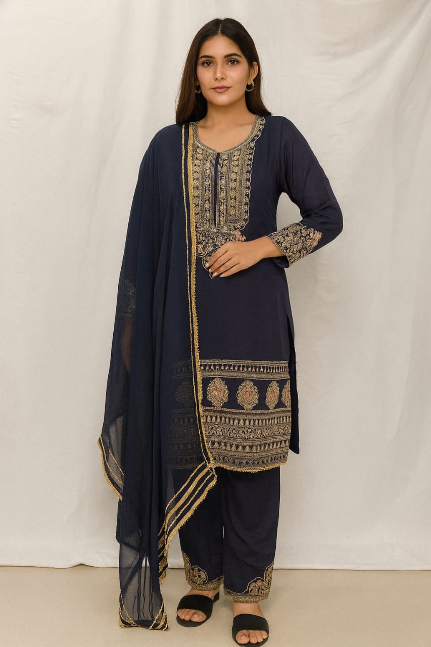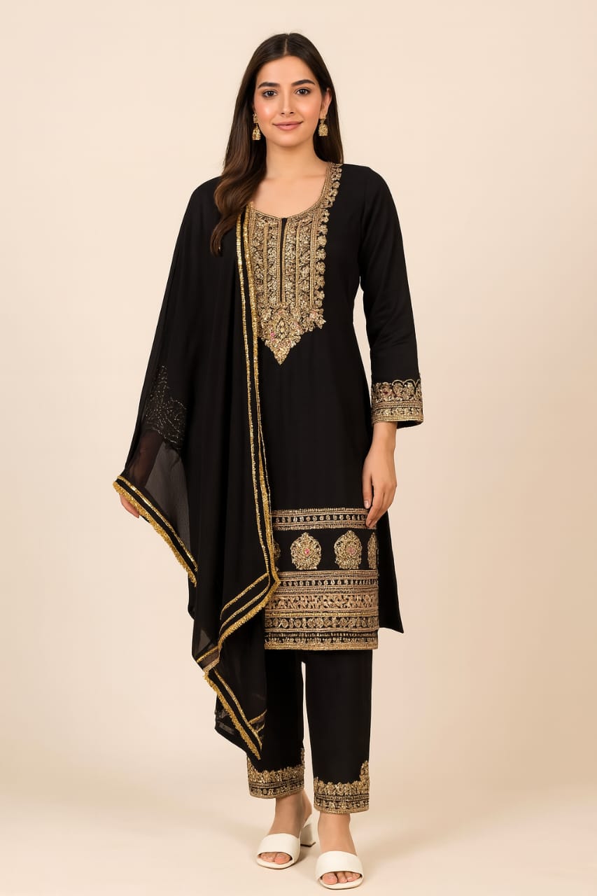 Redefine festive sophistication with this Embroidered Silk Suit Set, a masterpiece of elegance available in Navy Blue, Black, and Peach shades — each exuding its own regal charm.
