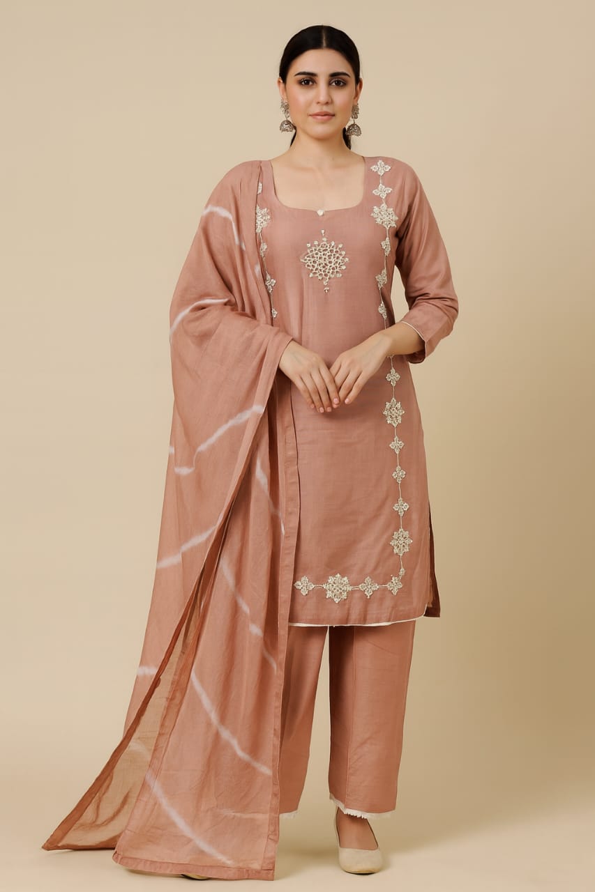 A beautifully embroidered peach-toned ethnic suit set that exudes effortless elegance. Perfect for festive gatherings, family functions, or semi-formal events. Style it with silver jhumkas and heels for a refined and graceful ethnic appearance.