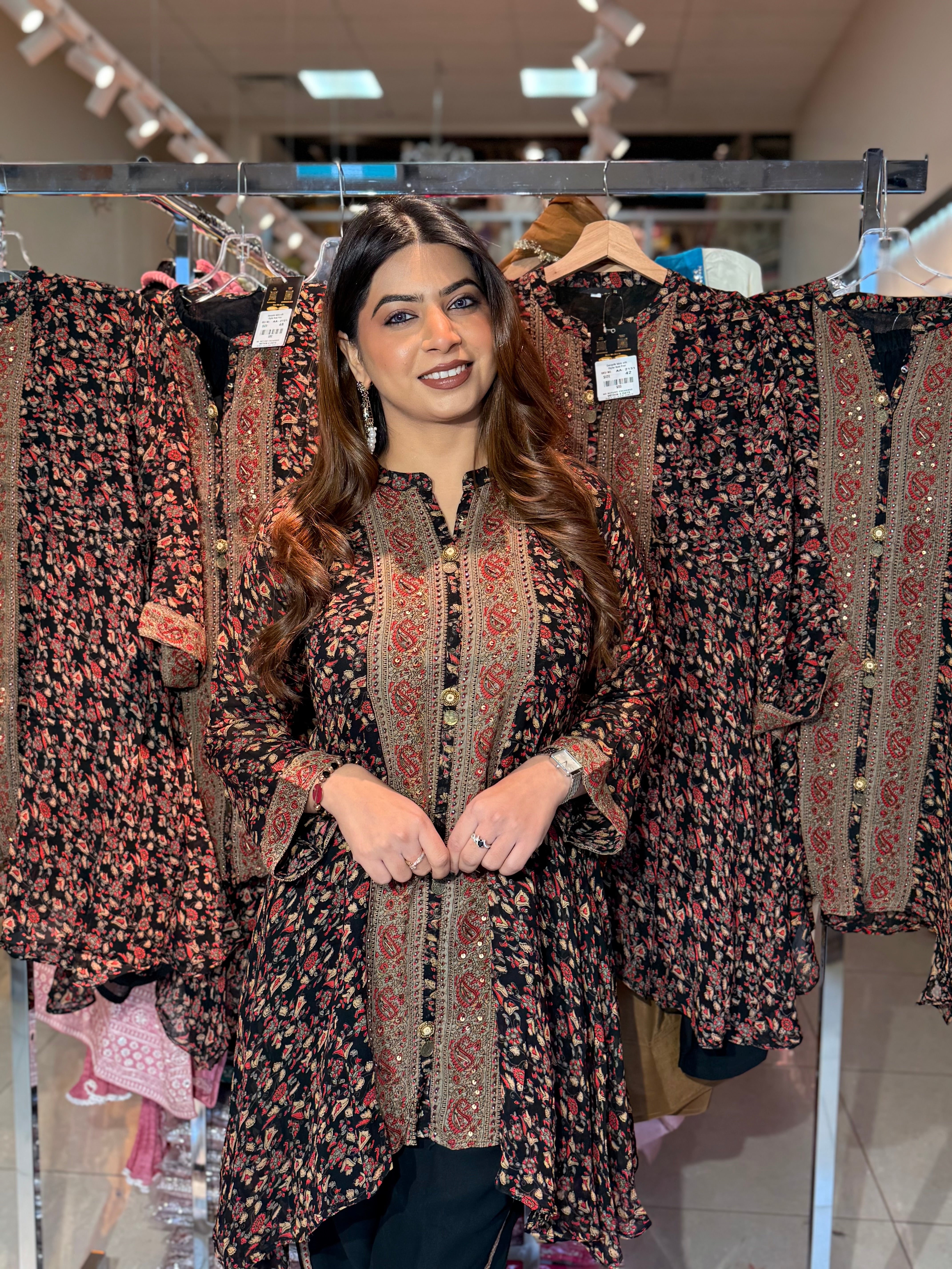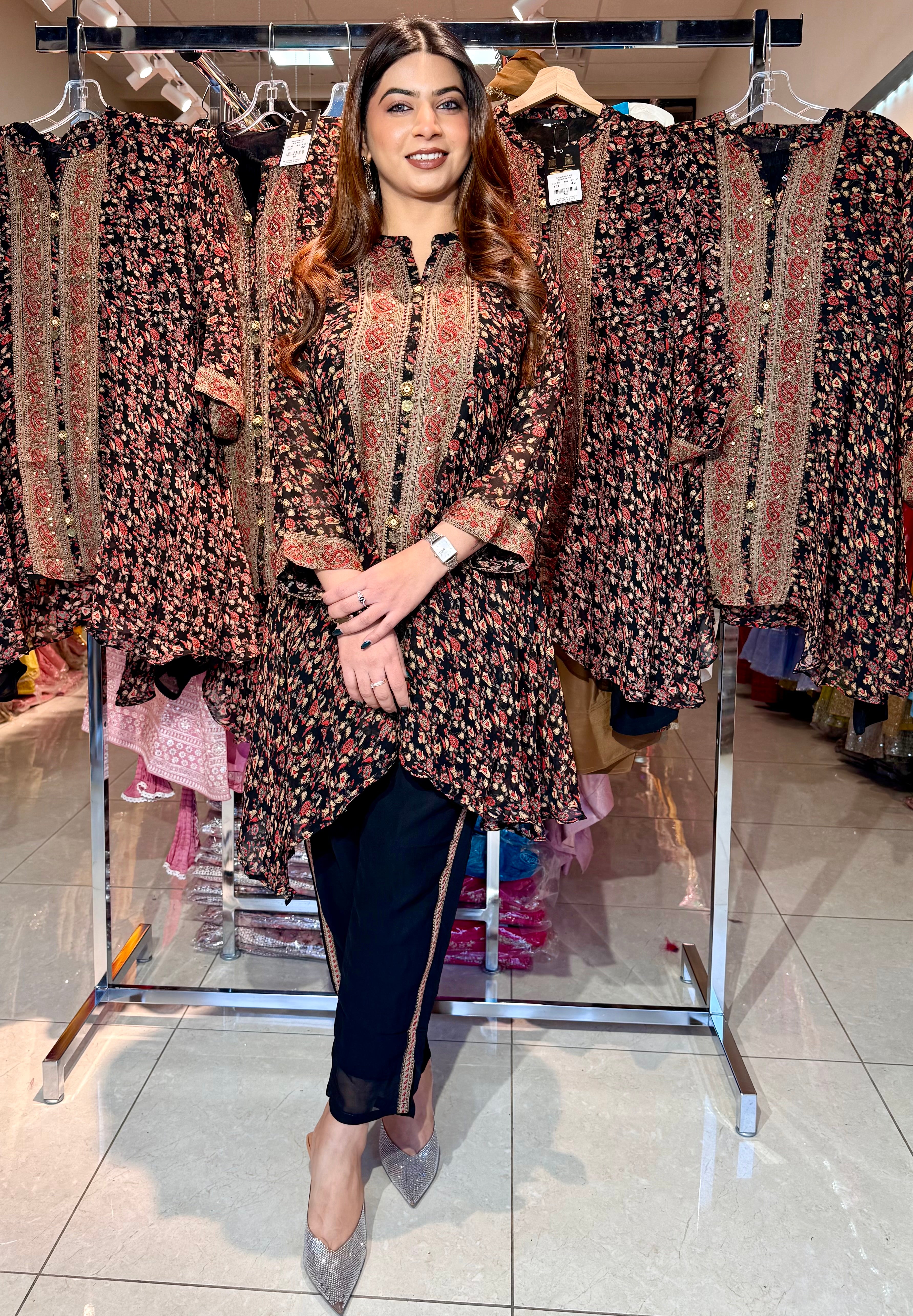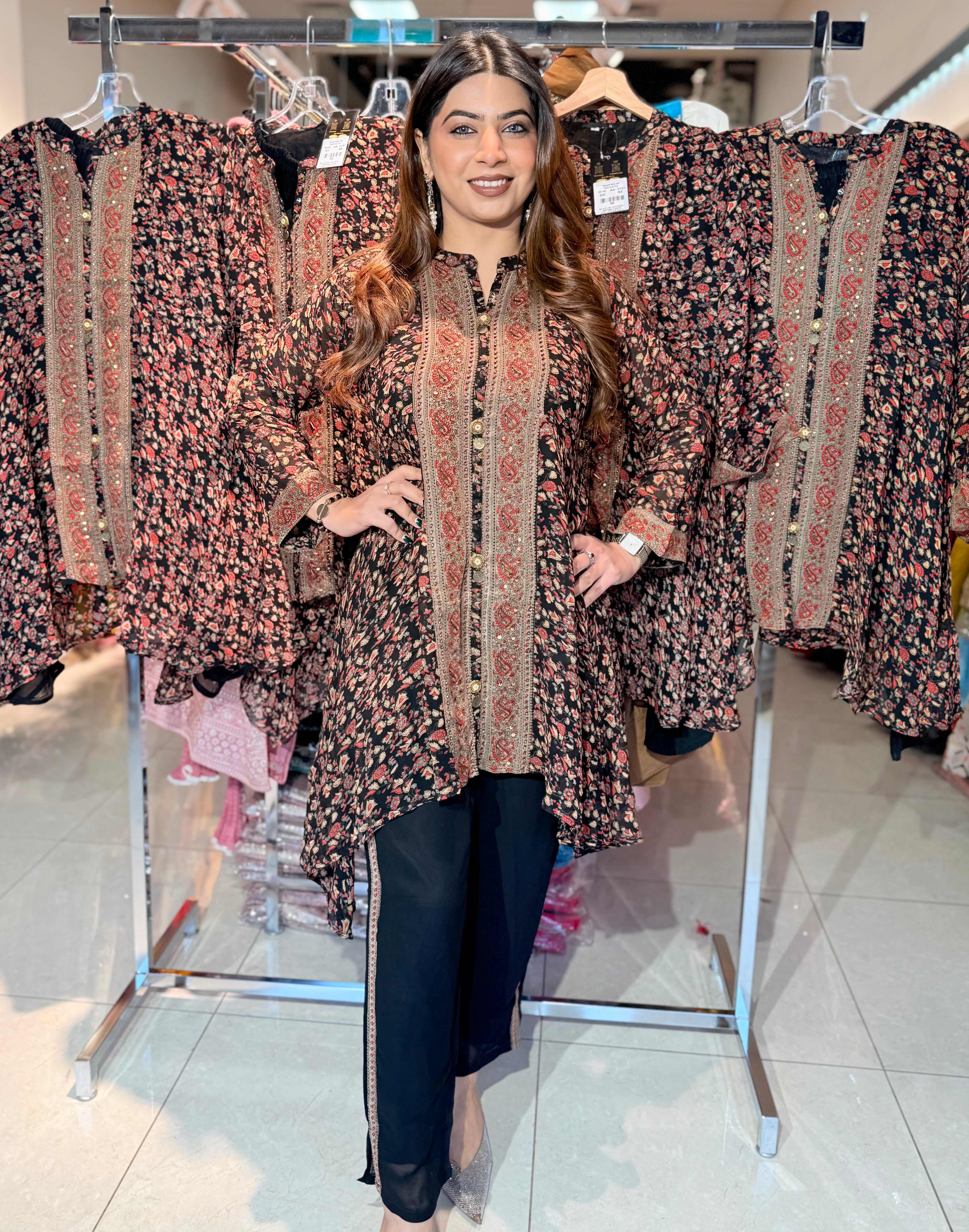 Step out in effortless style with this chic black floral printed kurta set. Designed with an asymmetrical hemline and front panel embroidery, this outfit combines contemporary fashion with ethnic charm. The breathable fabric and elegant detailing make it perfect for casual outings, festive wear, or work gatherings.