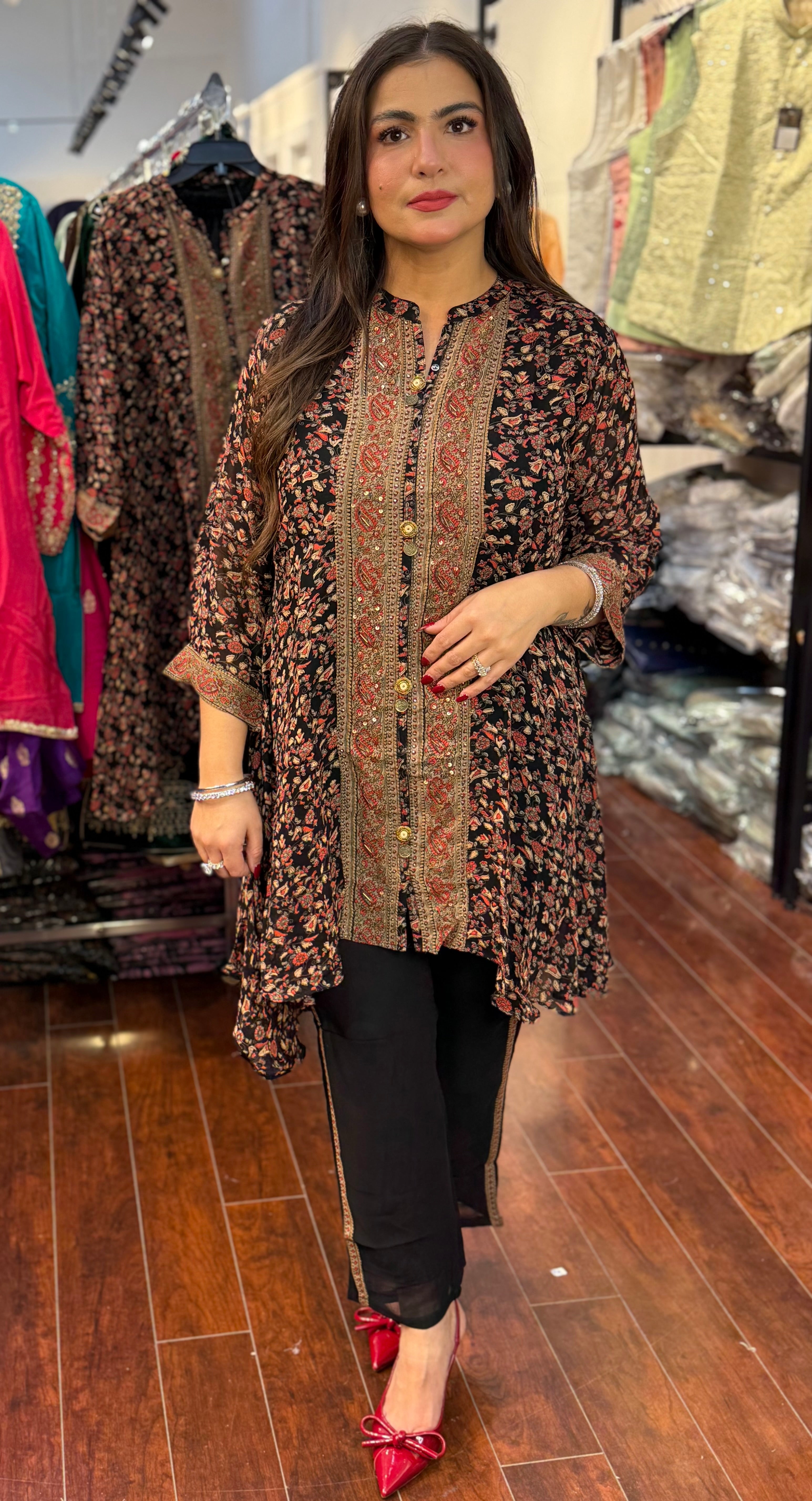 Step out in effortless style with this chic black floral printed kurta set. Designed with an asymmetrical hemline and front panel embroidery, this outfit combines contemporary fashion with ethnic charm. The breathable fabric and elegant detailing make it perfect for casual outings, festive wear, or work gatherings.