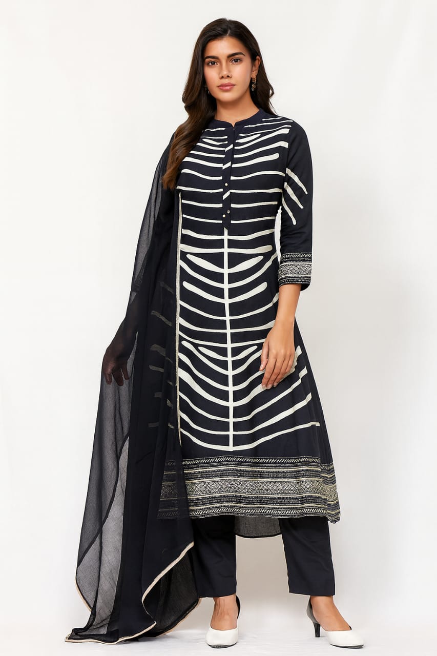 Grace your ethnic wardrobe with this elegant black and white printed kurta set. Designed with modern geometric patterns and crafted from soft cotton fabric, it offers both comfort and sophistication. The straight-cut silhouette enhances your figure while ensuring ease of movement. Paired with matching solid pants and a sheer dupatta, this ensemble is perfect for office wear, festive gatherings, or casual outings.
