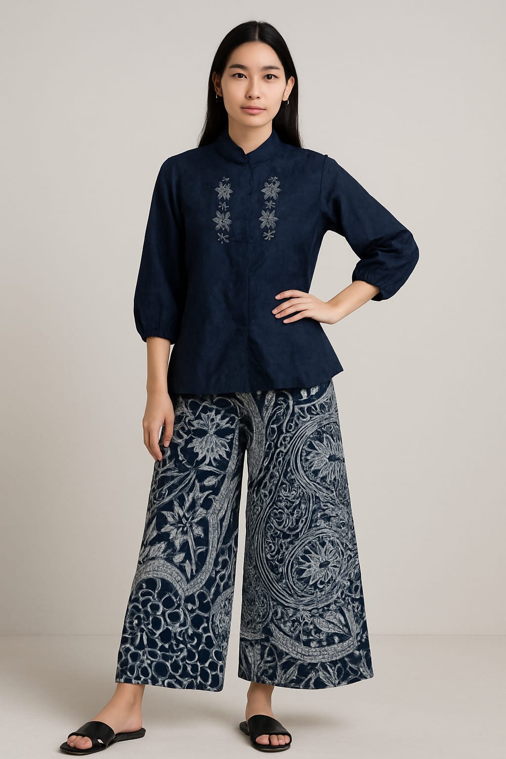 Effortlessly stylish and comfortable, this navy blue embroidered co-ord set blends contemporary minimalism with handcrafted charm.