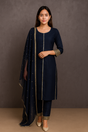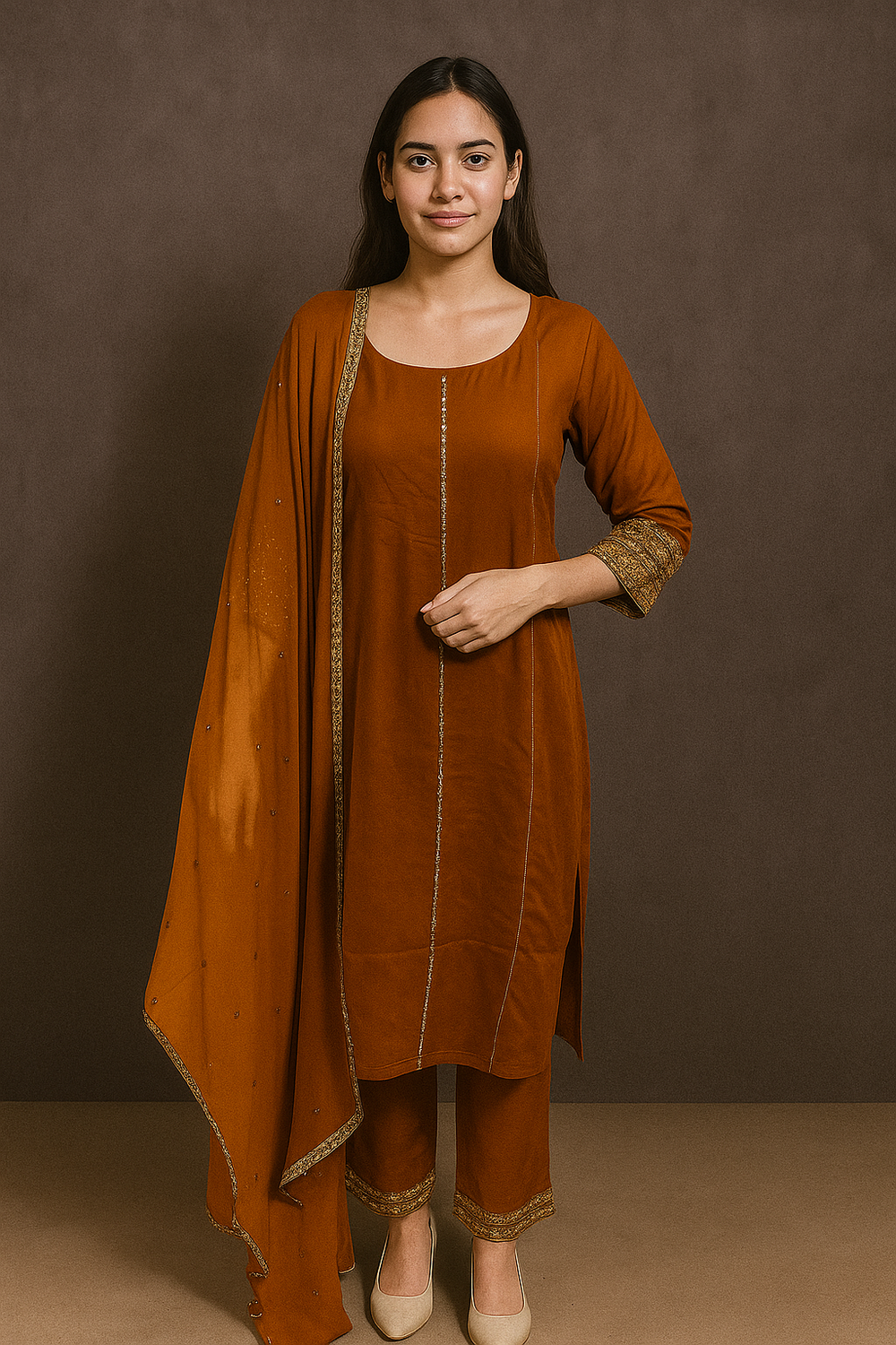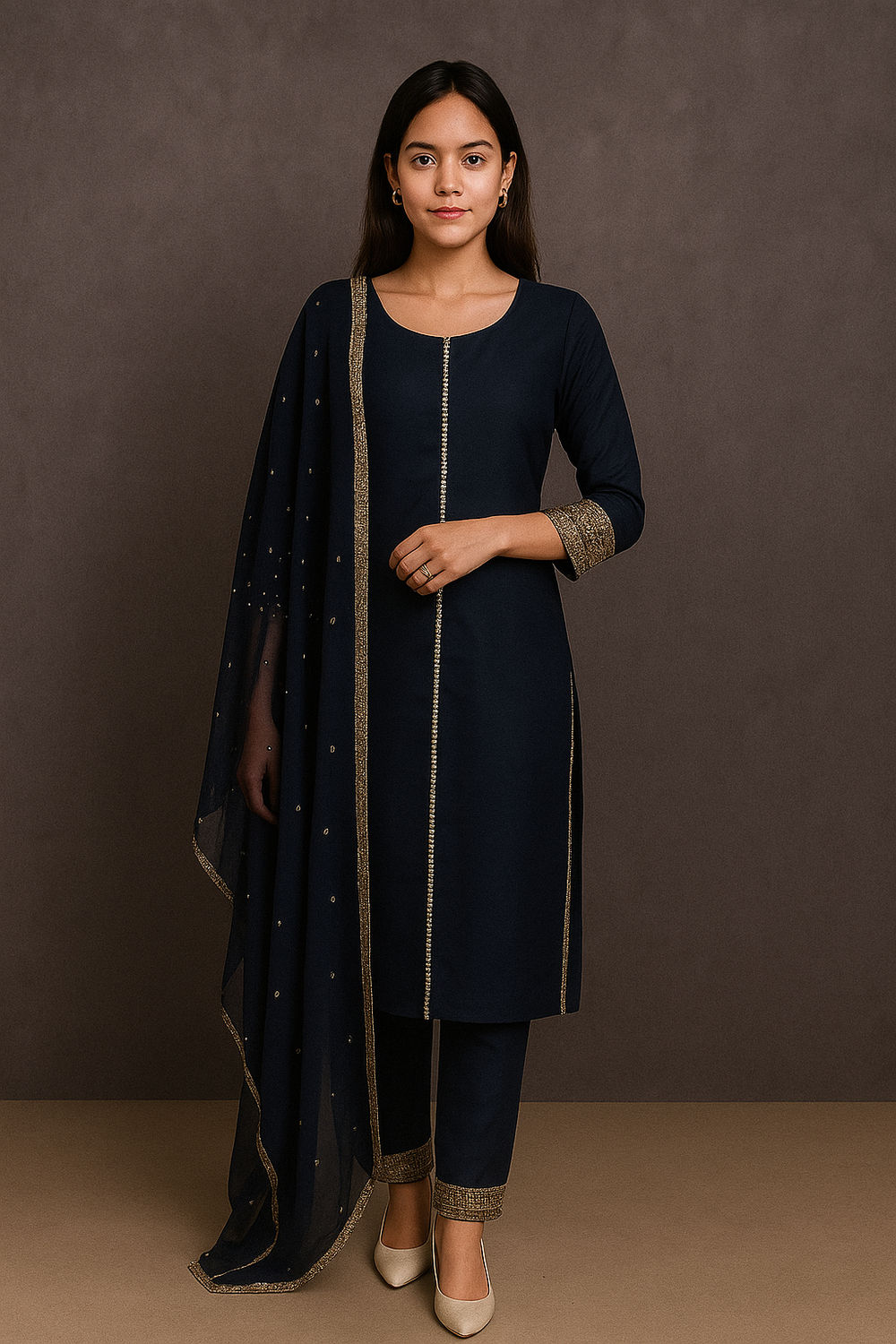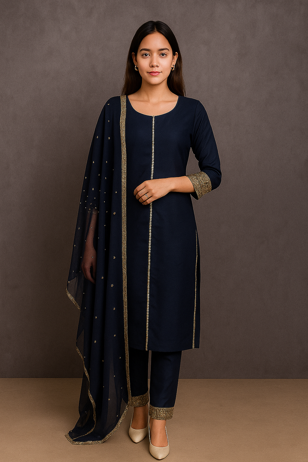 Step into effortless elegance with this stunning three-piece kurta set, perfect for festive gatherings and evening occasions. Crafted from premium silk blend fabric, this outfit combines modern sophistication with traditional grace. The kurta features delicate hand-embroidered gota and sequin detailing, creating a rich yet understated look. Paired with matching straight pants and a beautifully bordered chiffon dupatta, this ensemble ensures timeless charm and comfort.