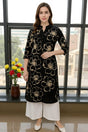 Add a touch of elegance to your everyday style with this black floral printed straight kurti. Crafted from soft, breathable rayon fabric, this kurti offers a perfect blend of comfort and sophistication. The bold beige floral print adds a modern edge to its traditional silhouette, while the mandarin collar with button-down front lends a refined, contemporary appeal. Pair it with palazzos or straight pants for a chic and versatile look.