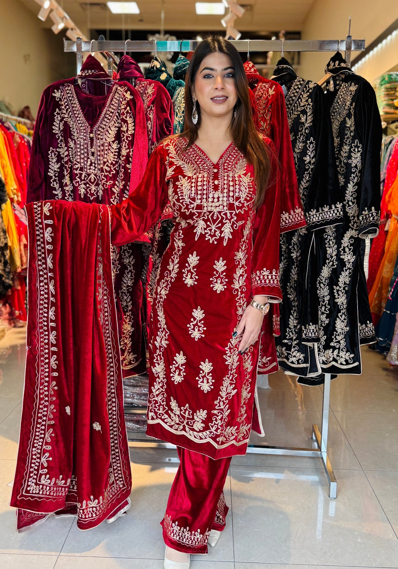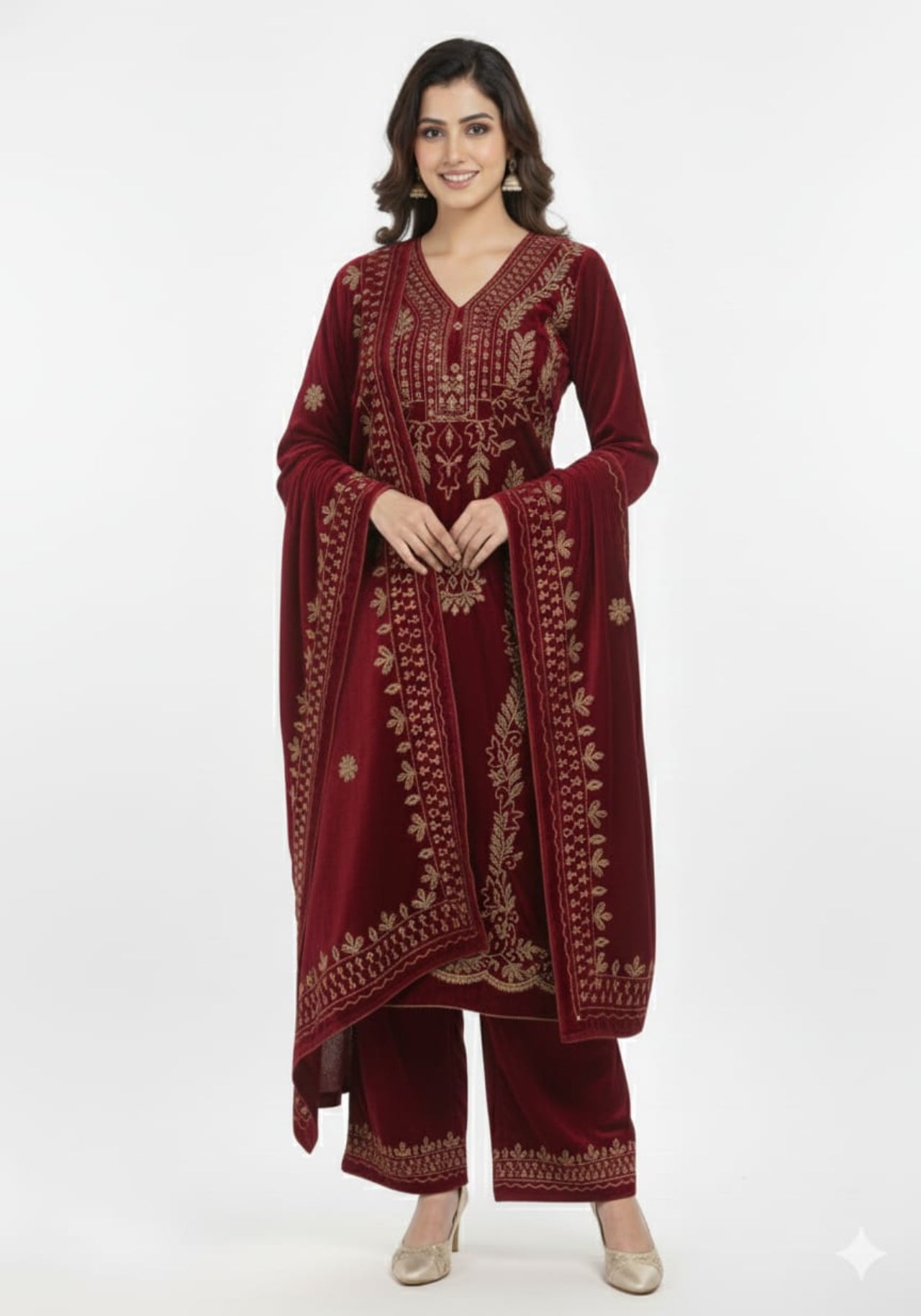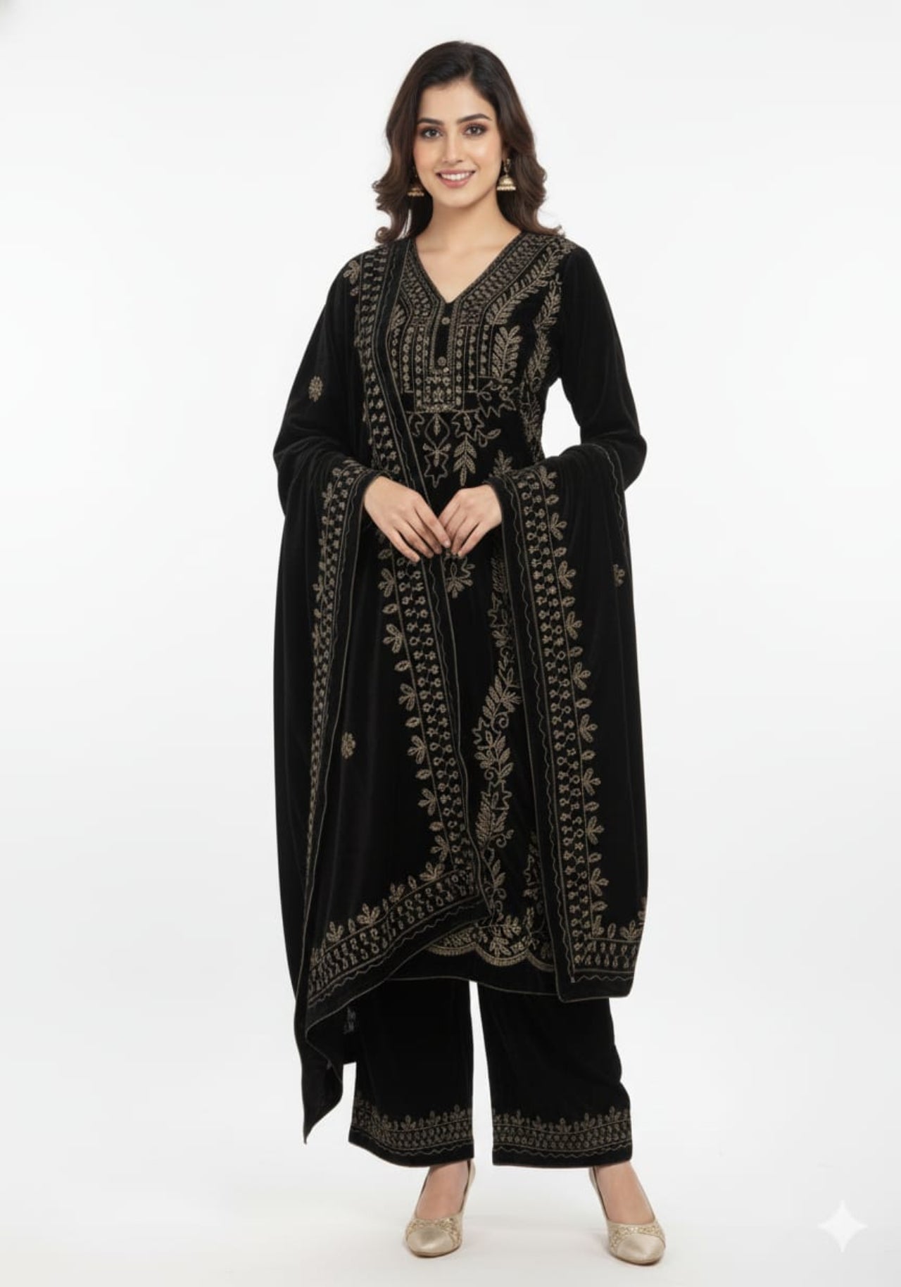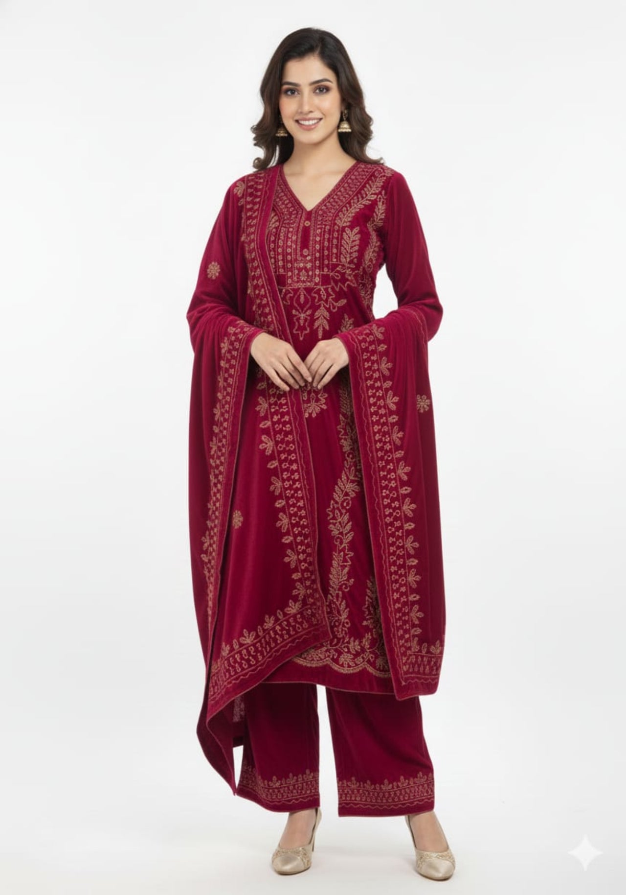 This luxurious velvet suit set is designed to give a royal and festive look with maximum comfort during winter gatherings. Crafted with rich golden embroidery on a soft velvet base, the outfit comes with a beautifully embroidered dupatta and matching palazzo, making it a complete ethnic ensemble for special occasions.