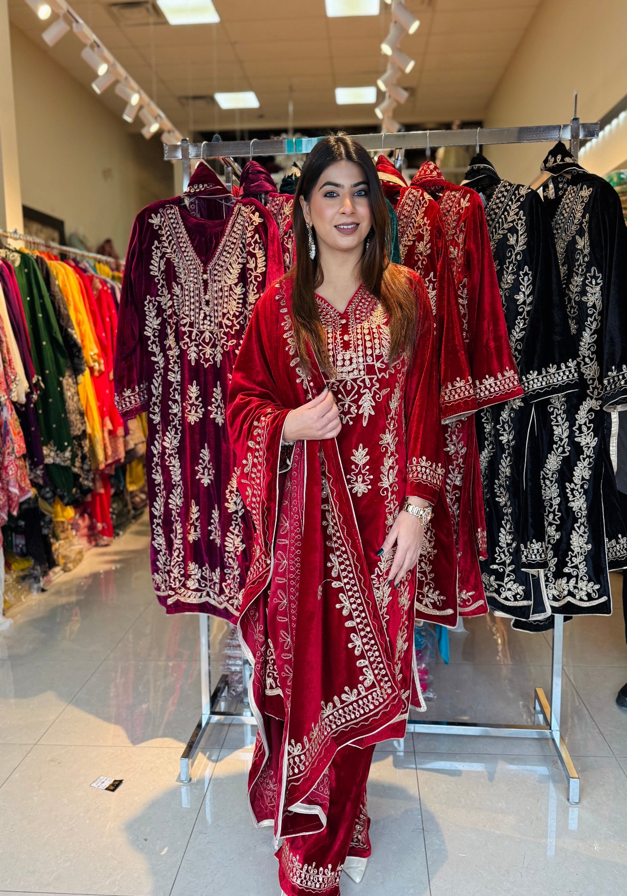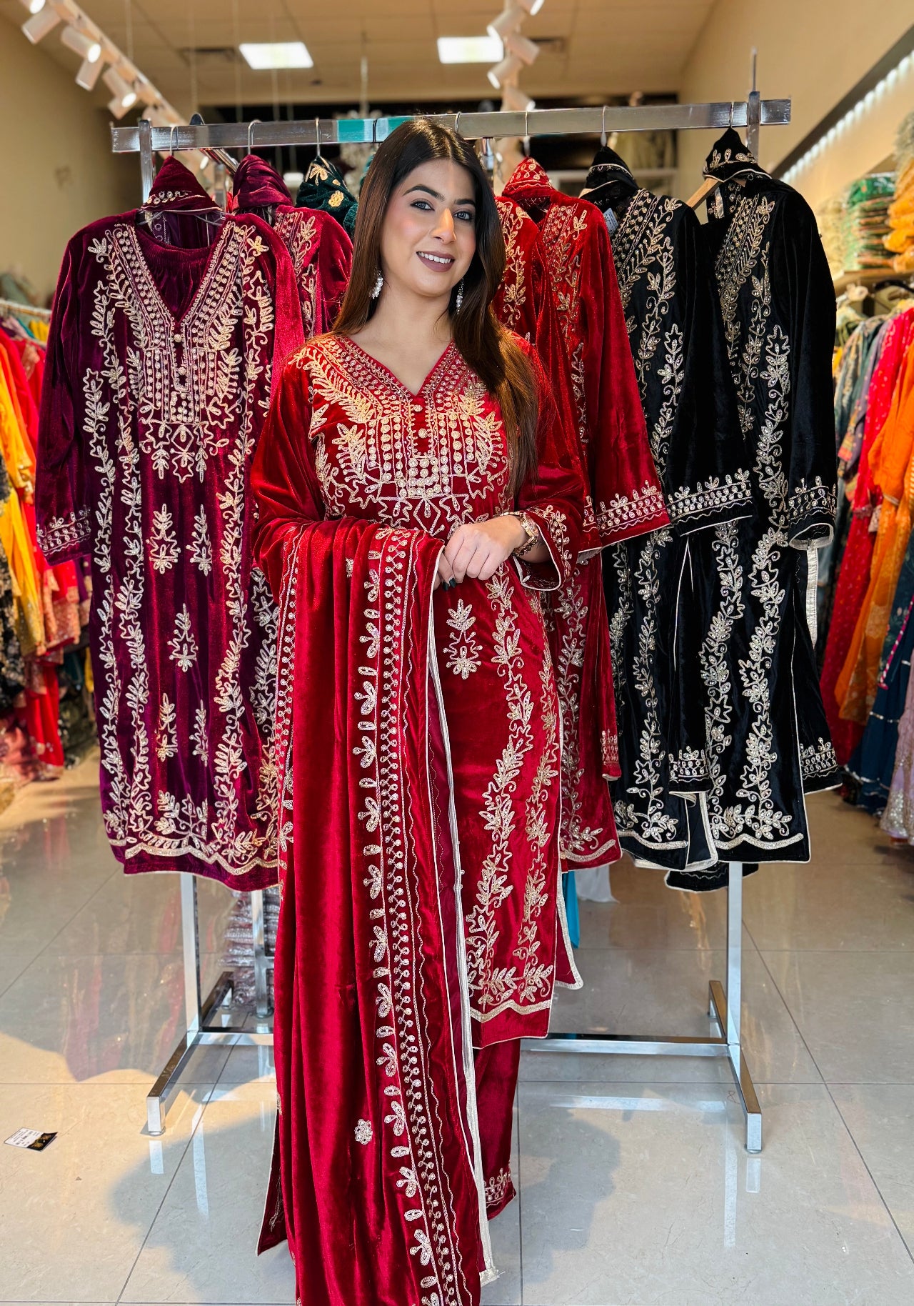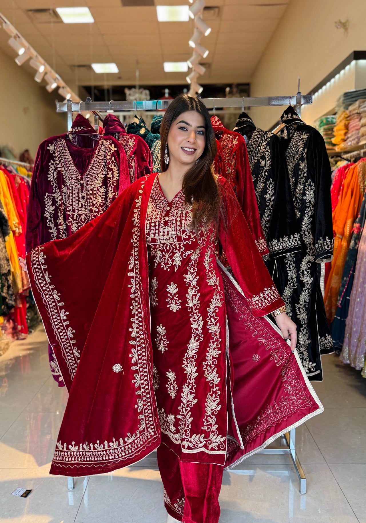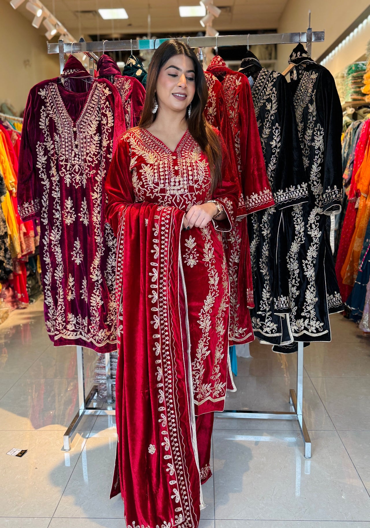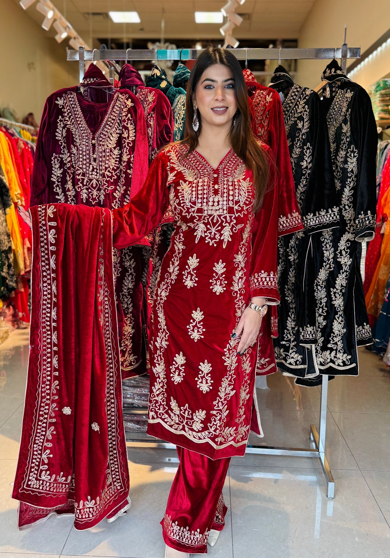 This luxurious velvet suit set is designed to give a royal and festive look with maximum comfort during winter gatherings. Crafted with rich golden embroidery on a soft velvet base, the outfit comes with a beautifully embroidered dupatta and matching palazzo, making it a complete ethnic ensemble for special occasions.