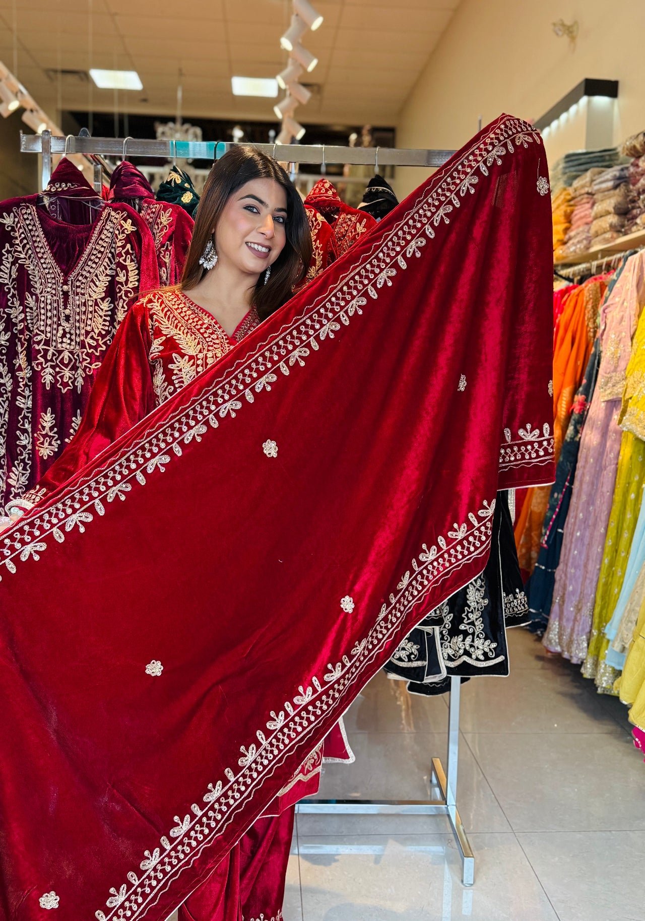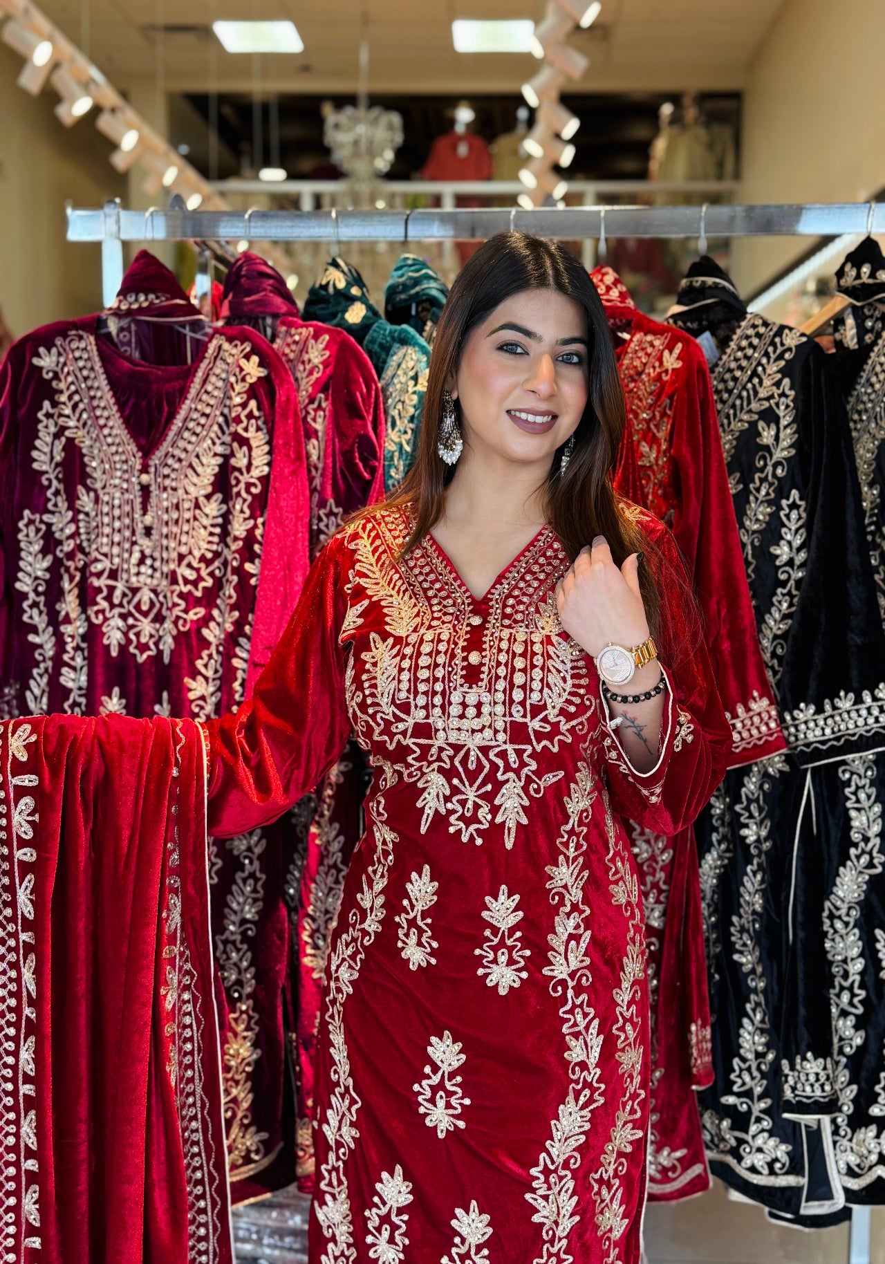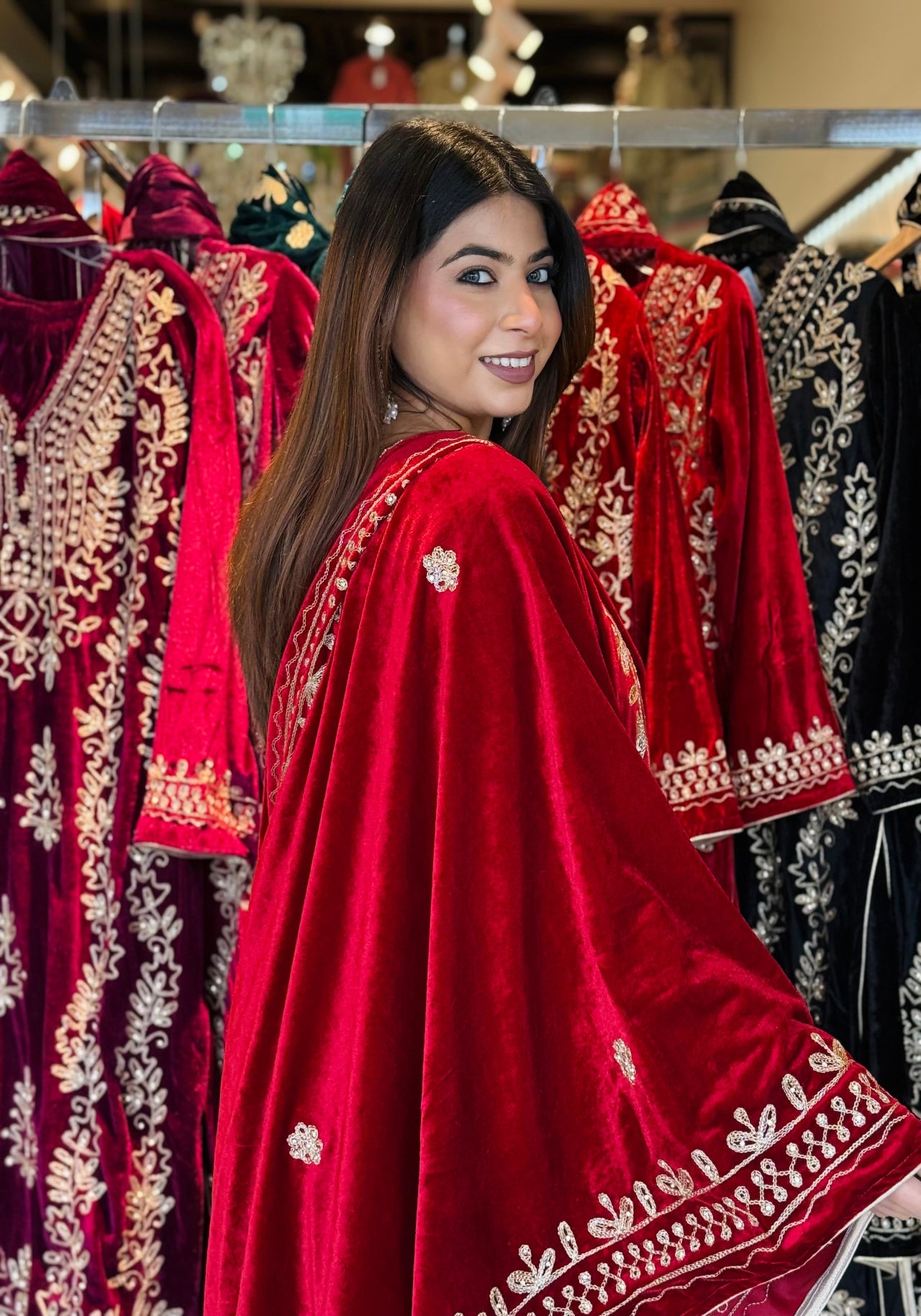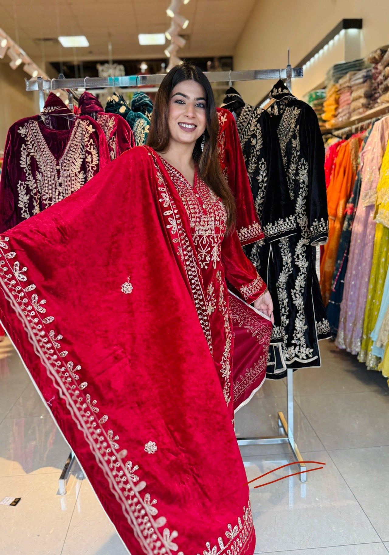 This luxurious velvet suit set is designed to give a royal and festive look with maximum comfort during winter gatherings. Crafted with rich golden embroidery on a soft velvet base, the outfit comes with a beautifully embroidered dupatta and matching palazzo, making it a complete ethnic ensemble for special occasions.