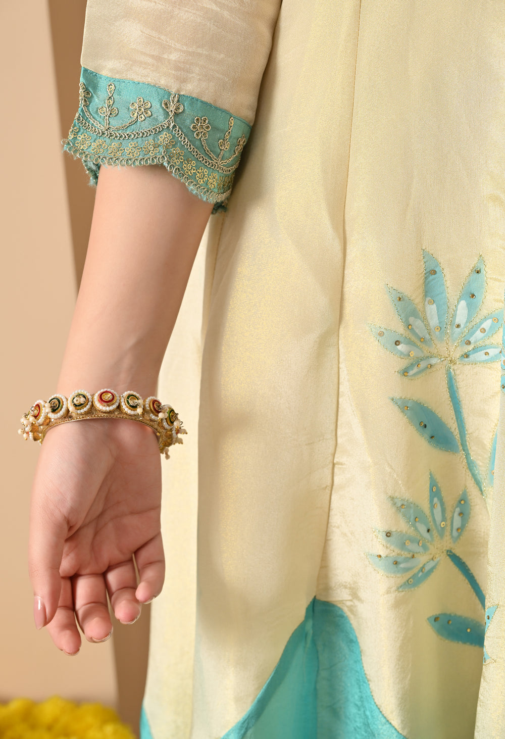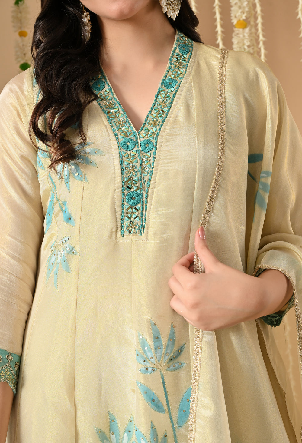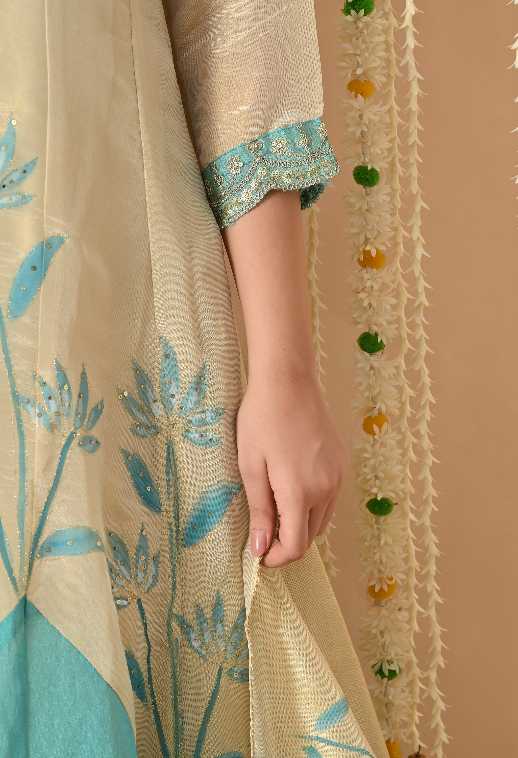 Ethereal elegance comes alive in the Aqua Nargis Kalidaar, a radiant ivory suit adorned with serene aqua blue embroidery. Crafted in a luxurious organza-silk blend, this flowing kalidaar silhouette features delicate floral motifs blooming from the hem upward. The aqua blue flare adds a refreshing contrast, while the intricately embroidered neckline and cuffs add richness to the look. Finished with a sheer dupatta and scalloped detailing, this ensemble is your perfect pick for daytime poojas, or Rakshabandhan celebrations.