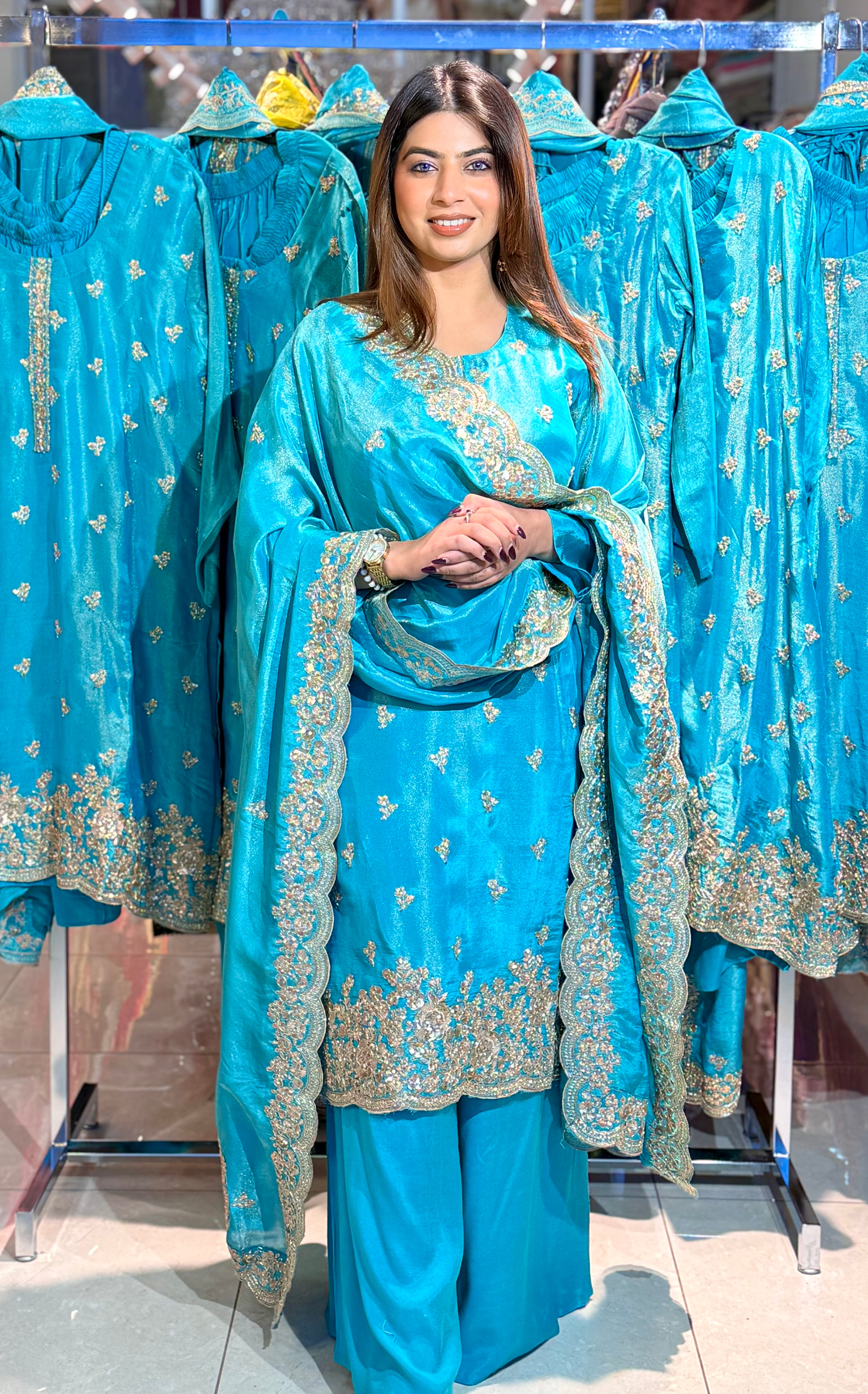 Step into graceful sophistication with Azure Bloom — a stunning Shimmer silk ensemble in a serene turquoise hue. Intricately adorned with delicate golden threadwork and elegant embellishments, this outfit is your perfect pick for festive brunches, Eid celebrations, or evening soirees. The soft sheen of the fabric and tasteful embroidery bring together timeless charm and modern poise.
