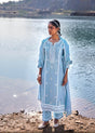 Kurta: A soothing sky-blue straight kurta made from a soft cotton blend, delicately adorned with white thread floral embroidery Matching pants Matching dupatta.
