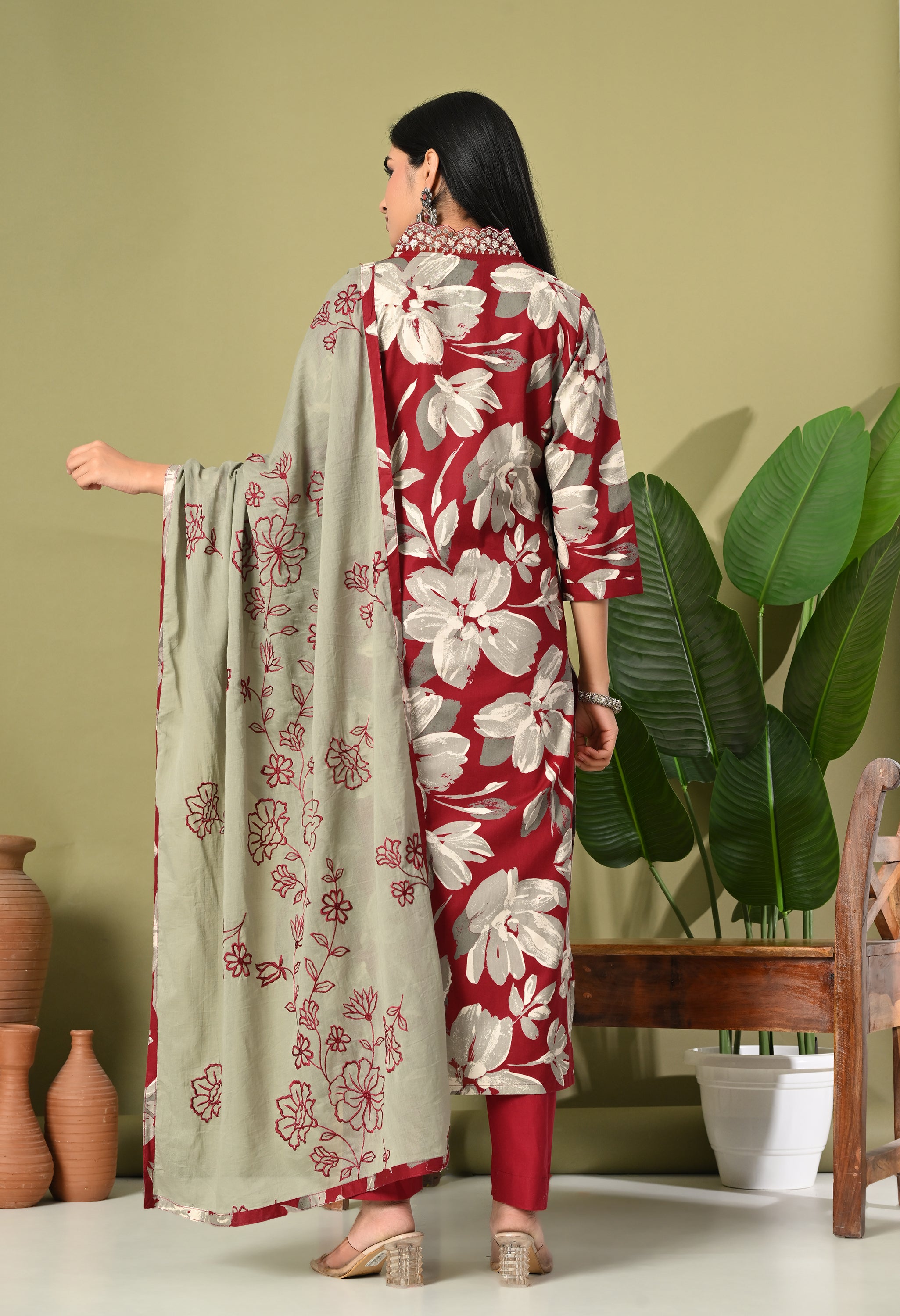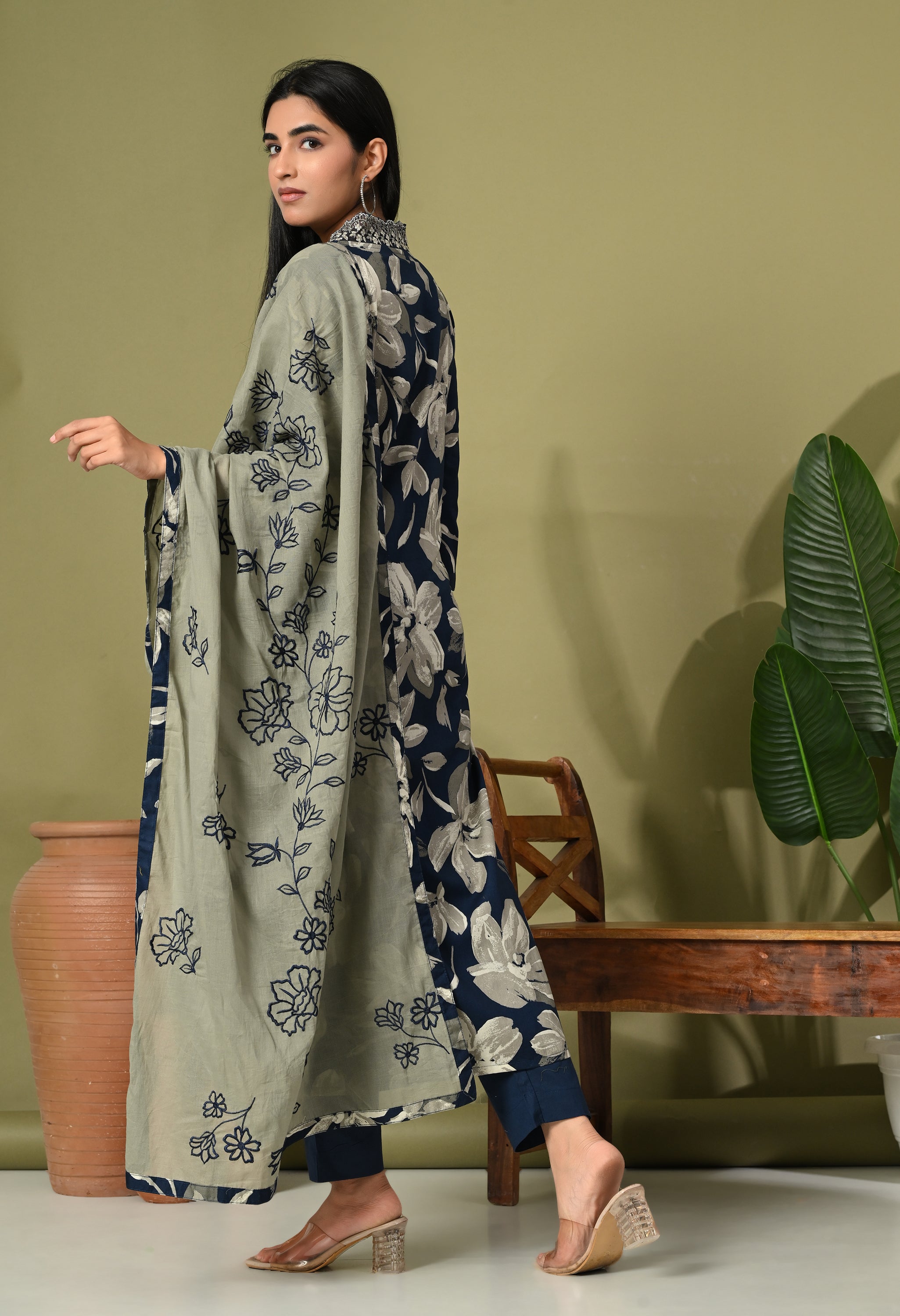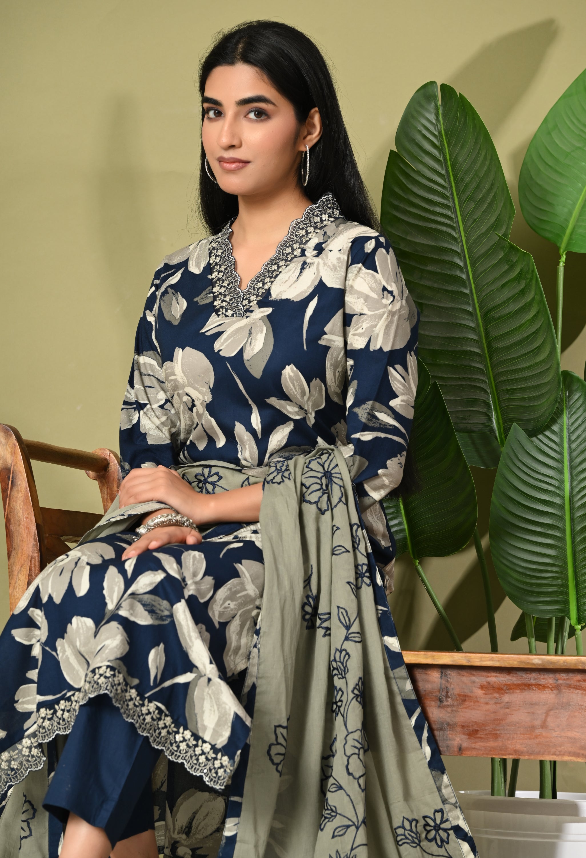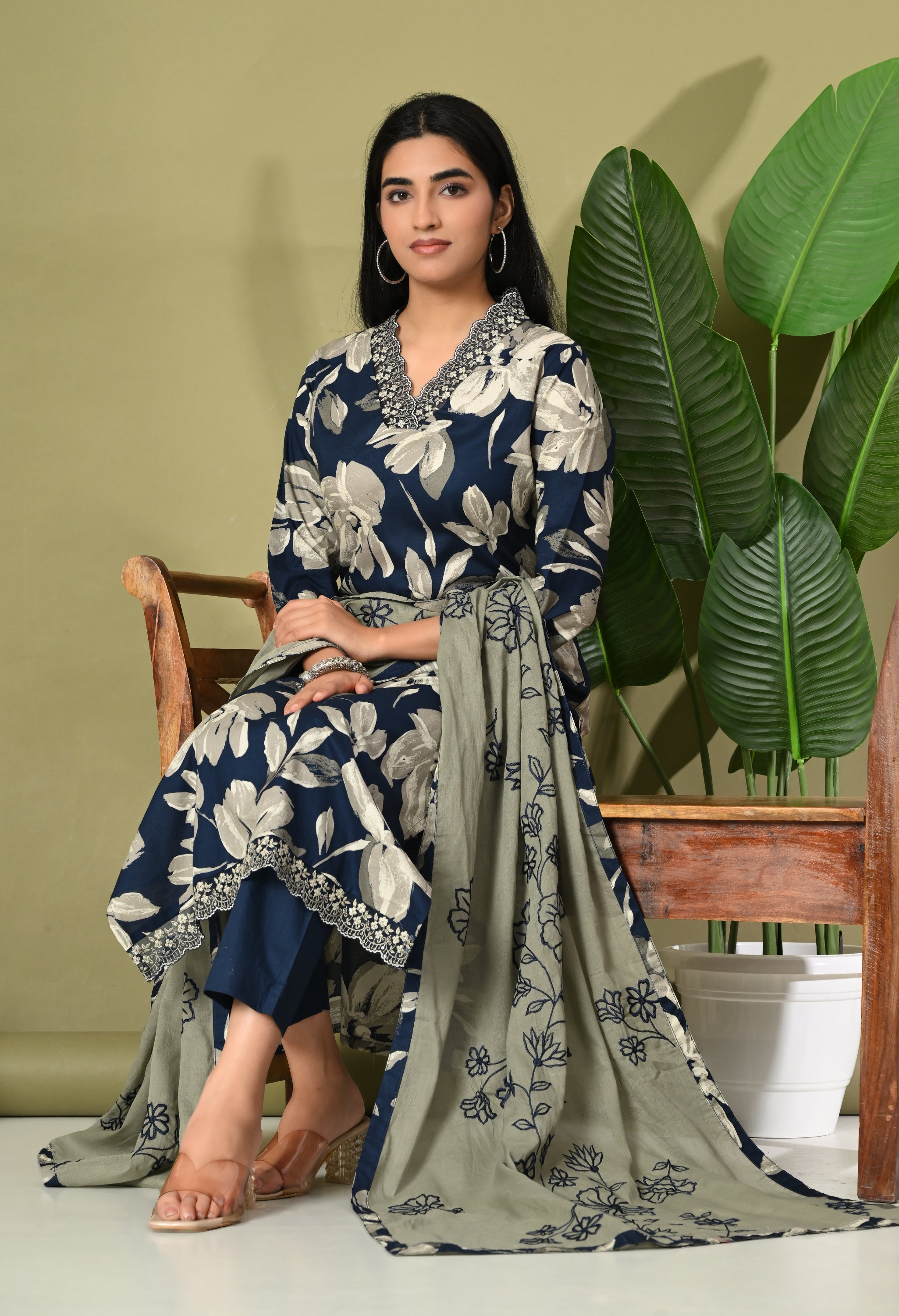 Step into timeless elegance with the Aafreen Suit, a beautiful ensemble that captures the essence of grace and modernity. This three-piece outfit features a blue and red adorned with large white floral creating a striking contrast that exudes sophistication. The kurta is tailored in a classic straight cut with a modest v neckline, perfect for both casual gatherings and formal events.