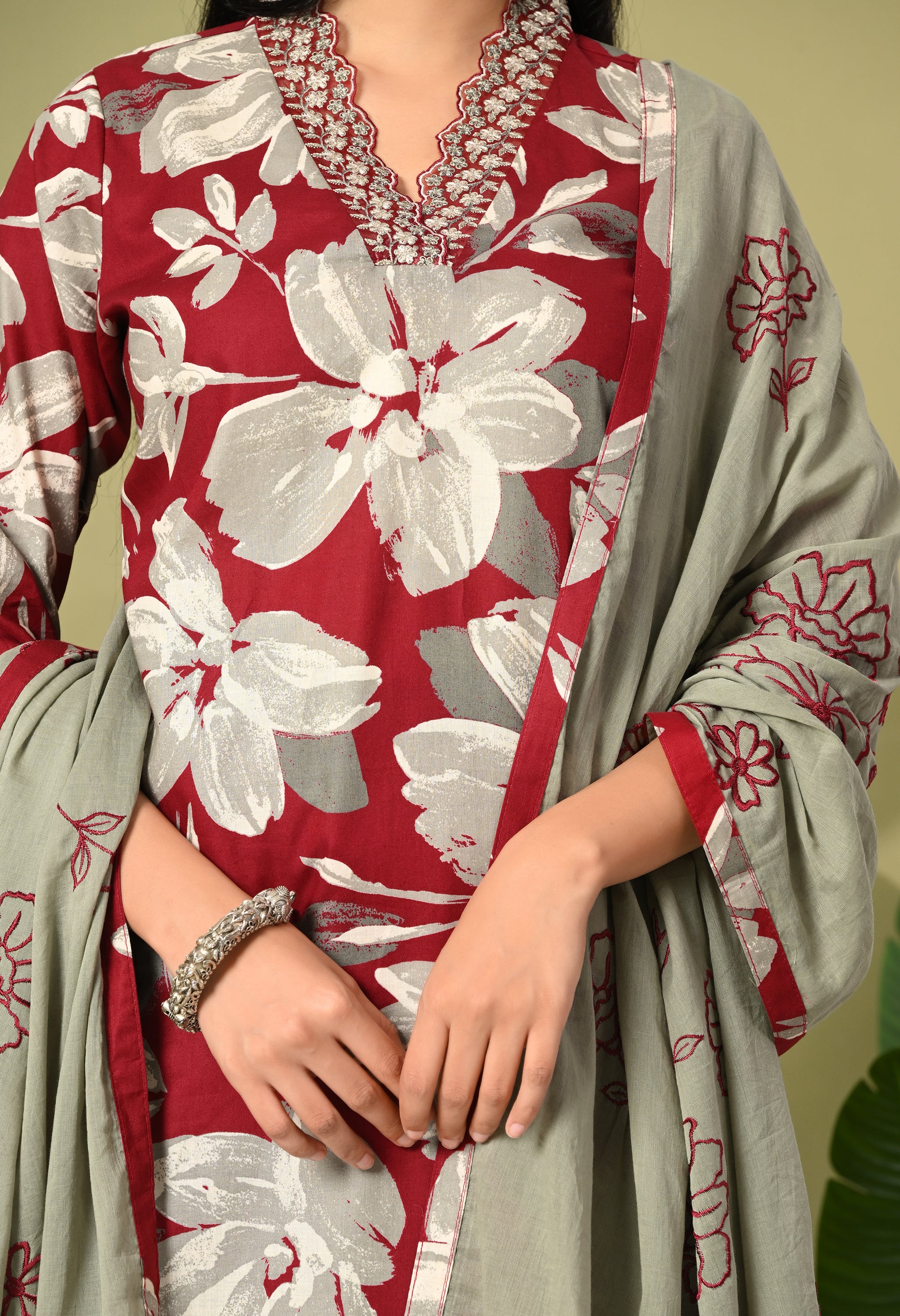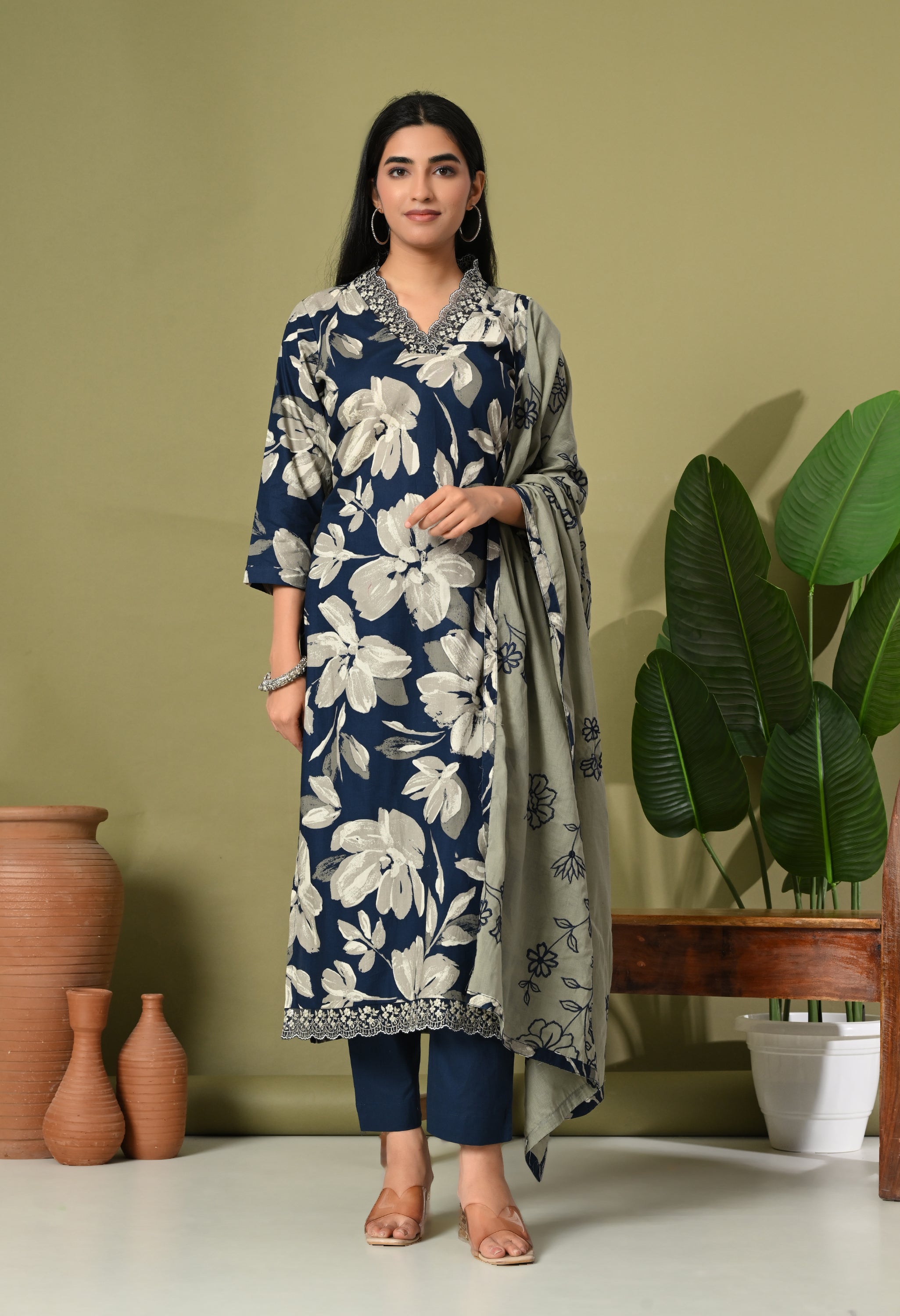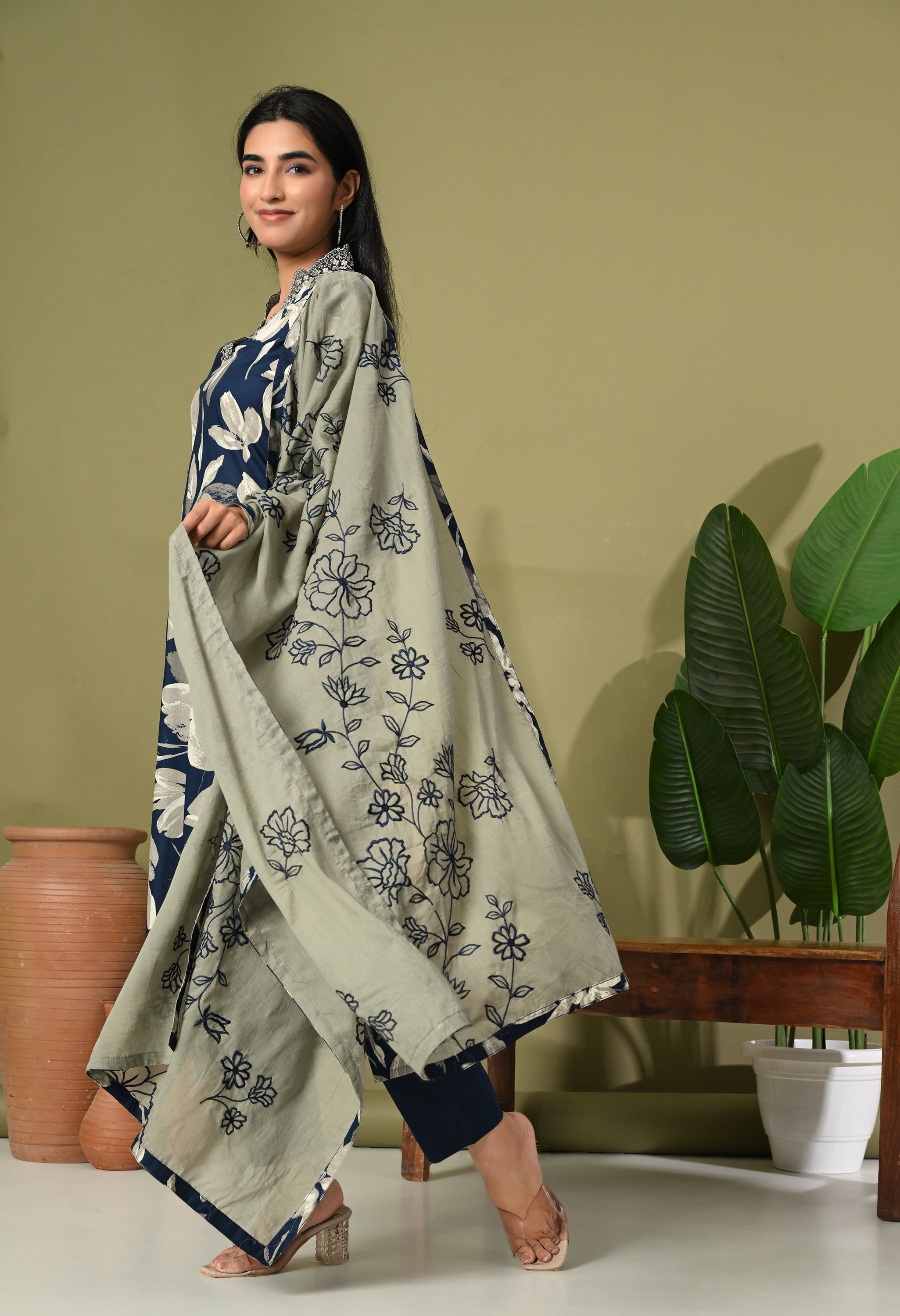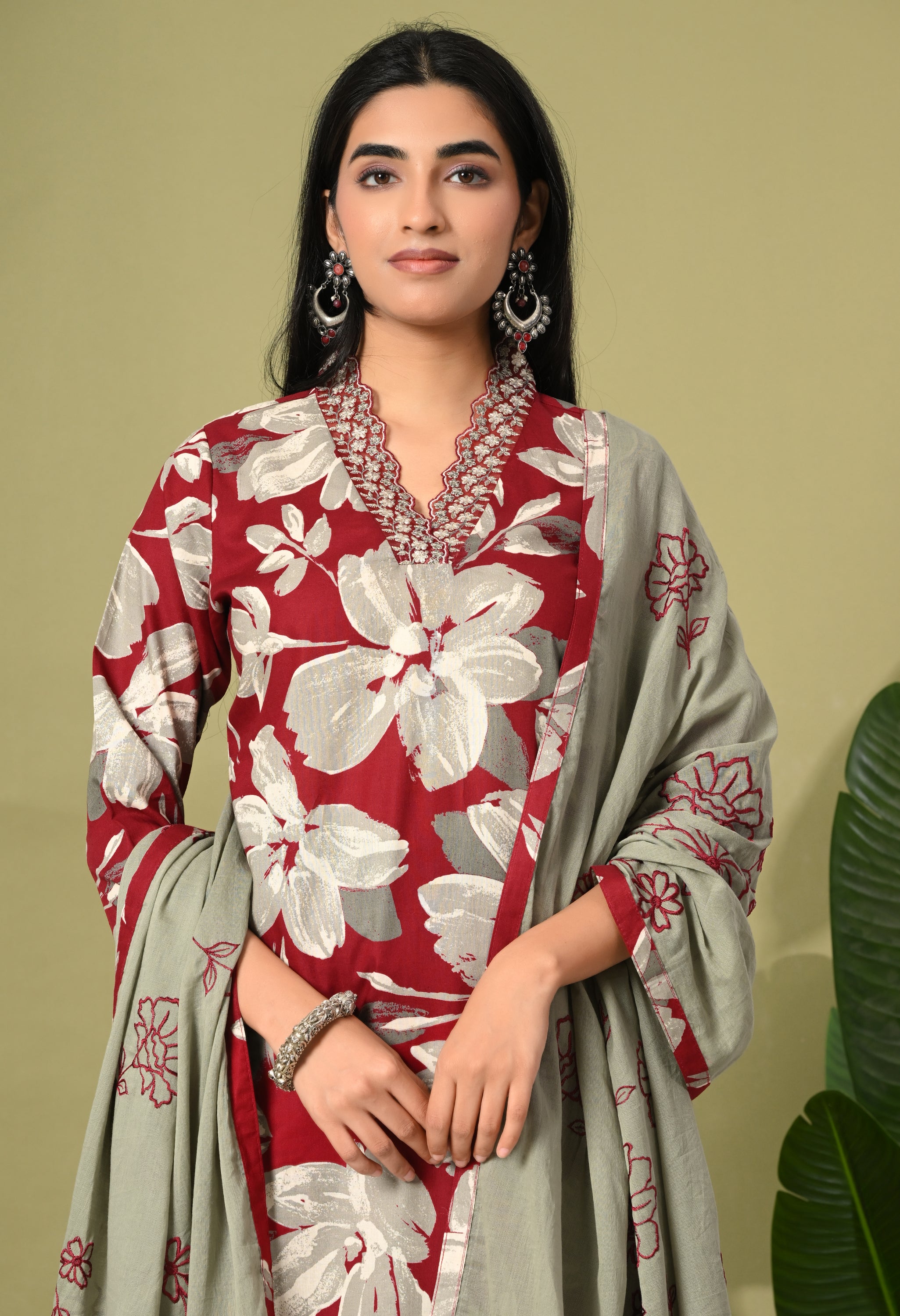 Step into timeless elegance with the Aafreen Suit, a beautiful ensemble that captures the essence of grace and modernity. This three-piece outfit features a blue and red adorned with large white floral creating a striking contrast that exudes sophistication. The kurta is tailored in a classic straight cut with a modest v neckline, perfect for both casual gatherings and formal events.