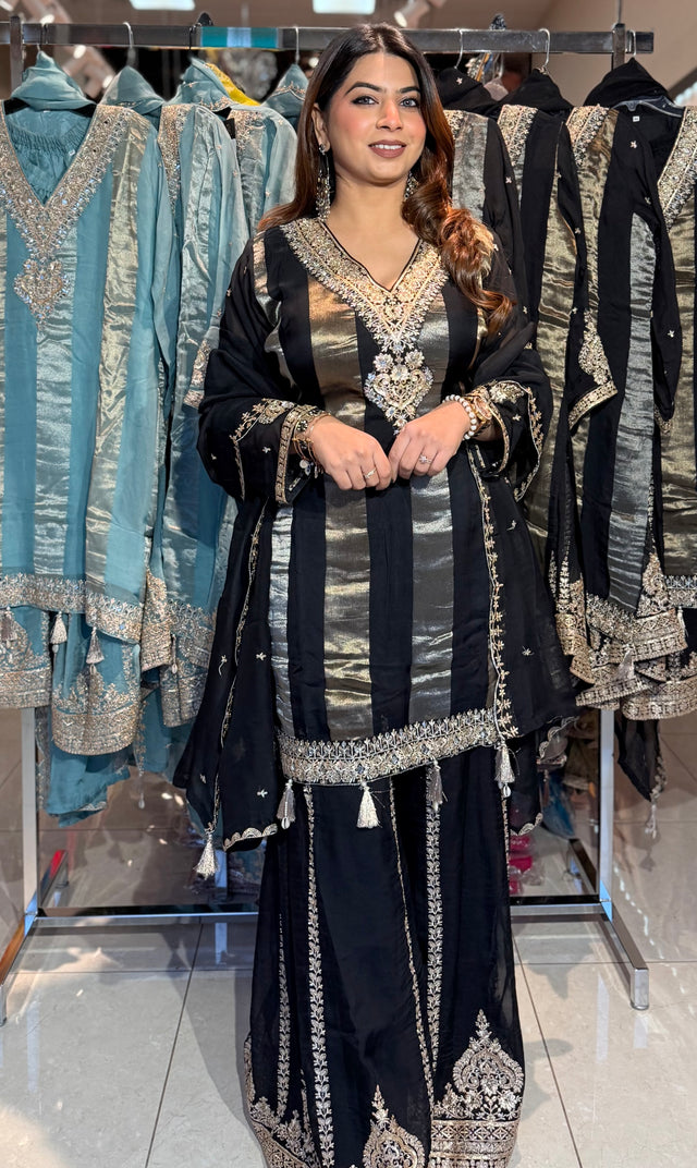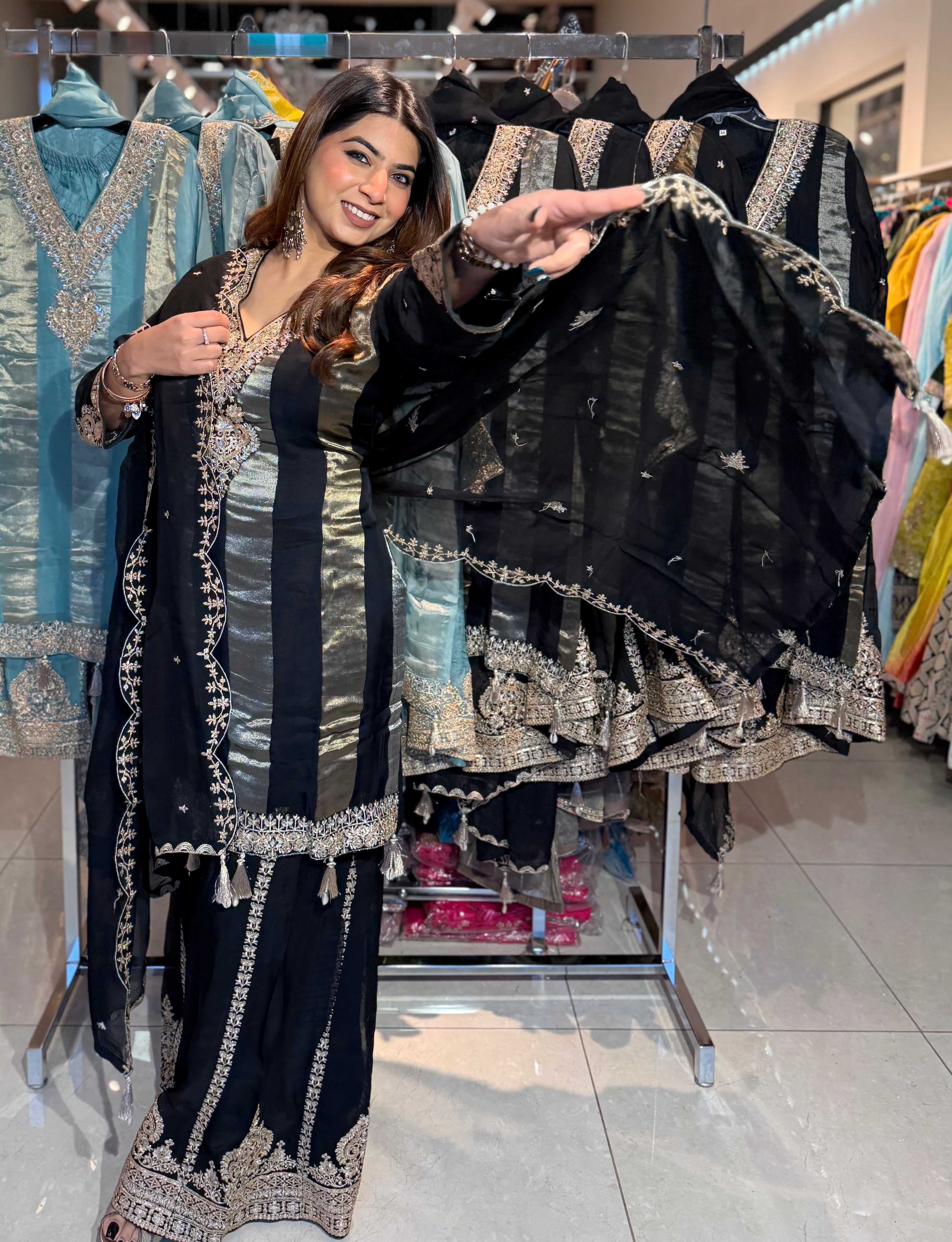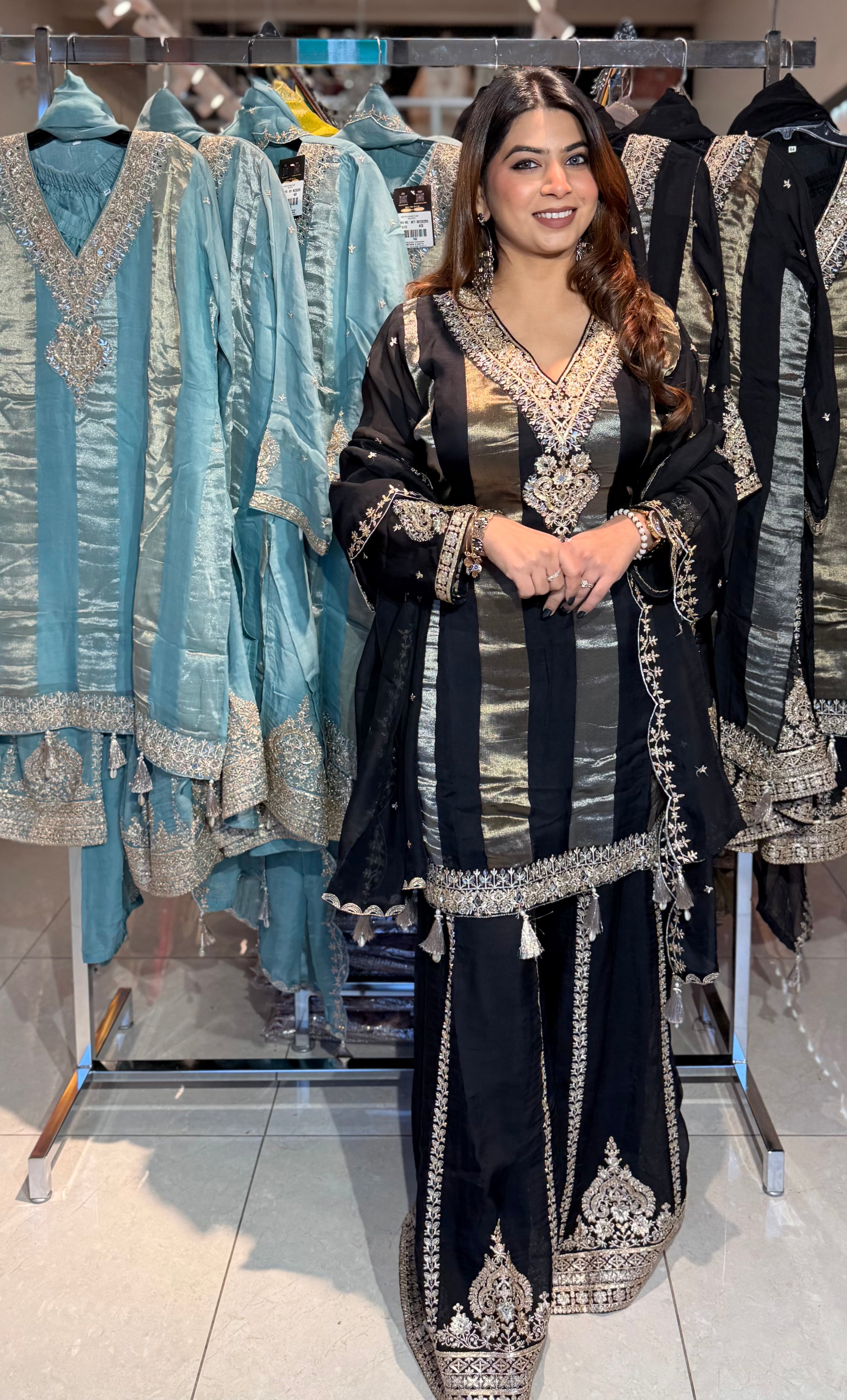 Step into timeless elegance with this stunning BLACK AND GOLD SHARARA , designed to make you stand out at every celebration. The kurta features intricate hand embroidery with zari and sequin work along the neckline and borders, adding a touch of regal charm. Paired with matching palazzo pants adorned with delicate detailing and a scalloped edge dupatta embellished with fine embroidery and tassels, this ensemble is perfect for festive occasions, weddings, or formal gatherings. Crafted from luxurious silk fabric, it offers a graceful drape and exceptional comfort.