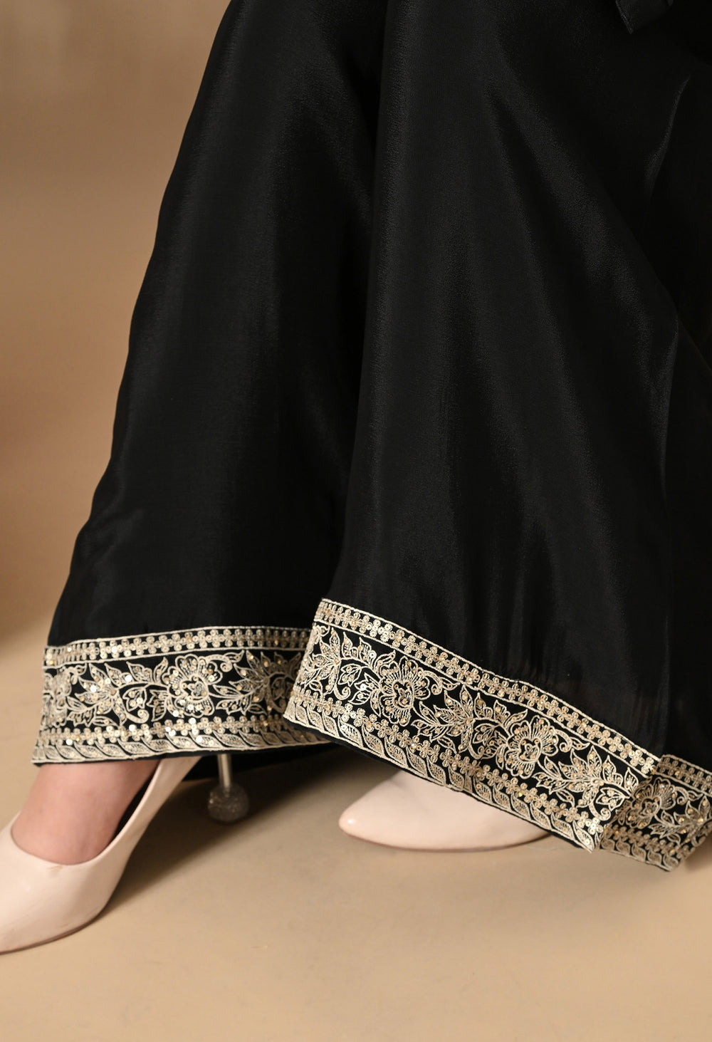 Make a statement in timeless black with our Aafreen Noir . Featuring intricate silver embroidery on the neckline and sleeve cuffs, this ensemble exudes understated elegance. The straight kurta is paired with wide-leg palazzo pants enhanced with matching embroidery on the hem. A soft, flowy dupatta adorned with bold floral prints completes this effortlessly chic look — perfect for evening festivities, family gatherings, or a graceful festive appearance.