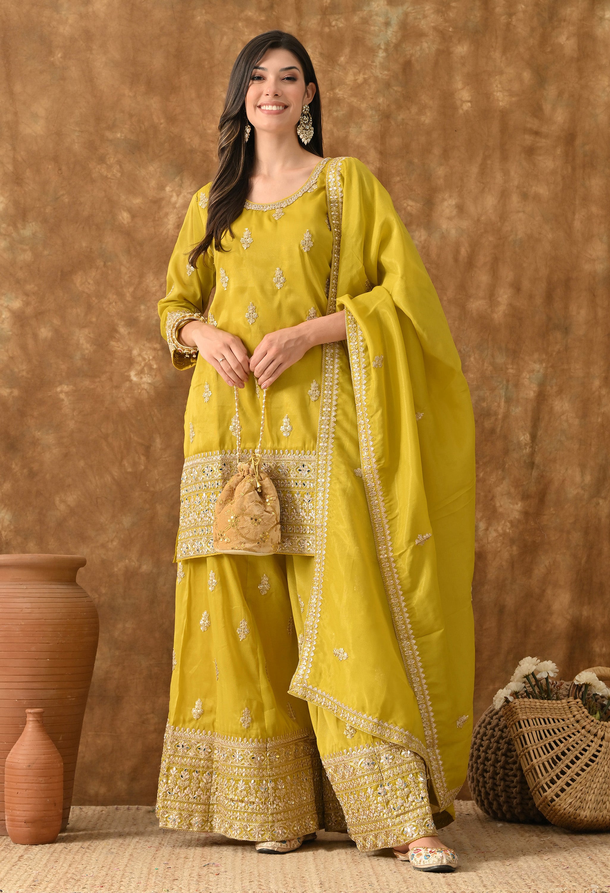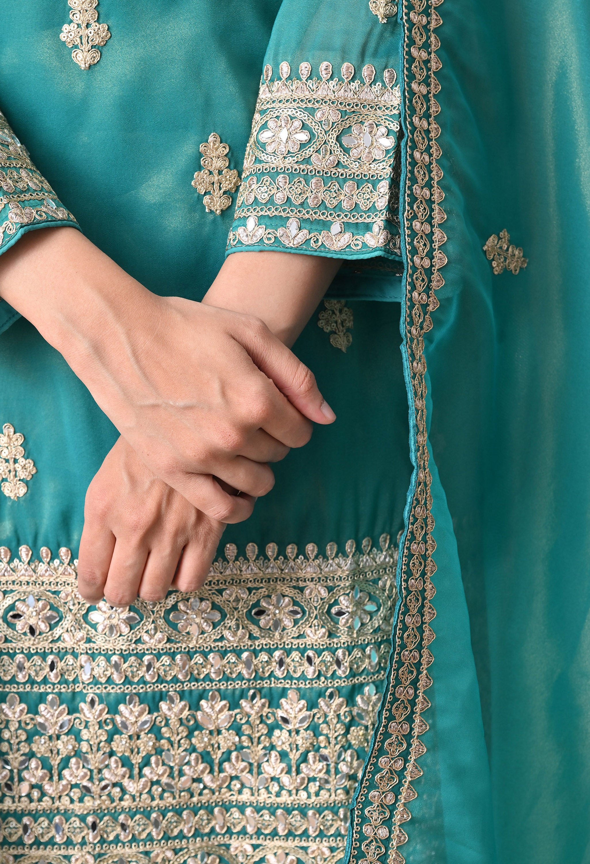 Feel fresh and graceful in the Blissful Breeze Suit Set, a serene blend of elegance and charm. This aqua blue three-piece ensemble features delicate all-over embroidery, paired with wide-legged sharara and a beautifully bordered dupatta. Perfect for festive weddings , sangeet casual gatherings, or a refreshing everyday ethnic look.