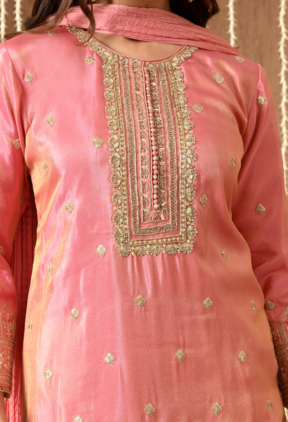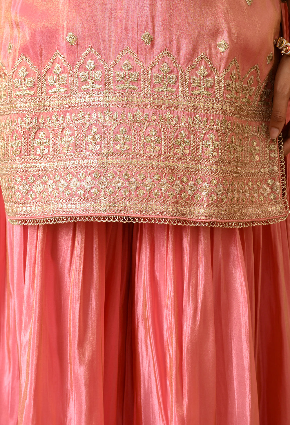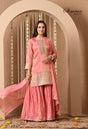A soft blush pink ensemble featuring delicate gota patti and zari embroidery on the neckline, sleeves, and hemline. Paired with a flared sharara and matching dupatta, this look blends tradition with understated elegance.