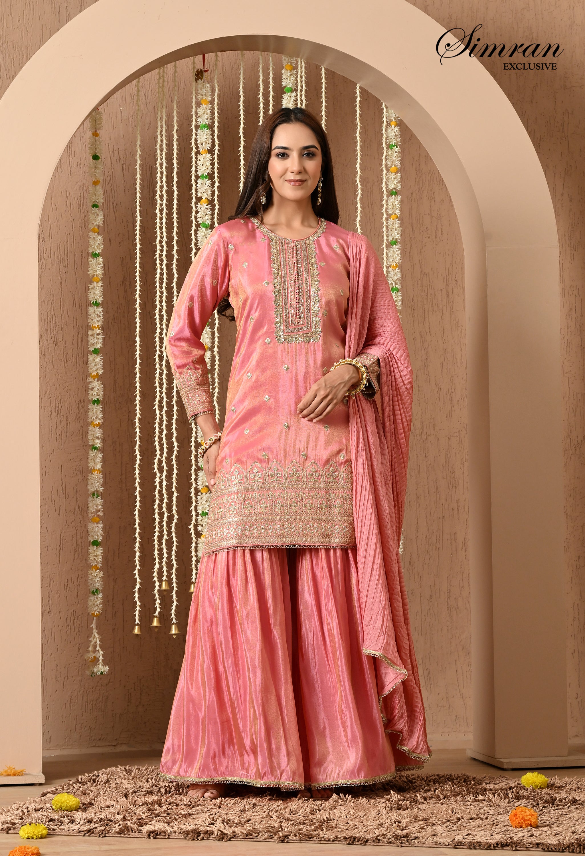 A soft blush pink ensemble featuring delicate gota patti and zari embroidery on the neckline, sleeves, and hemline. Paired with a flared sharara and matching dupatta, this look blends tradition with understated elegance.