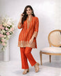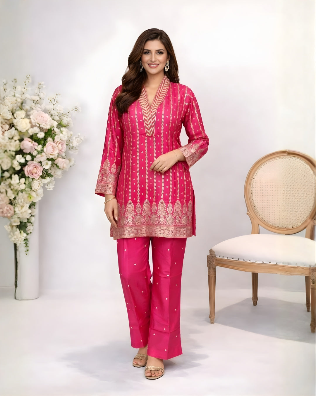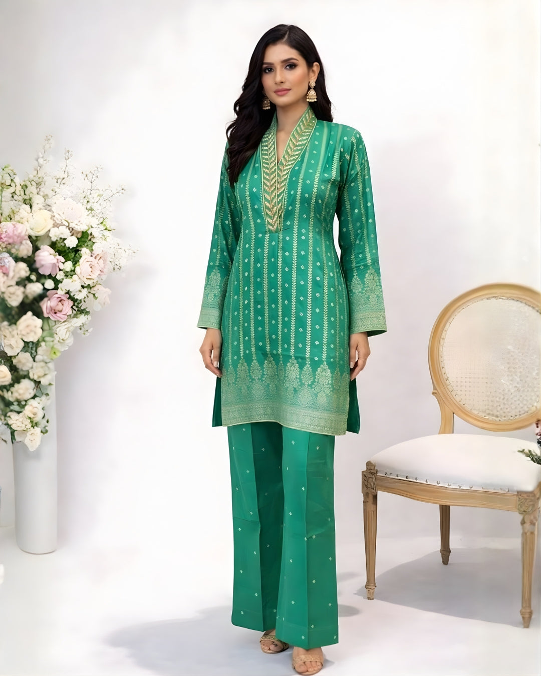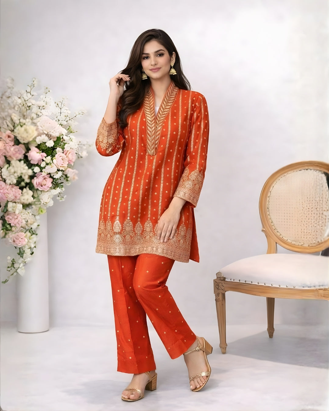 The straight kurta is adorned with beautiful golden woven motifs and intricate border work on the neckline, sleeves, and hem, giving it a graceful festive appeal. Paired with comfortable straight pants, the ensemble creates a sleek and flattering silhouette ideal for both festive and semi-formal occasions.