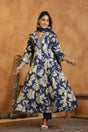 Grace your festive wardrobe with this elegant navy blue Anarkali suit highlighted with bold silver floral prints. The flared silhouette gives it a regal touch, while the intricately embroidered neckline with keyhole detail adds charm and sophistication.