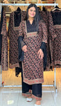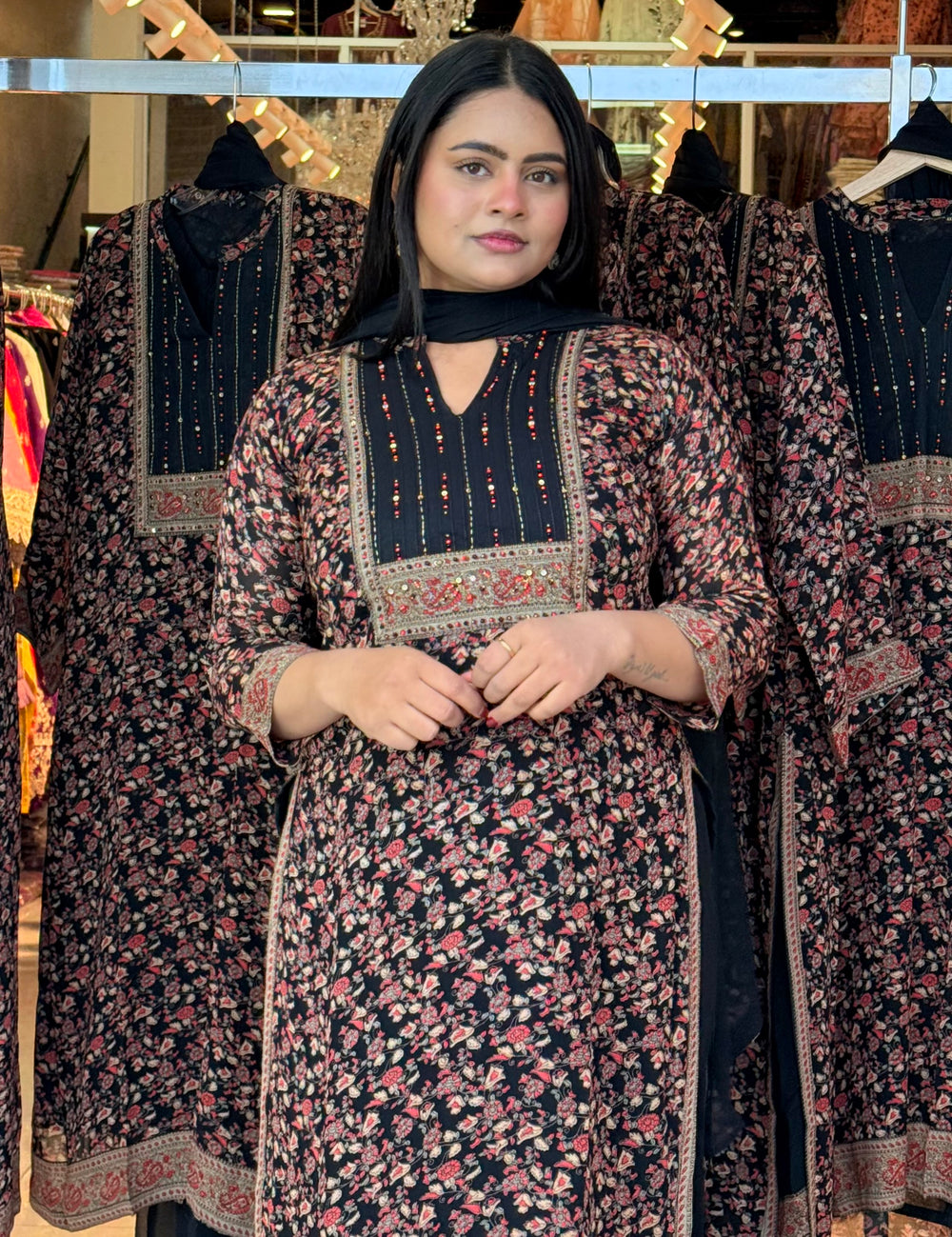 Step into timeless elegance with the Black Rose Garden Suit . Crafted in rich black fabric adorned with intricate floral prints, this set brings grace and charm to your festive and casual wardrobe. The kurta features a beautifully embroidered yoke and subtle sequin detailing, paired with a solid black dupatta with printed borders for a balanced, sophisticated look. The matching palazzo pants add comfort with a touch of traditional style.