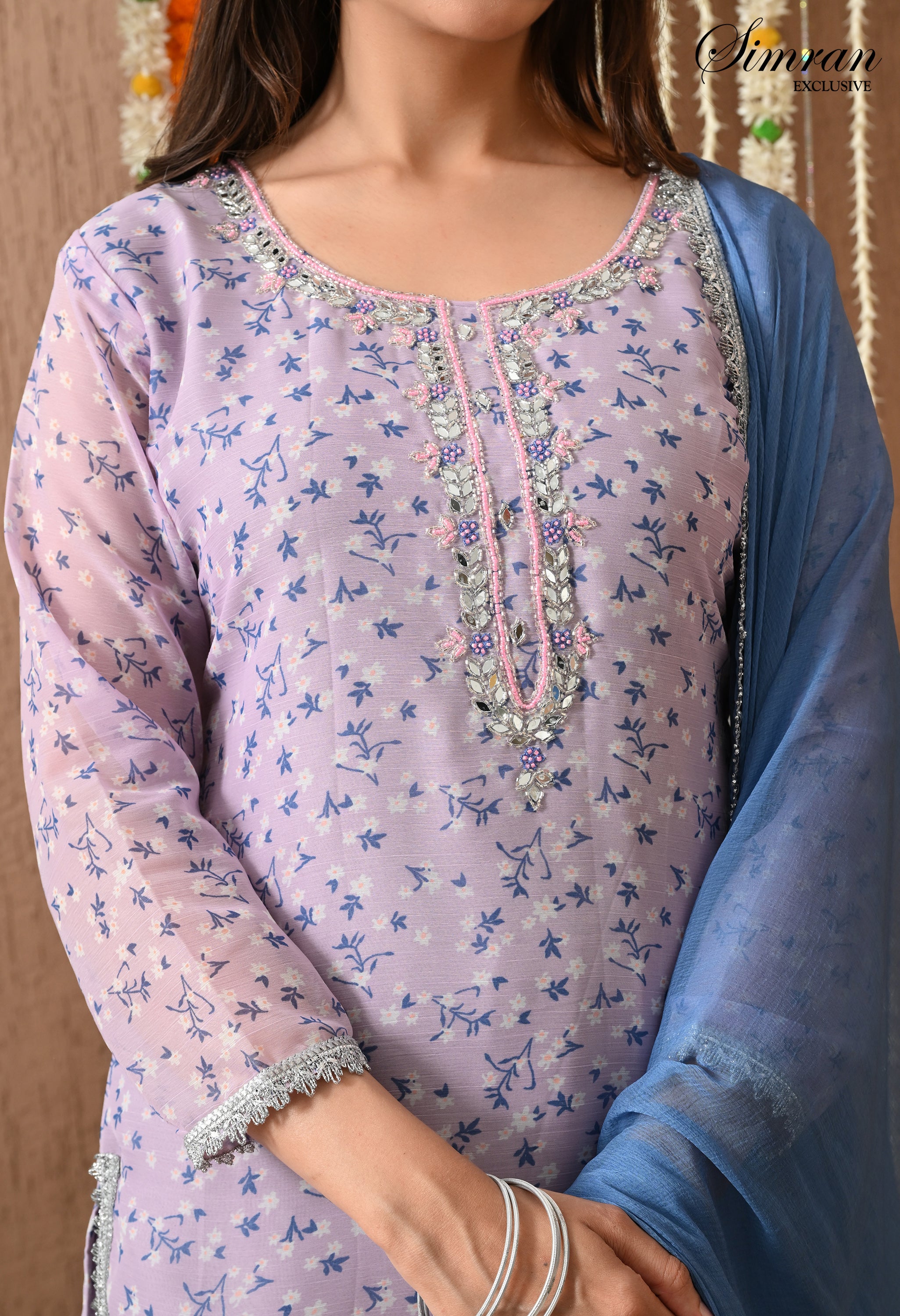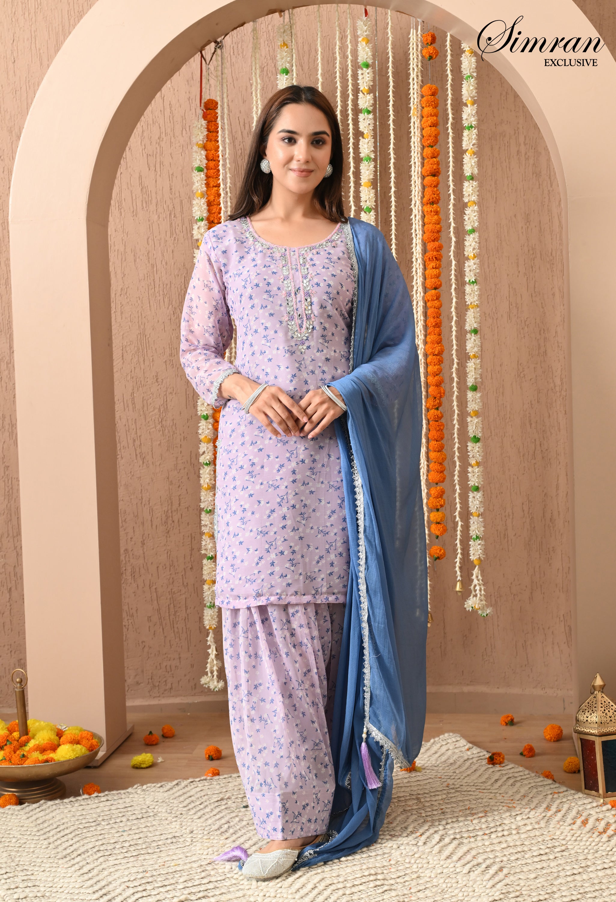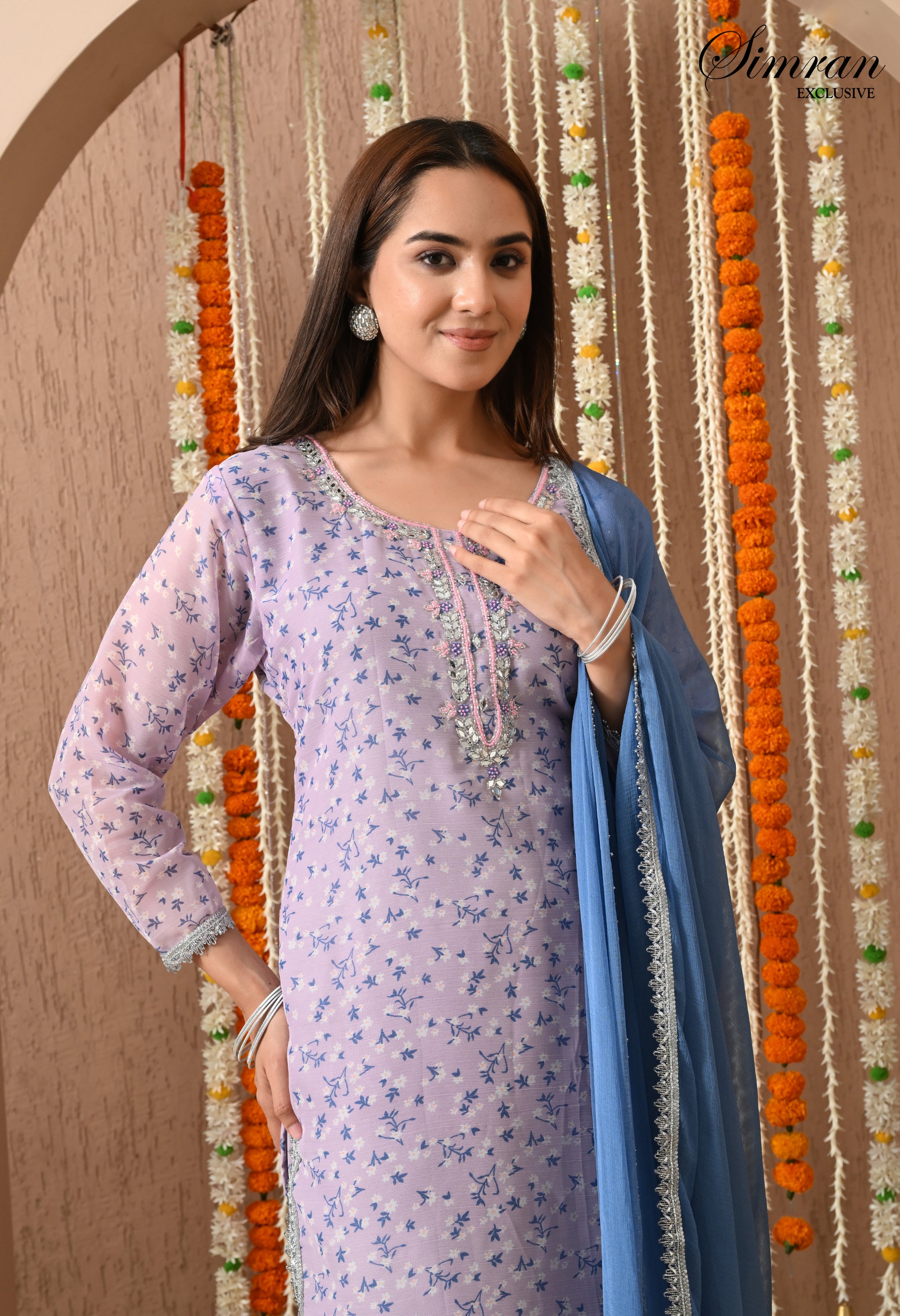 Grace your festive and casual gatherings in this charming lavender suit set, adorned with delicate floral prints and paired with a contrasting blue dupatta. Its light fabric, soothing colors, and elegant silhouette make it a versatile ethnic wear choice for both daytime functions and relaxed traditional events.
