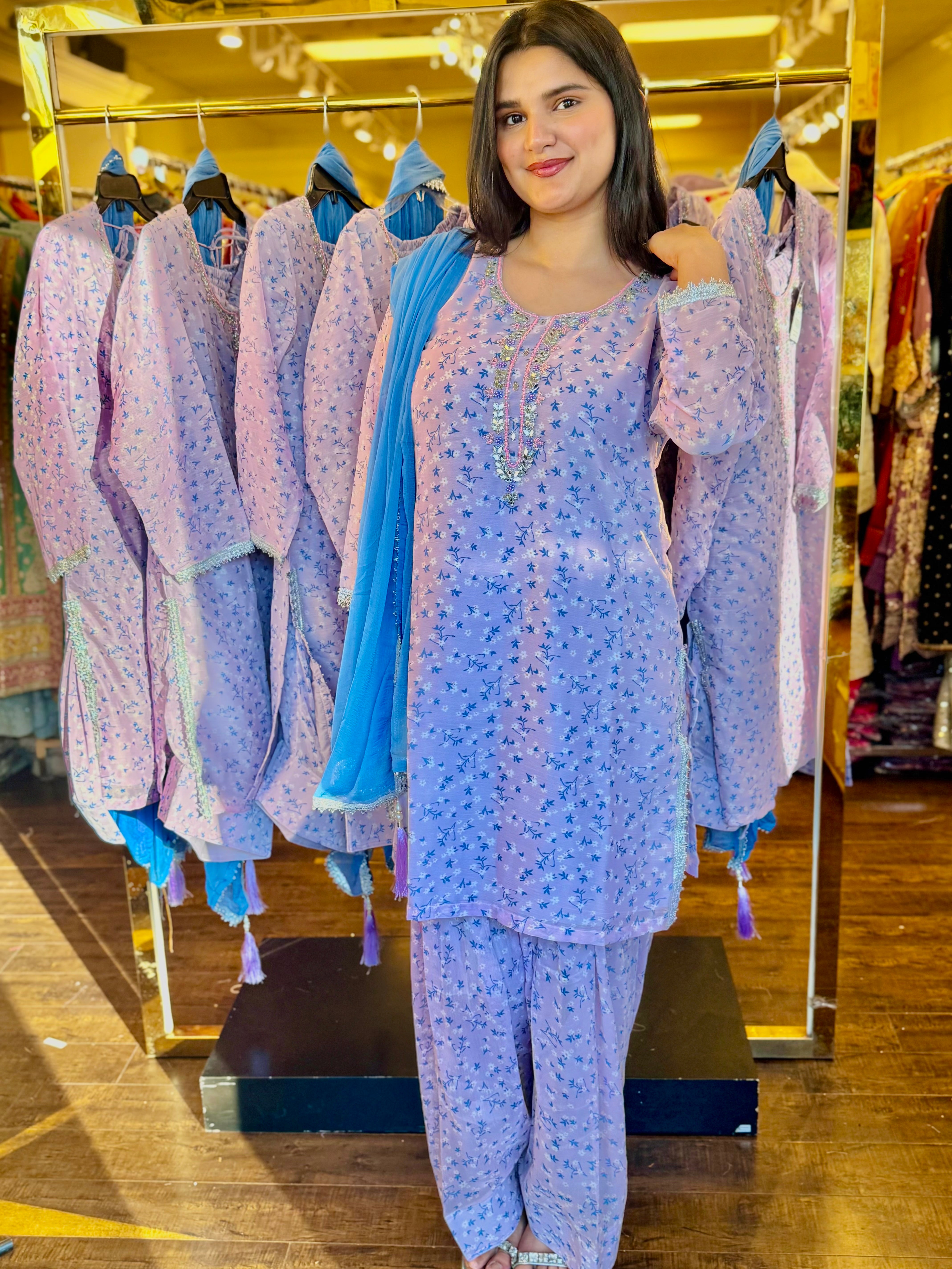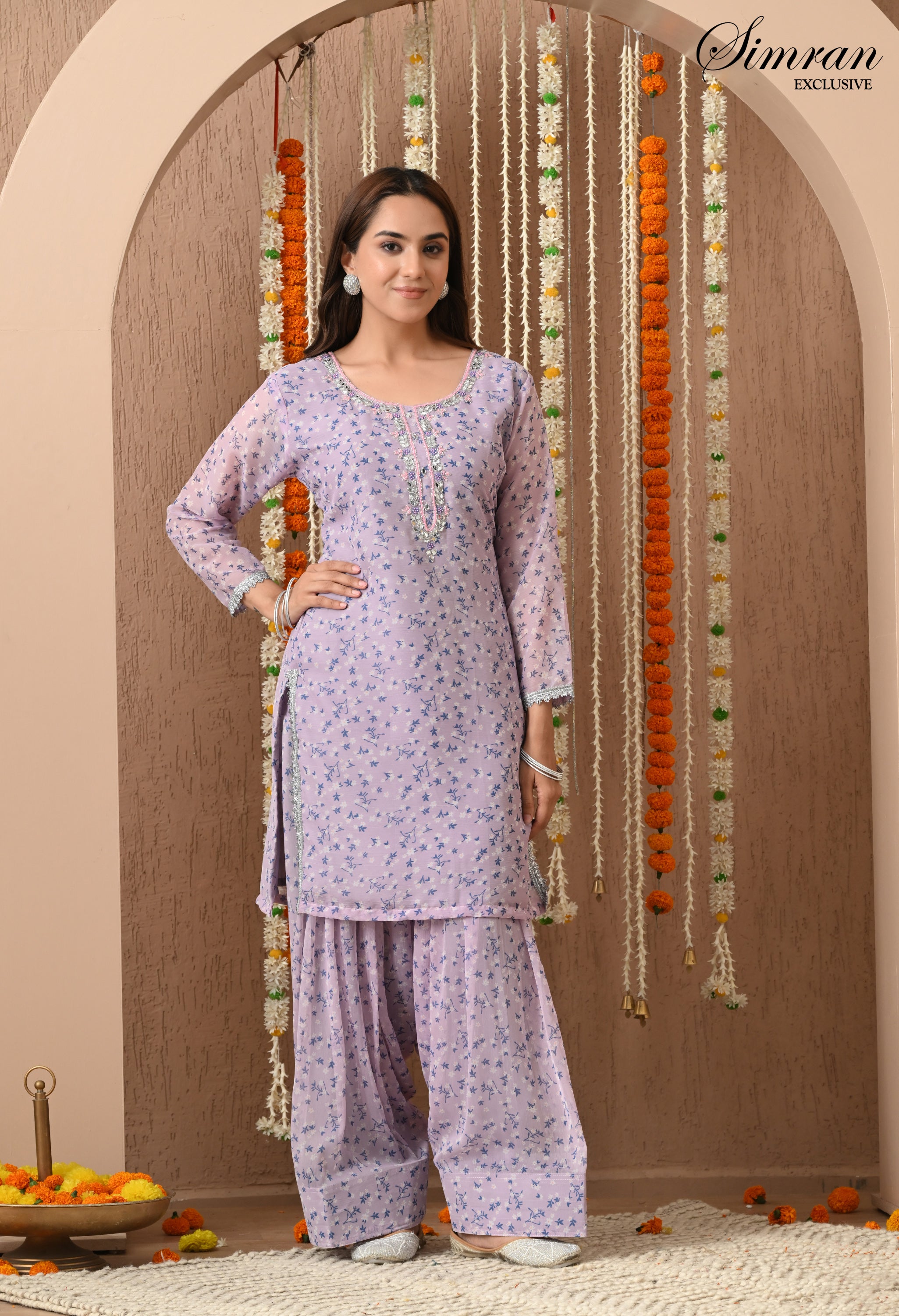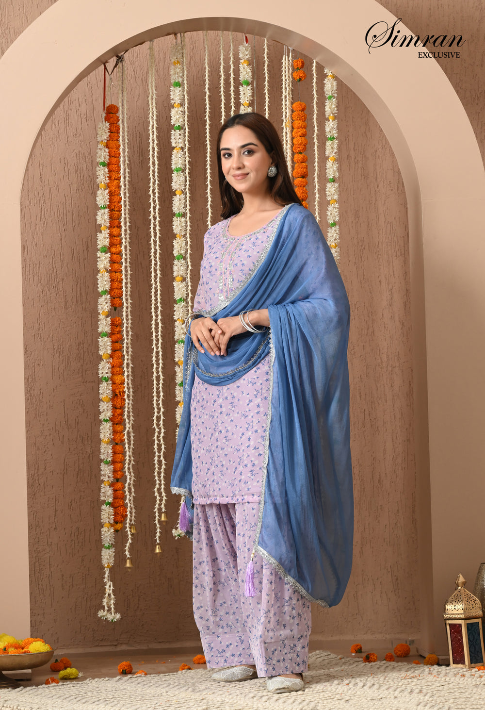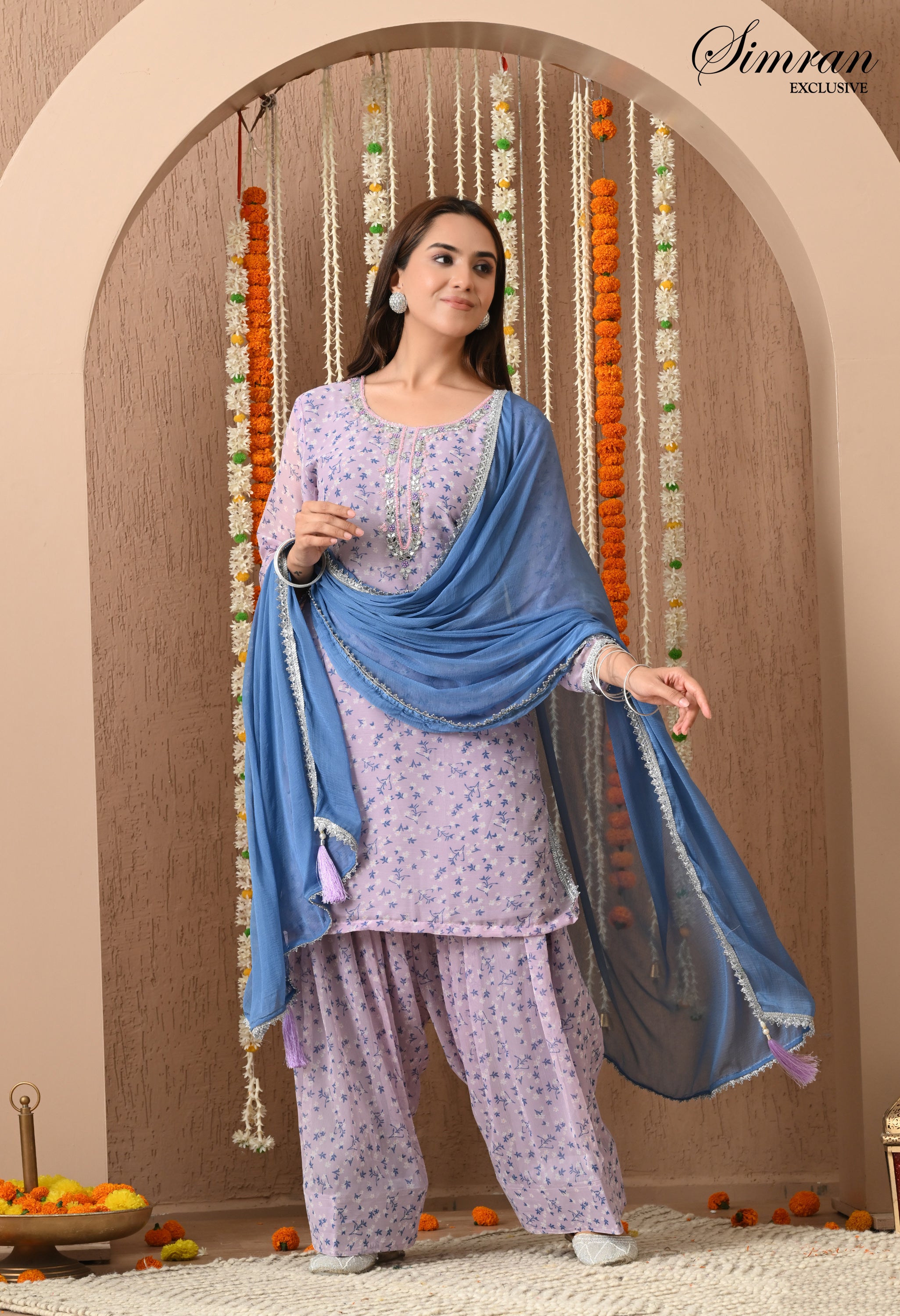 Grace your festive and casual gatherings in this charming lavender suit set, adorned with delicate floral prints and paired with a contrasting blue dupatta. Its light fabric, soothing colors, and elegant silhouette make it a versatile ethnic wear choice for both daytime functions and relaxed traditional events.