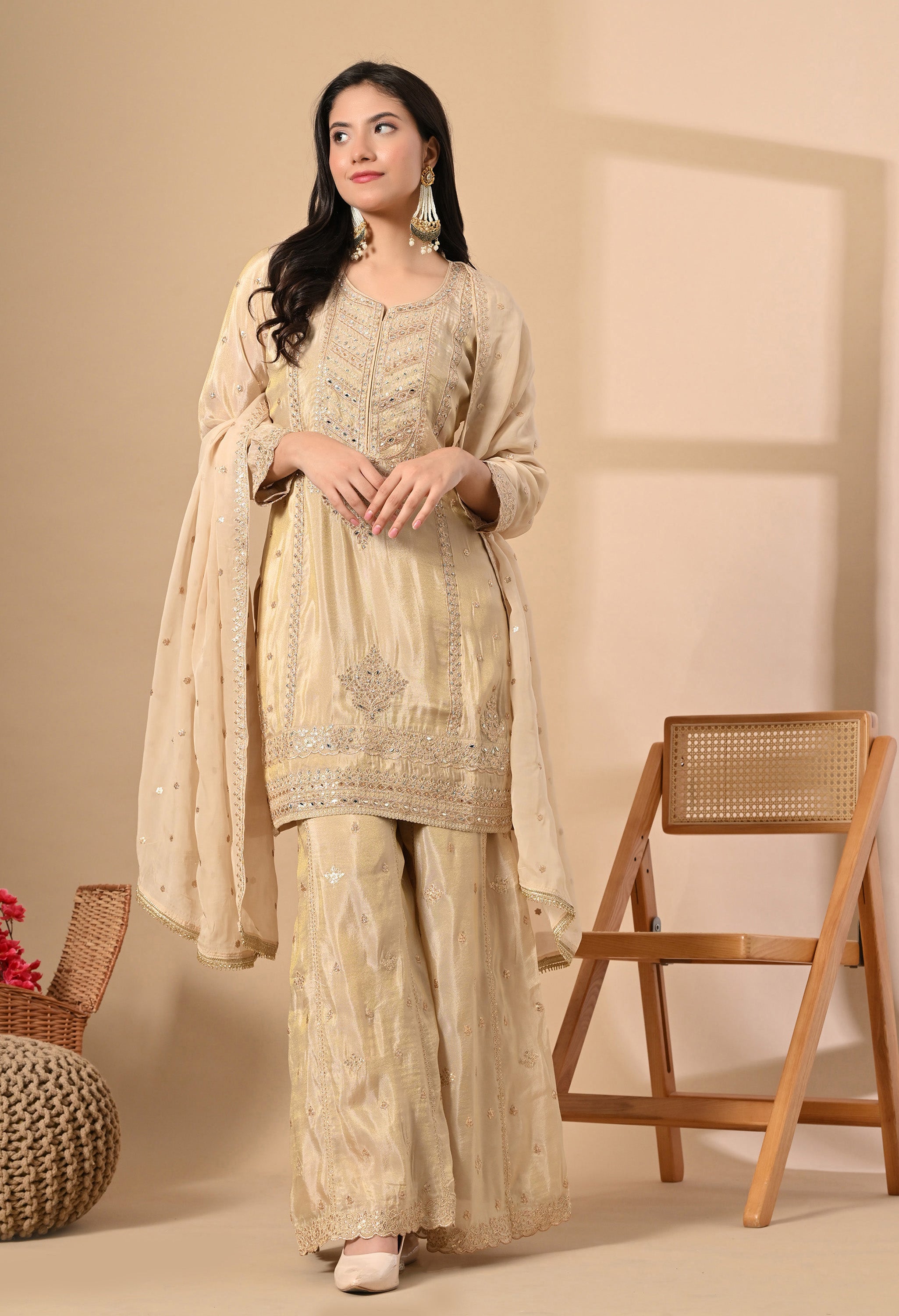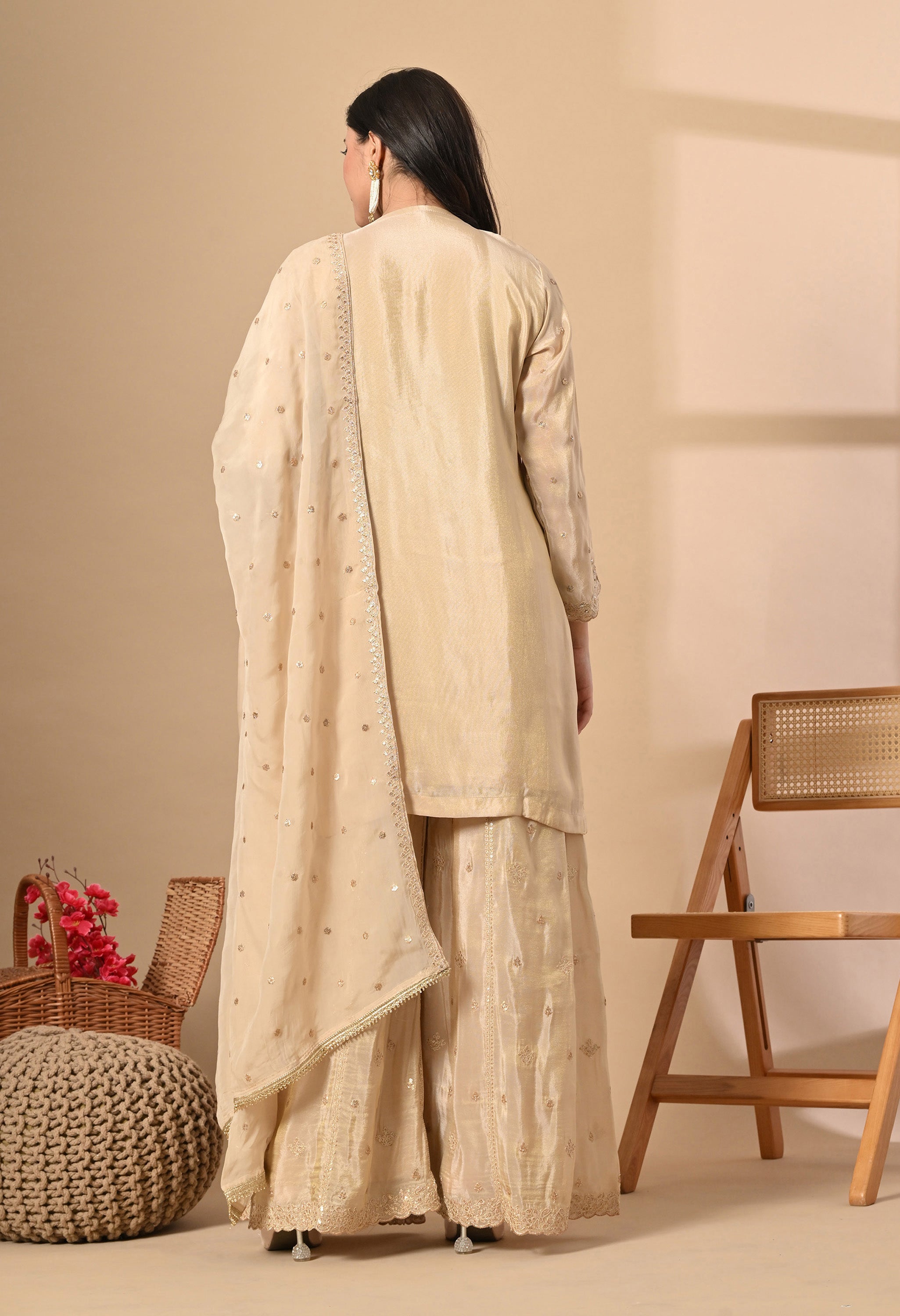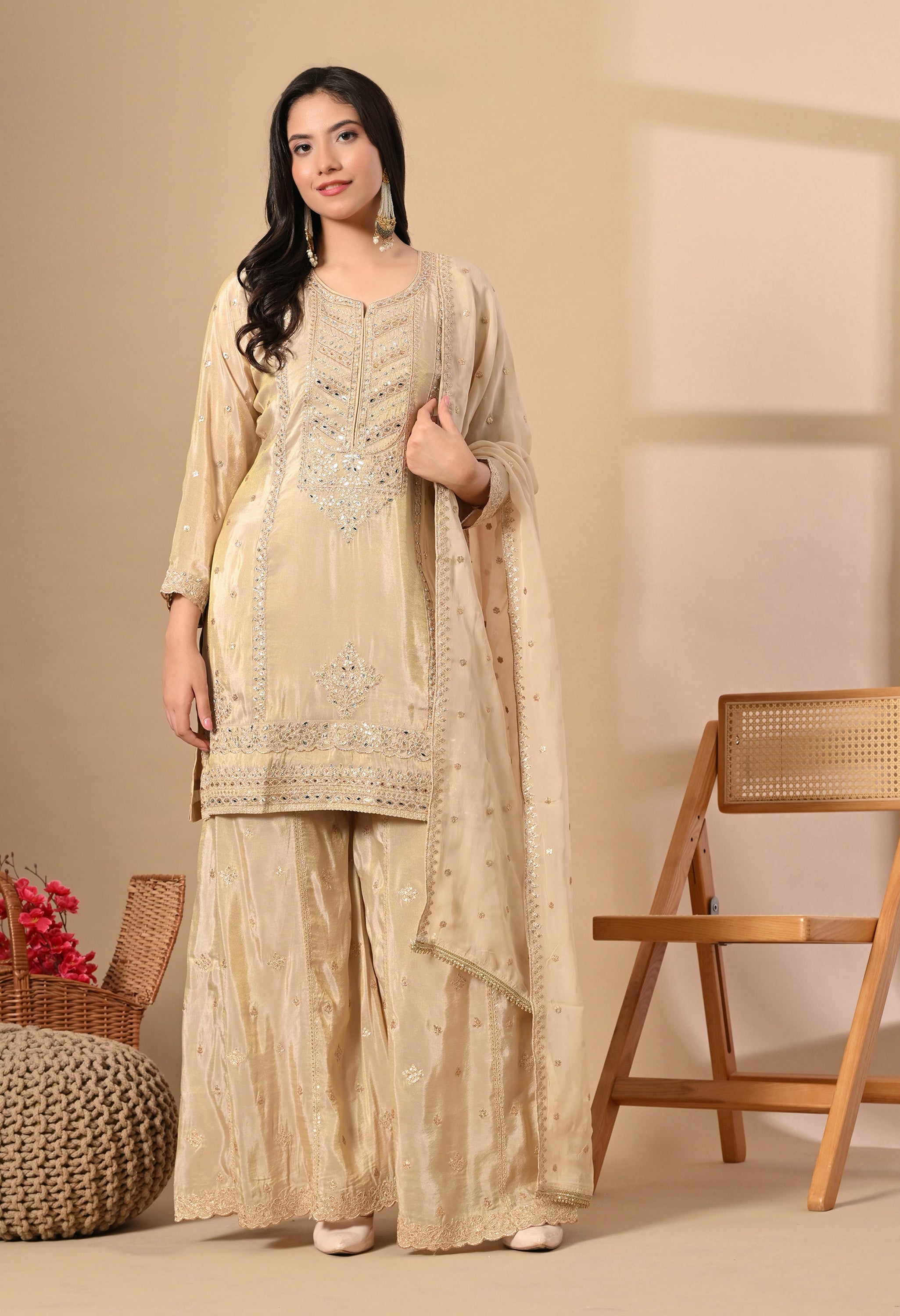 Shine with grace in our Rosy Elegance — a vision in champagne gold. The straight-cut kurta is beautifully adorned with intricate mirror work and tonal thread embroidery on the neckline and hemline, adding a regal charm. Paired with a flared sharara featuring and a soft organza dupatta sprinkled with sequins, this outfit brings together tradition and glamour effortlessly.