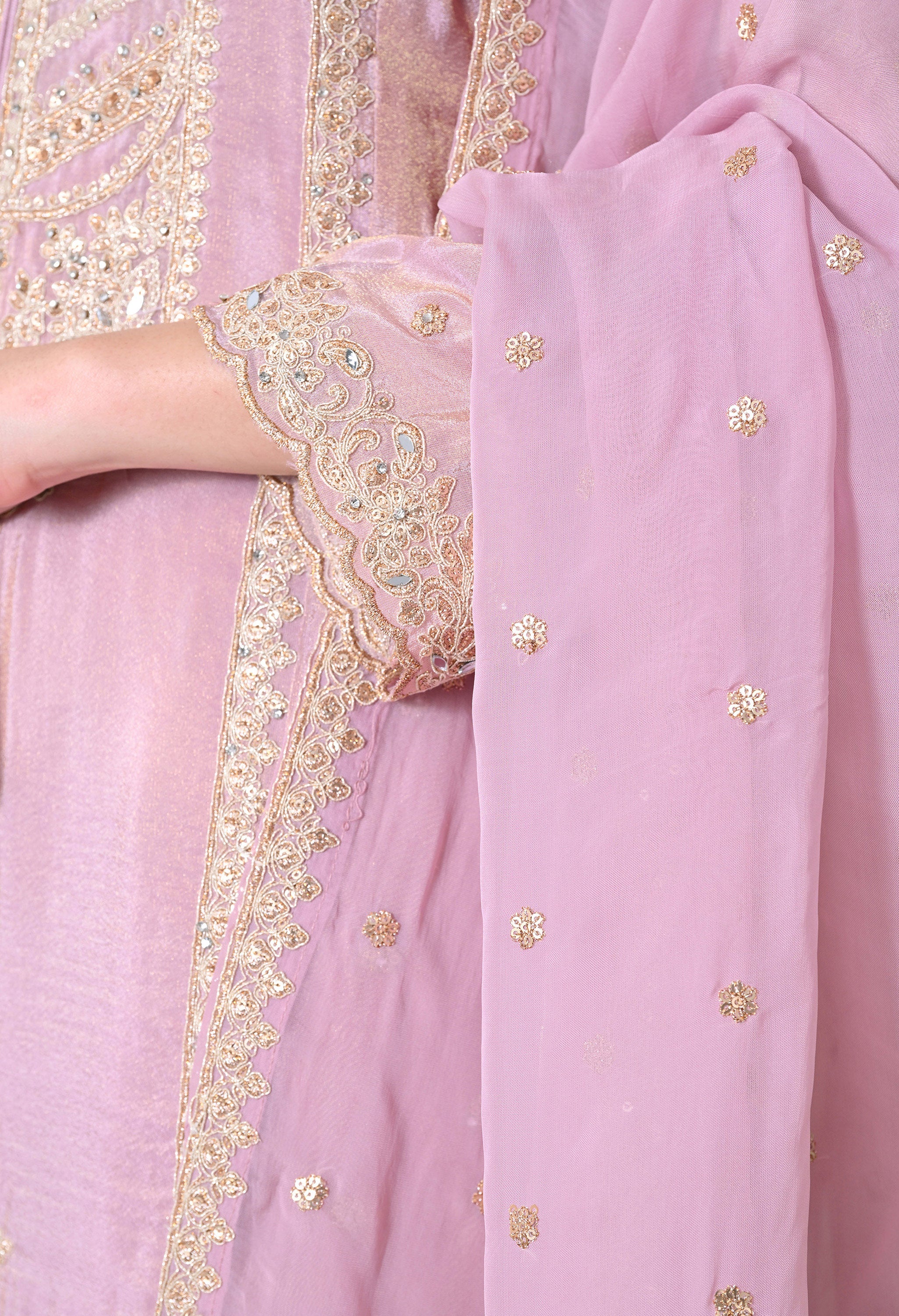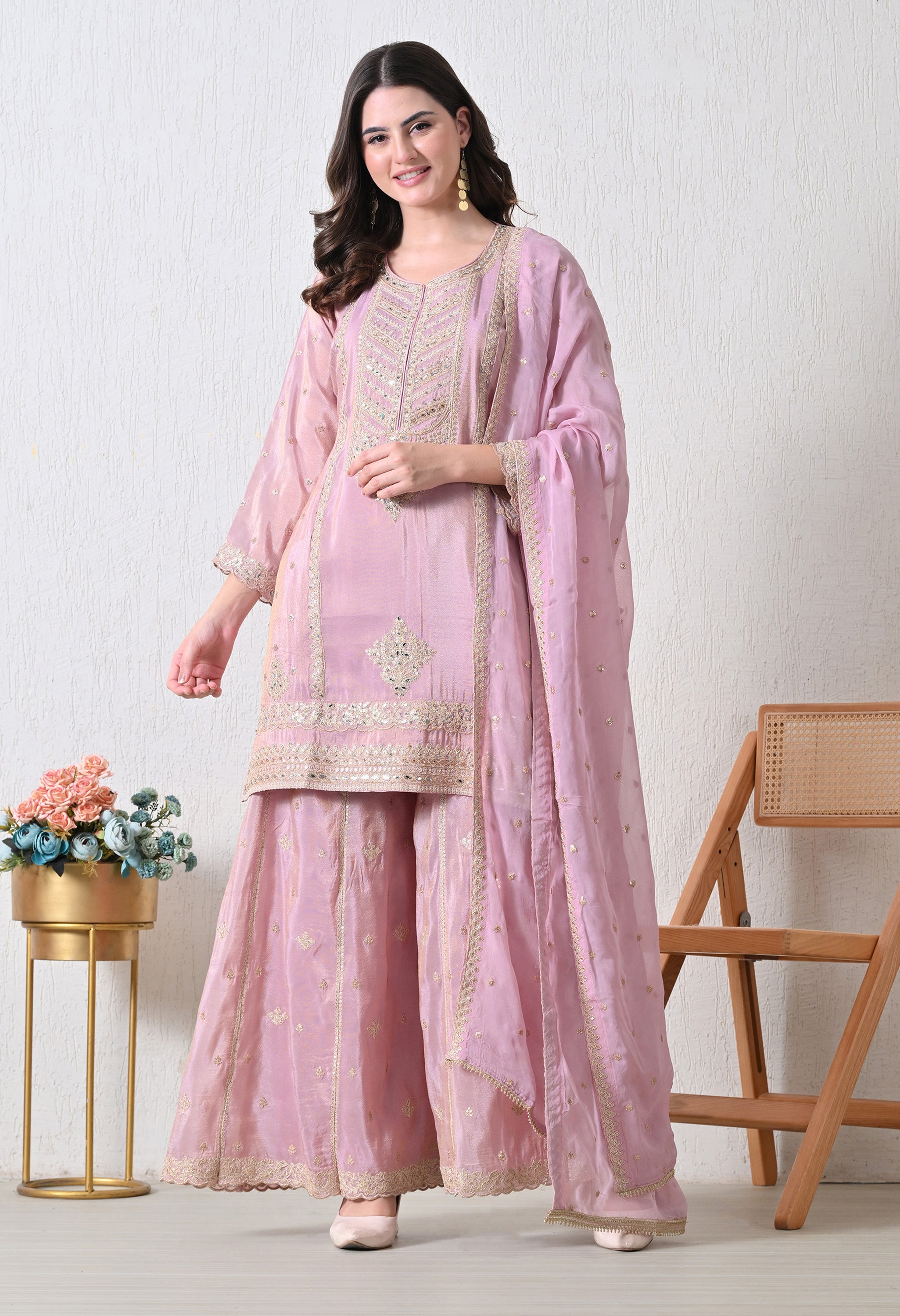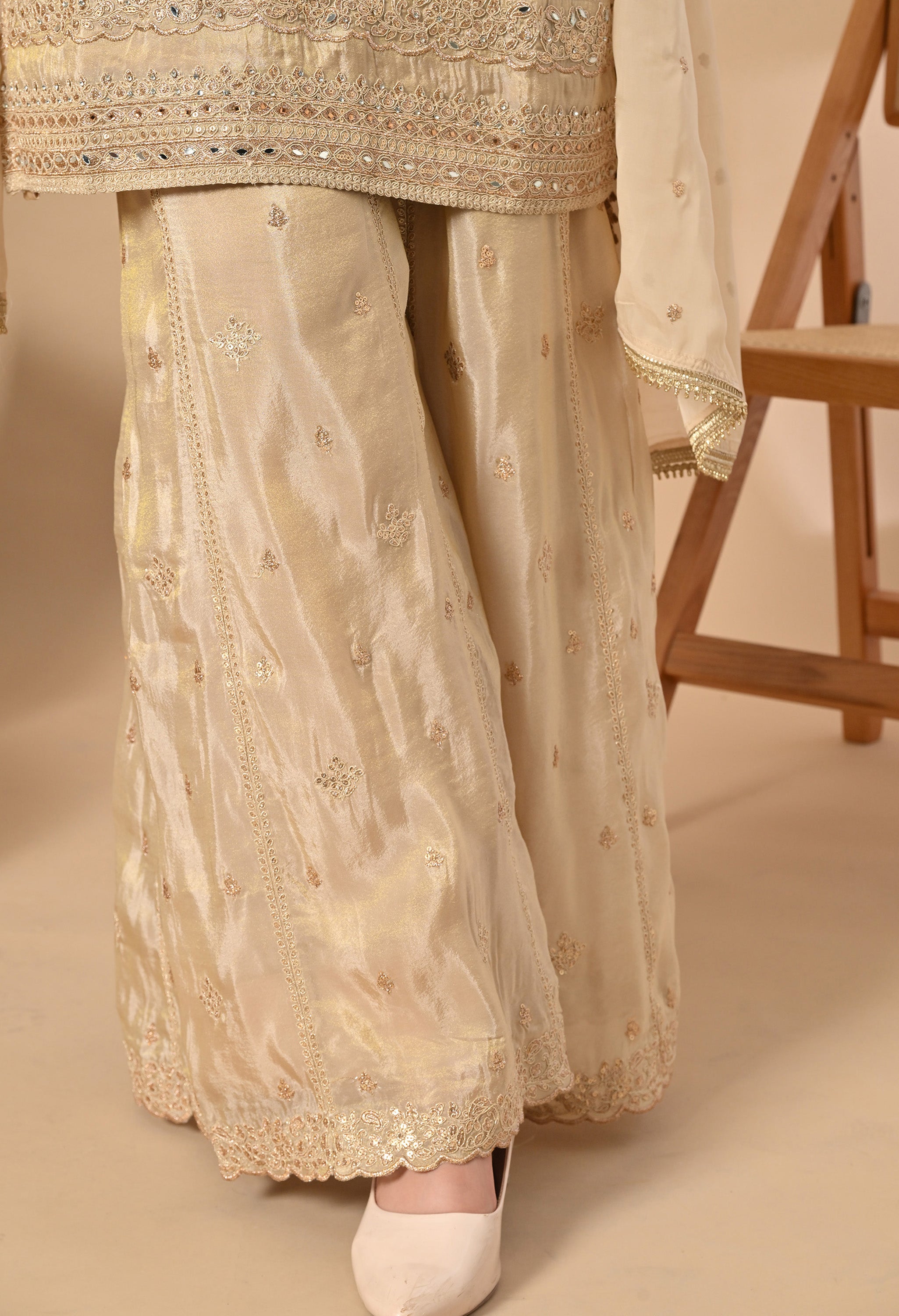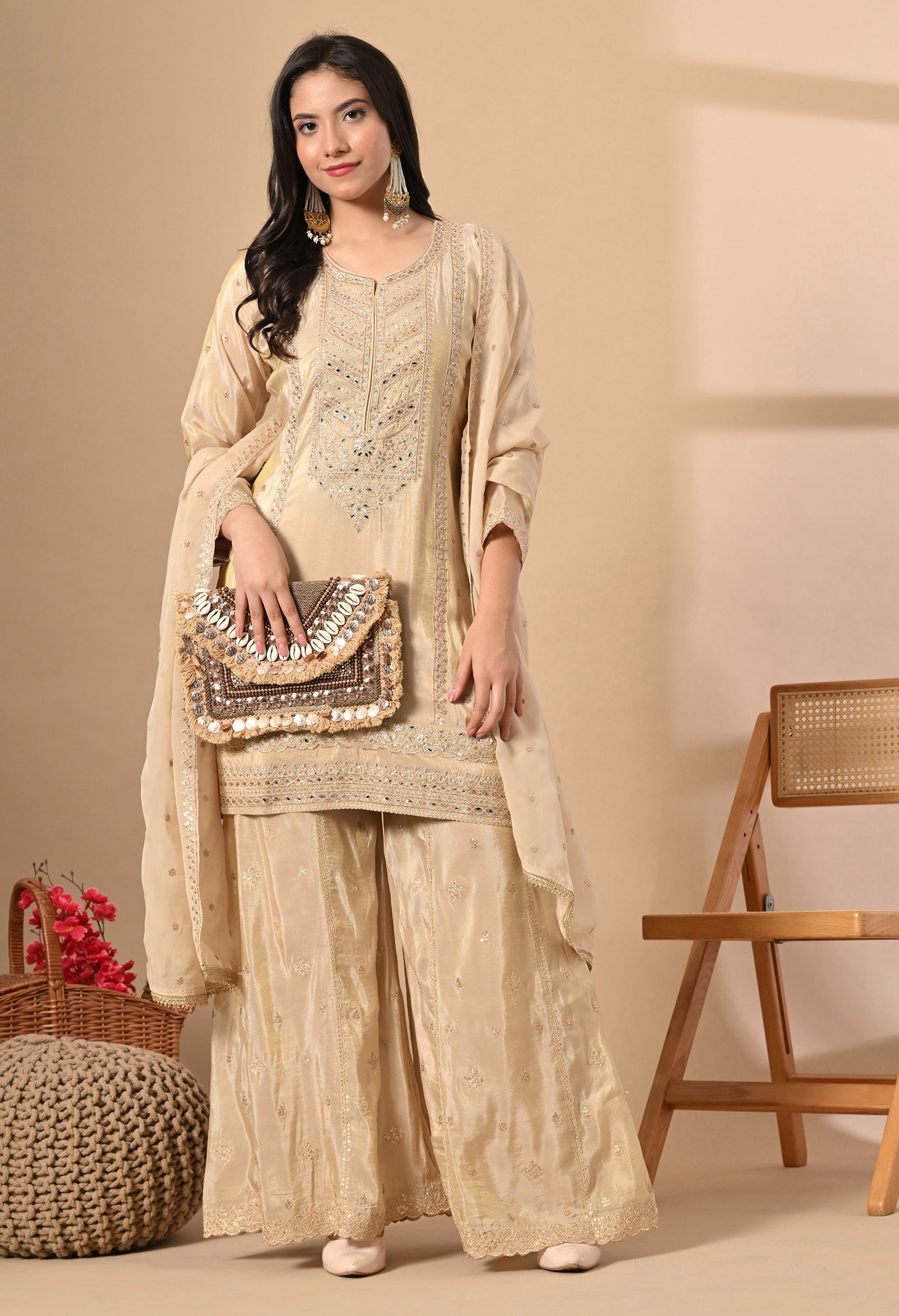 Shine with grace in our Rosy Elegance — a vision in champagne gold. The straight-cut kurta is beautifully adorned with intricate mirror work and tonal thread embroidery on the neckline and hemline, adding a regal charm. Paired with a flared sharara featuring and a soft organza dupatta sprinkled with sequins, this outfit brings together tradition and glamour effortlessly.