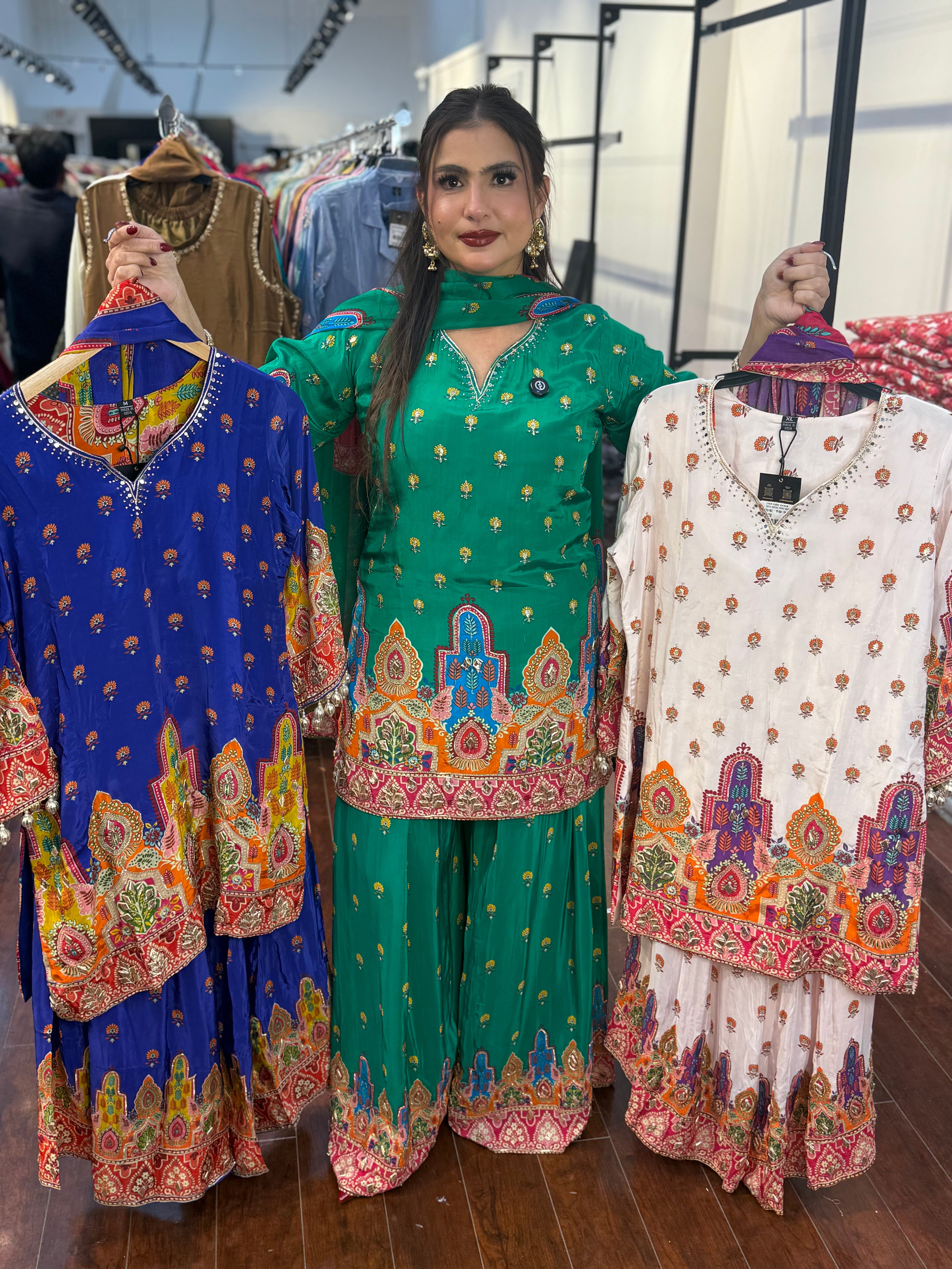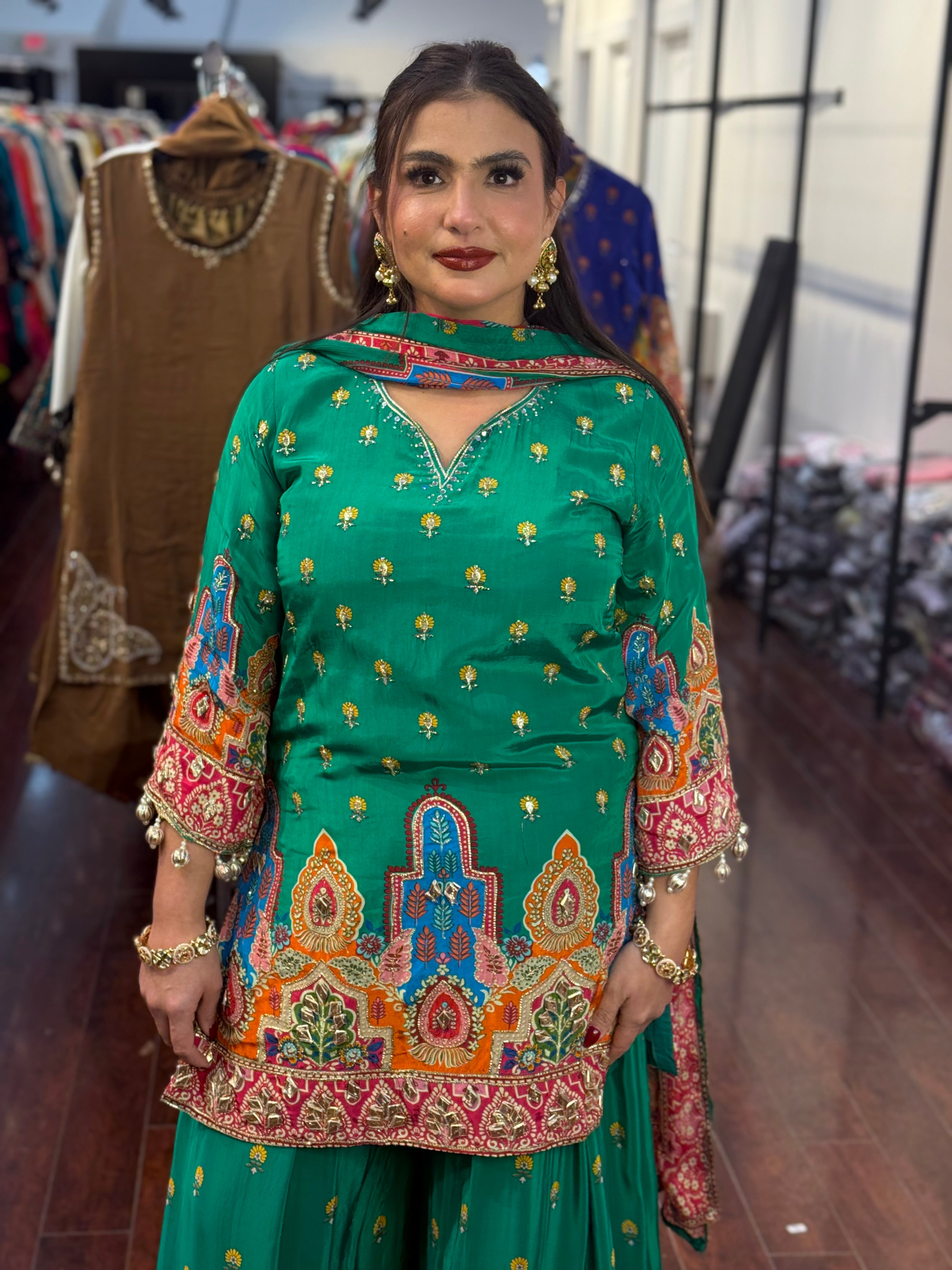 A stunning traditional ensemble that beautifully combines elegance with vibrant charm. This green sharara suit set features exquisite multicolored embroidery and a contrasting pink dupatta, creating a festive yet sophisticated look. Perfect for wedding functions, festive gatherings, and cultural celebrations.