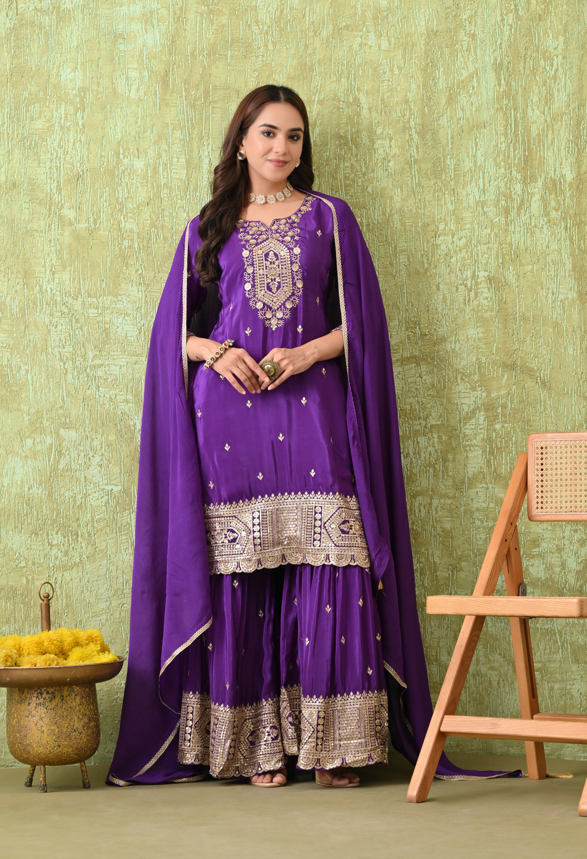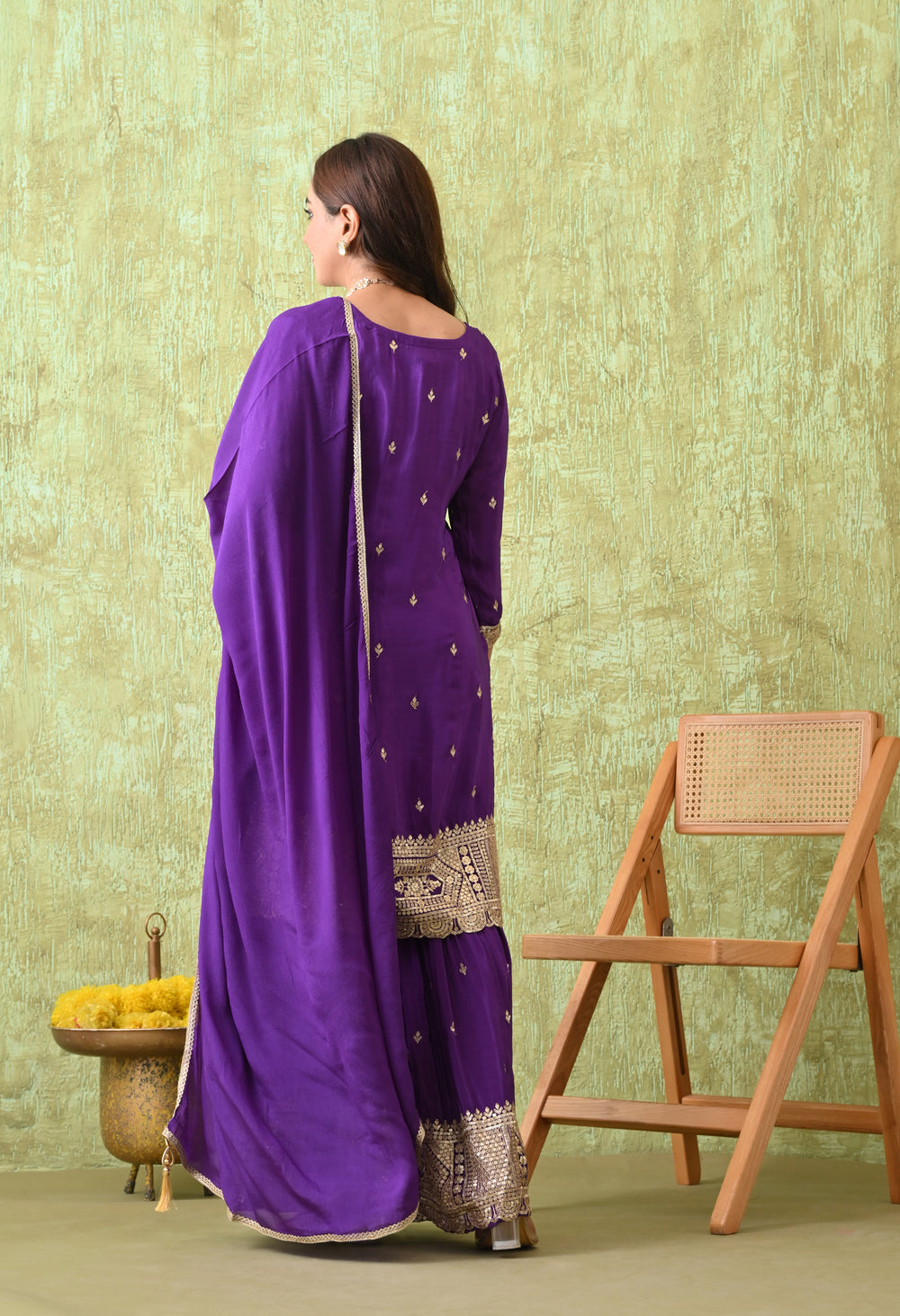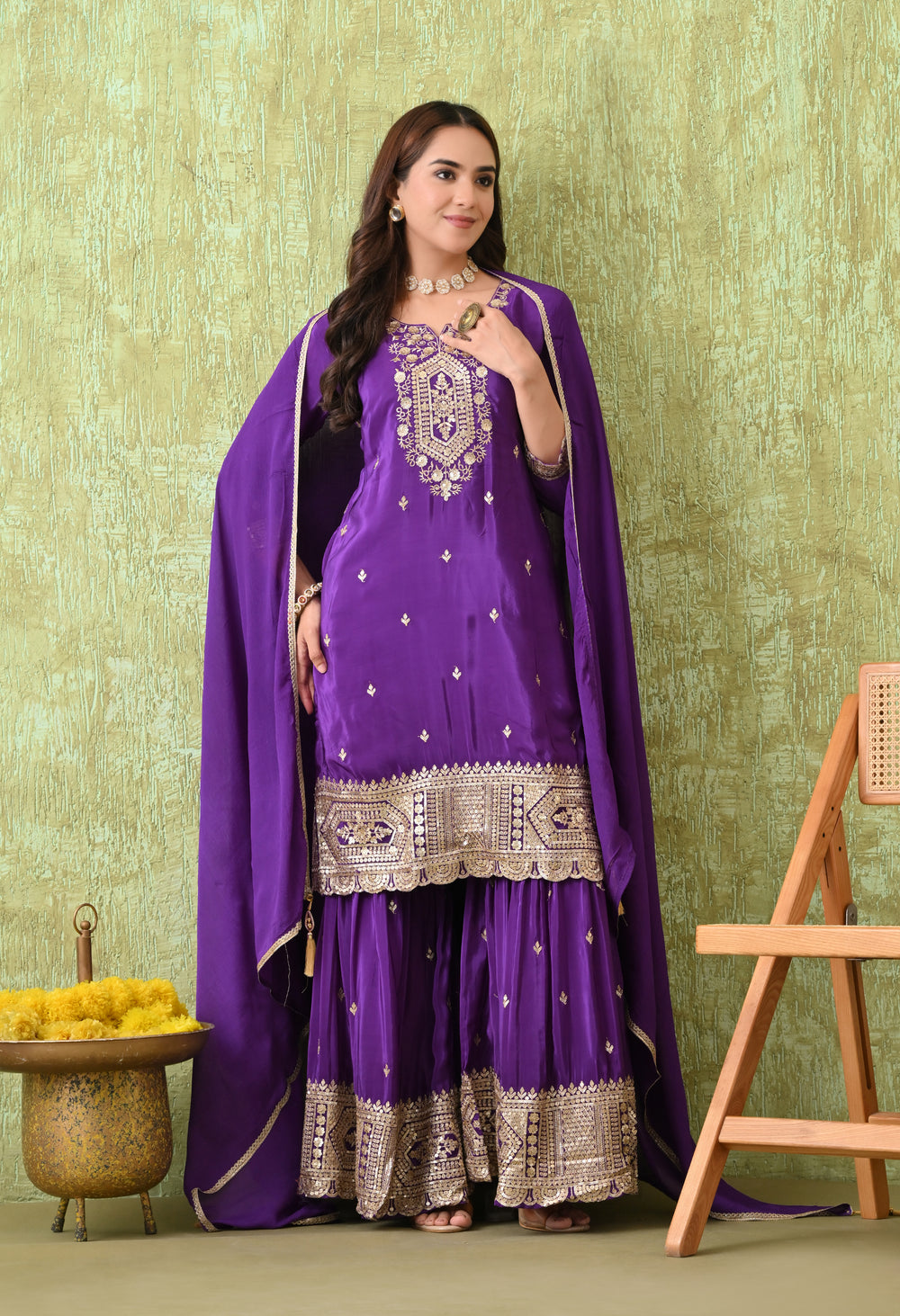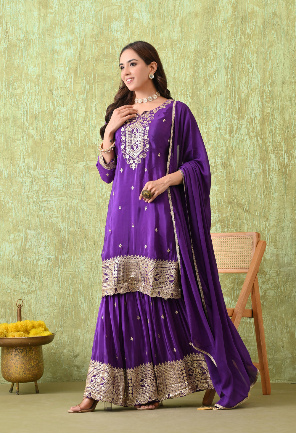 An elegant purple adorned with intricate golden embroidery, designed to exude timeless grace. The rich embroidery on the neckline, hemline, and sharara gives this outfit a festive grandeur, making it ideal for weddings, festive celebrations, and cultural events.