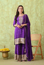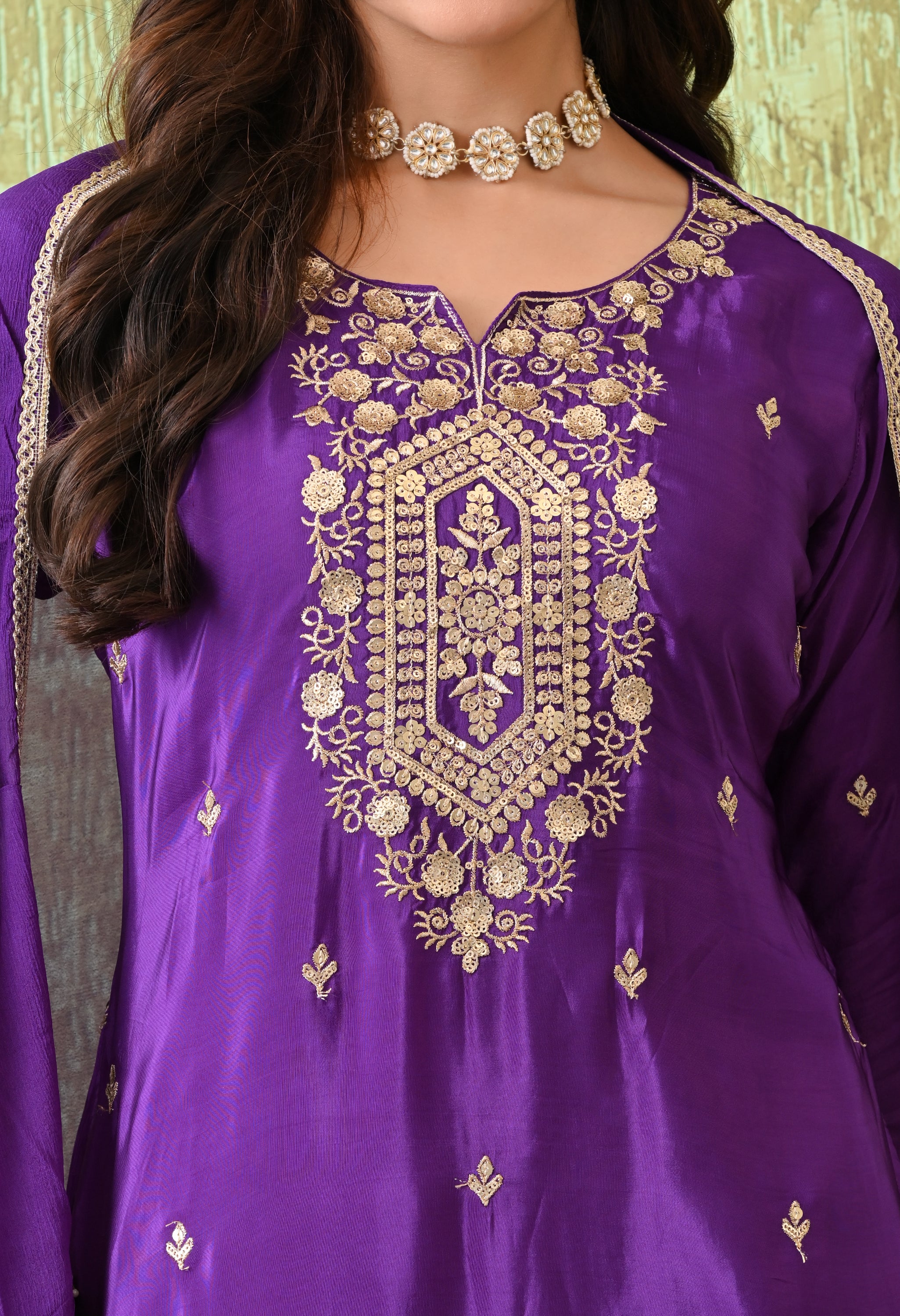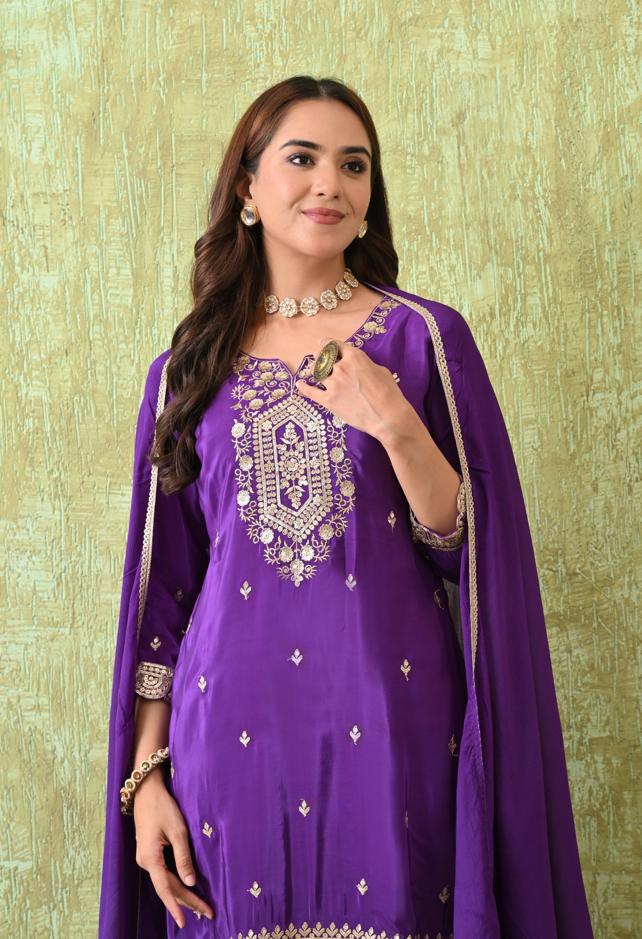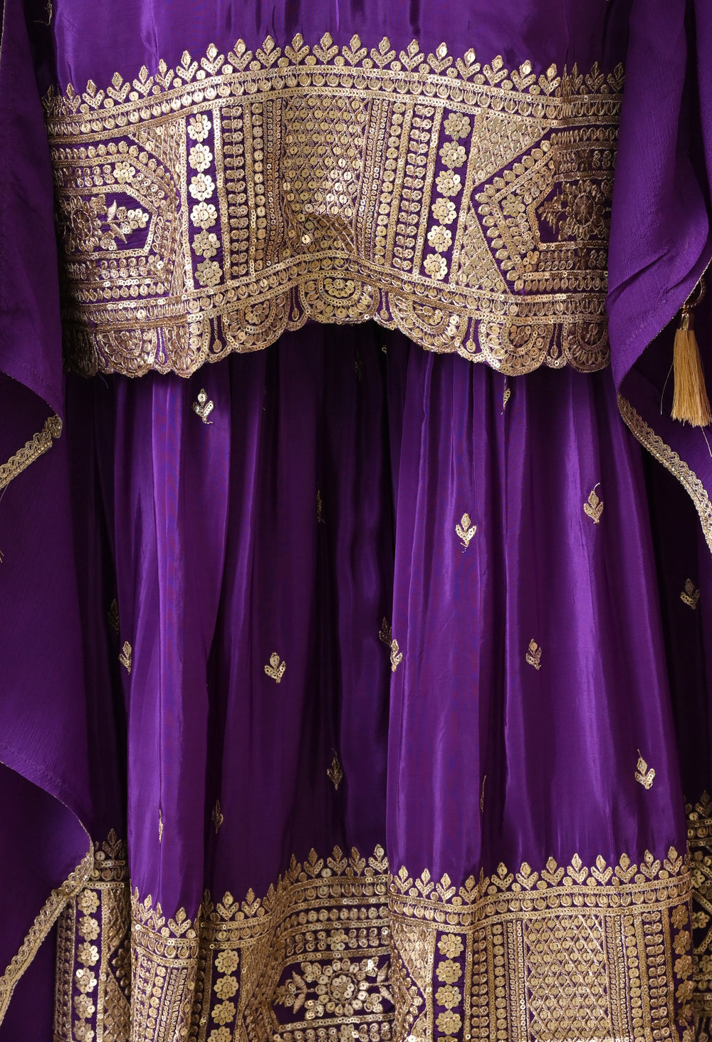An elegant purple adorned with intricate golden embroidery, designed to exude timeless grace. The rich embroidery on the neckline, hemline, and sharara gives this outfit a festive grandeur, making it ideal for weddings, festive celebrations, and cultural events.