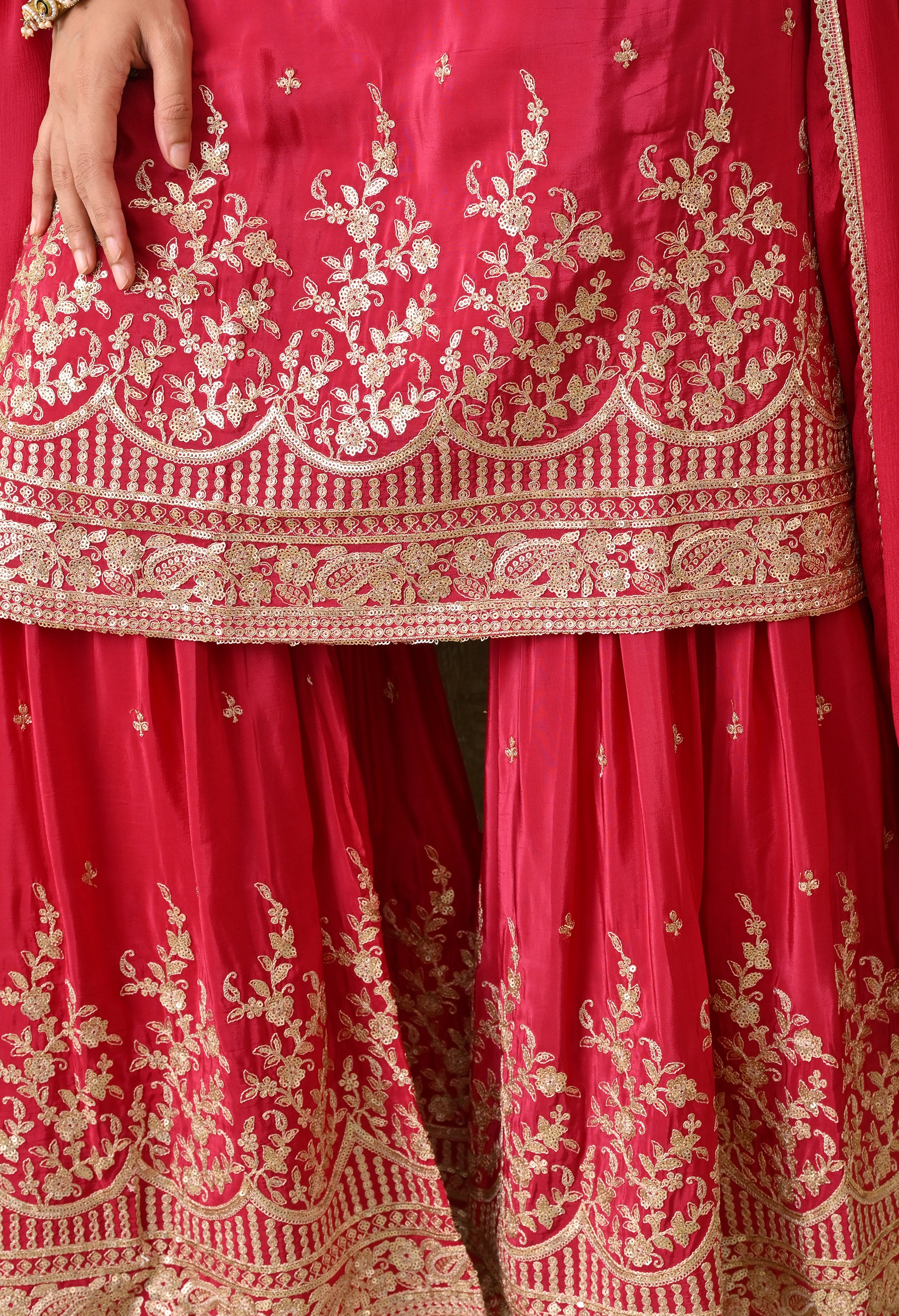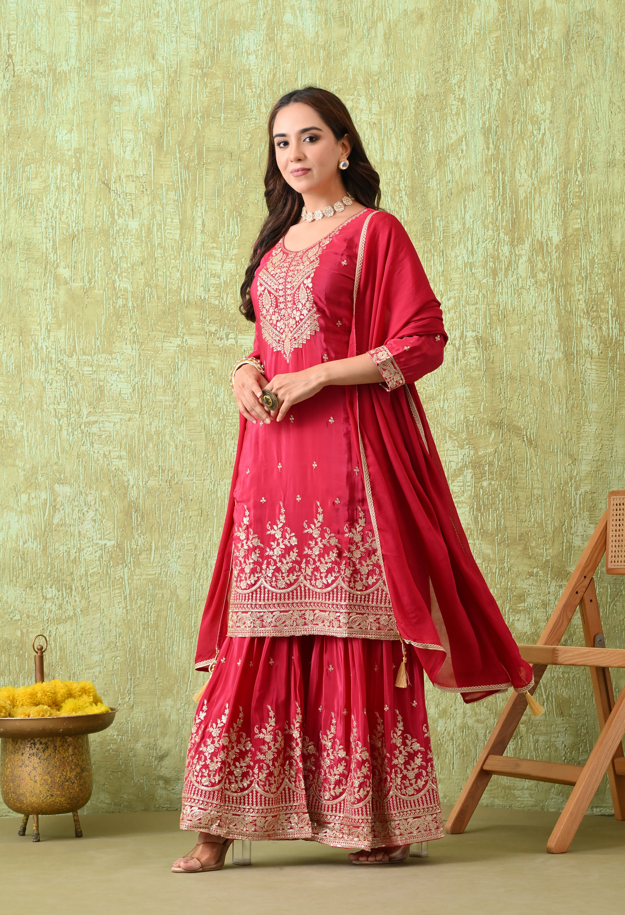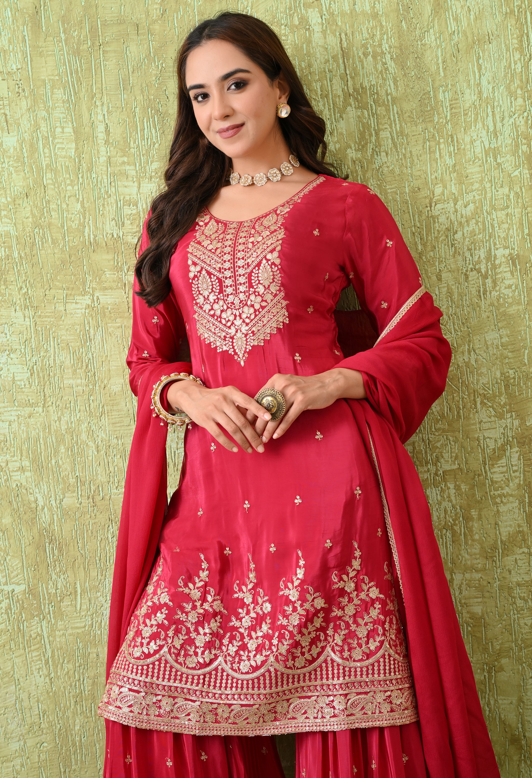 An elegant rani pink adorned with intricate golden embroidery, designed to exude timeless grace. The rich embroidery on the neckline, hemline, and sharara gives this outfit a festive grandeur, making it ideal for weddings, festive celebrations, and cultural events.
