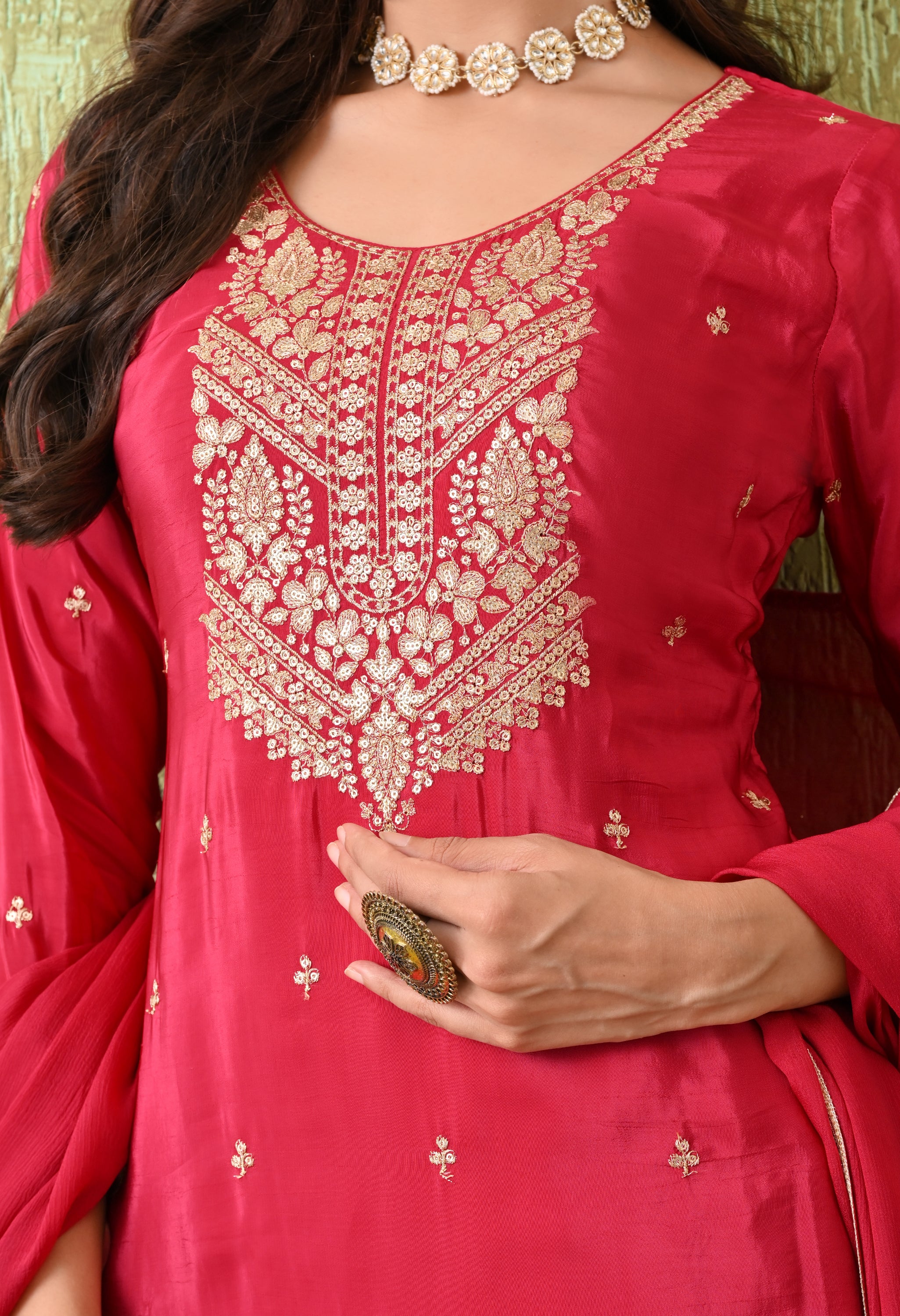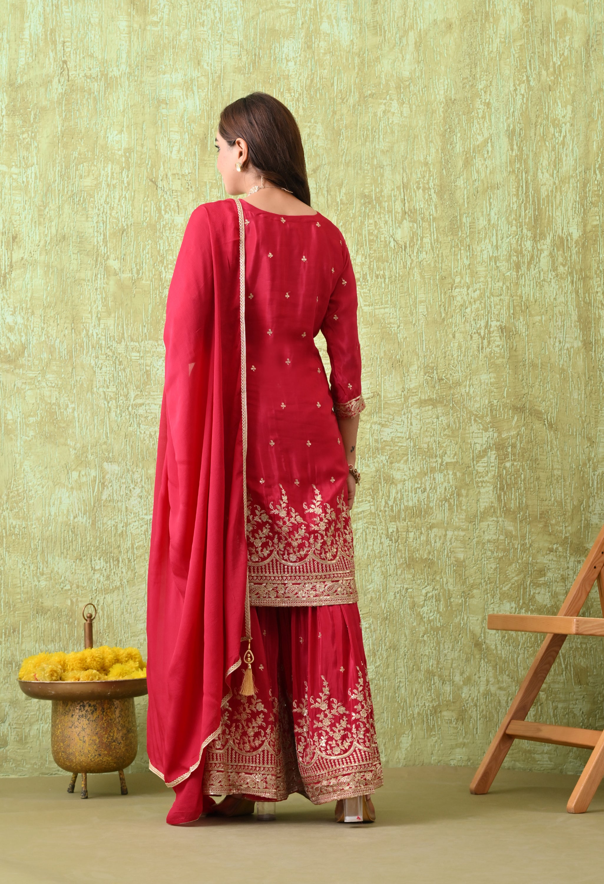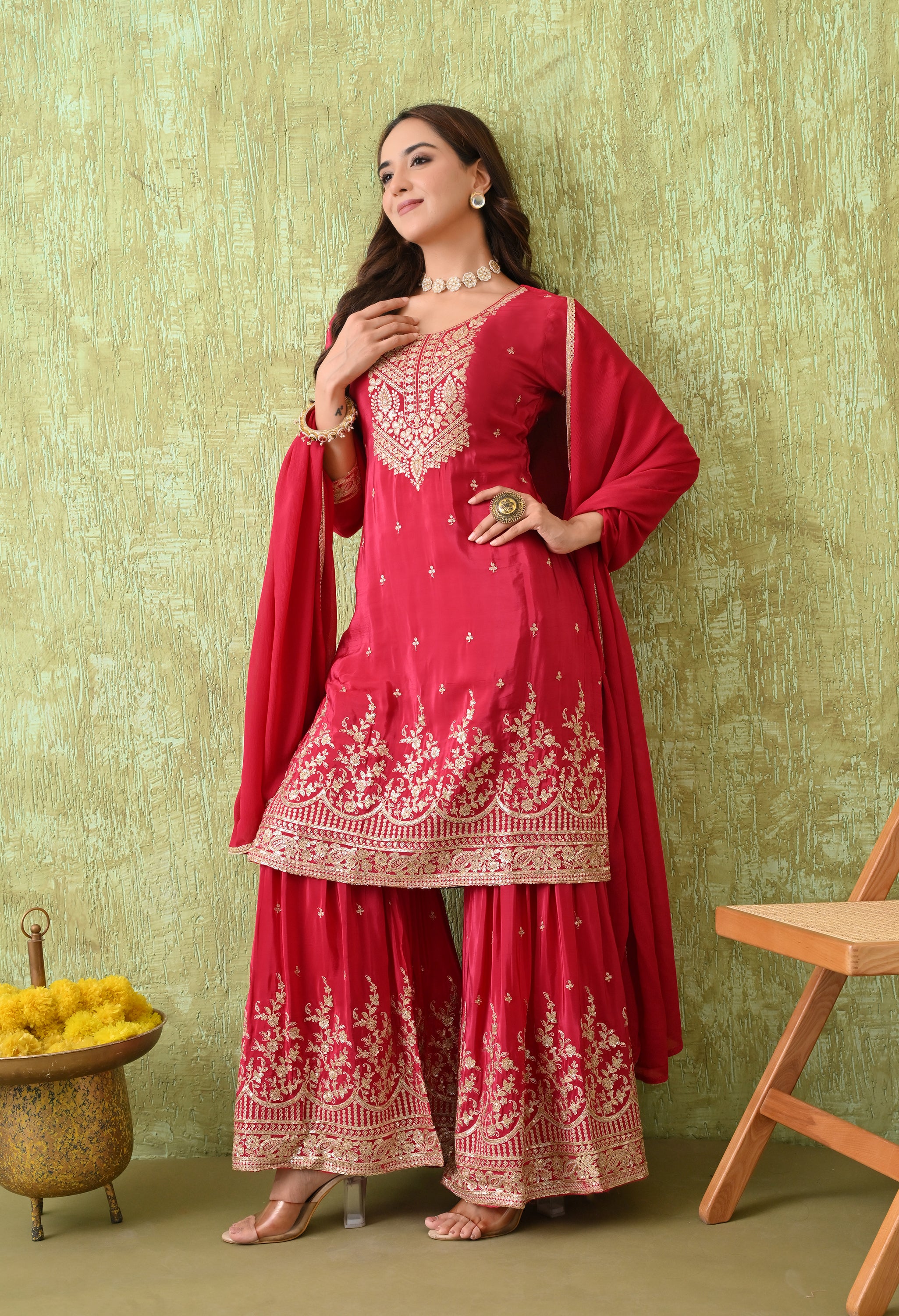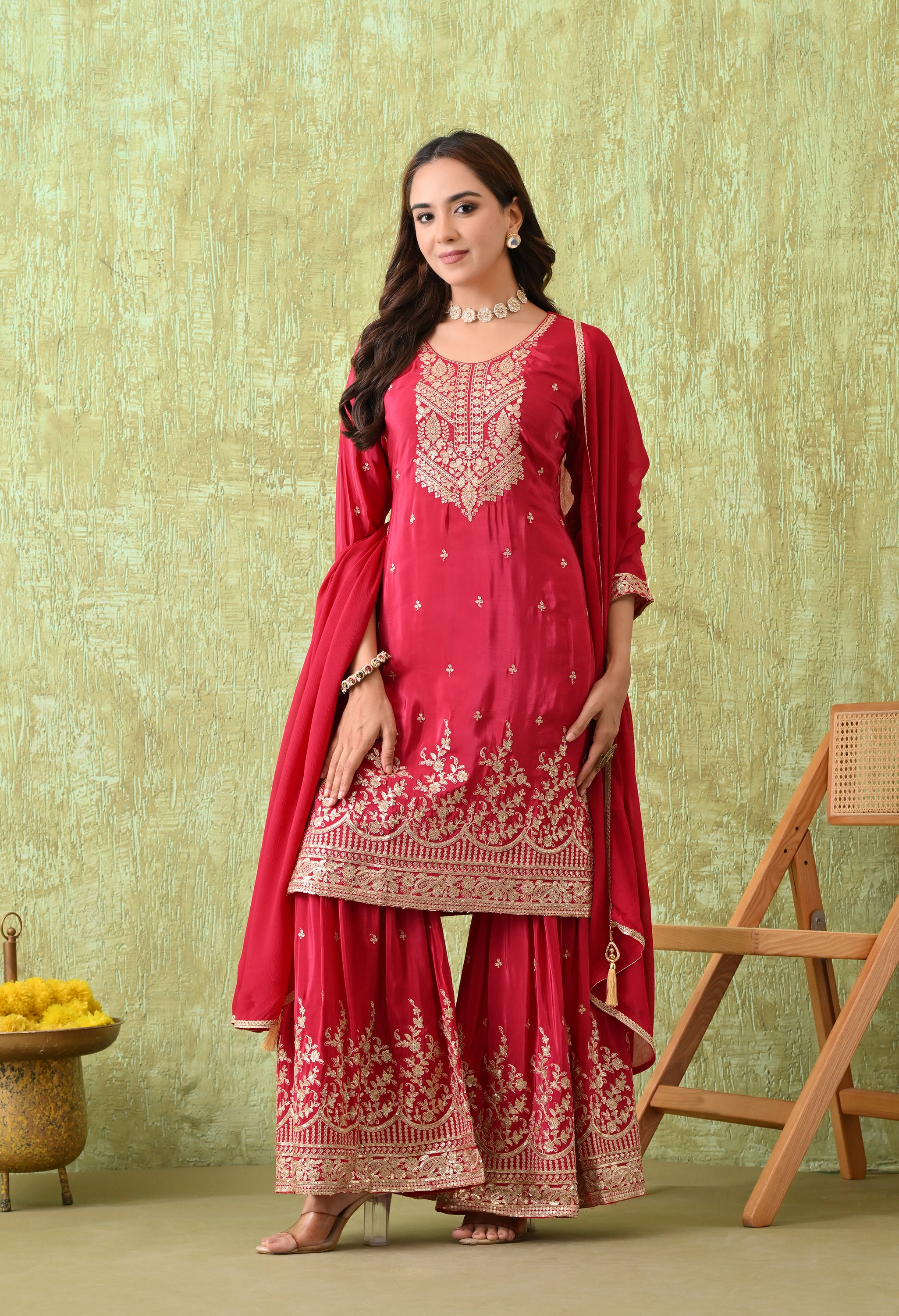 An elegant rani pink adorned with intricate golden embroidery, designed to exude timeless grace. The rich embroidery on the neckline, hemline, and sharara gives this outfit a festive grandeur, making it ideal for weddings, festive celebrations, and cultural events.