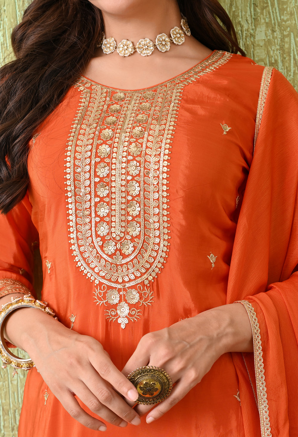 An elegant orange adorned with intricate golden embroidery, designed to exude timeless grace. The rich embroidery on the neckline, hemline, and sharara gives this outfit a festive grandeur, making it ideal for weddings, festive celebrations, and cultural events.