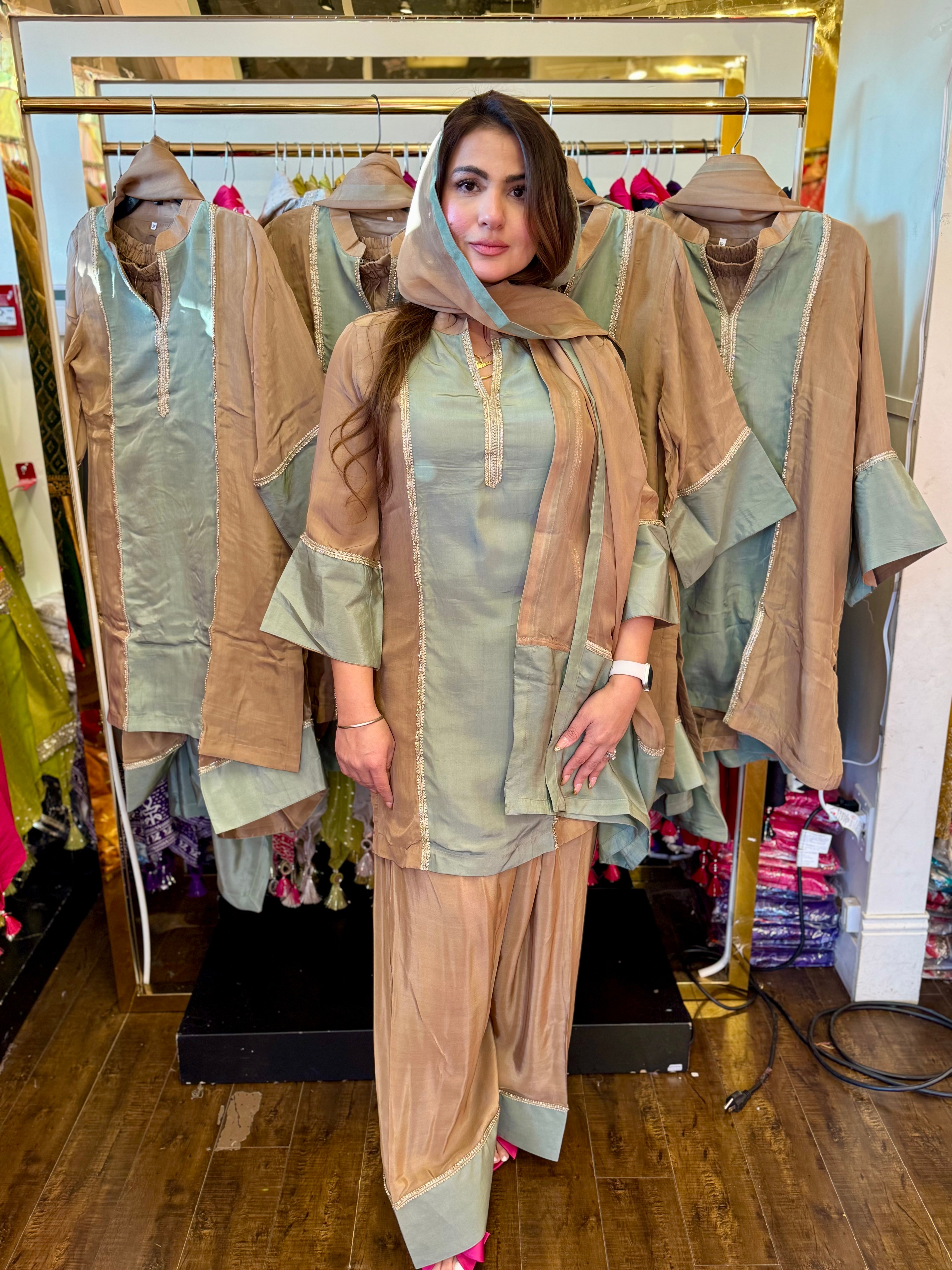 colour green kameez and brown salwar lose fitting