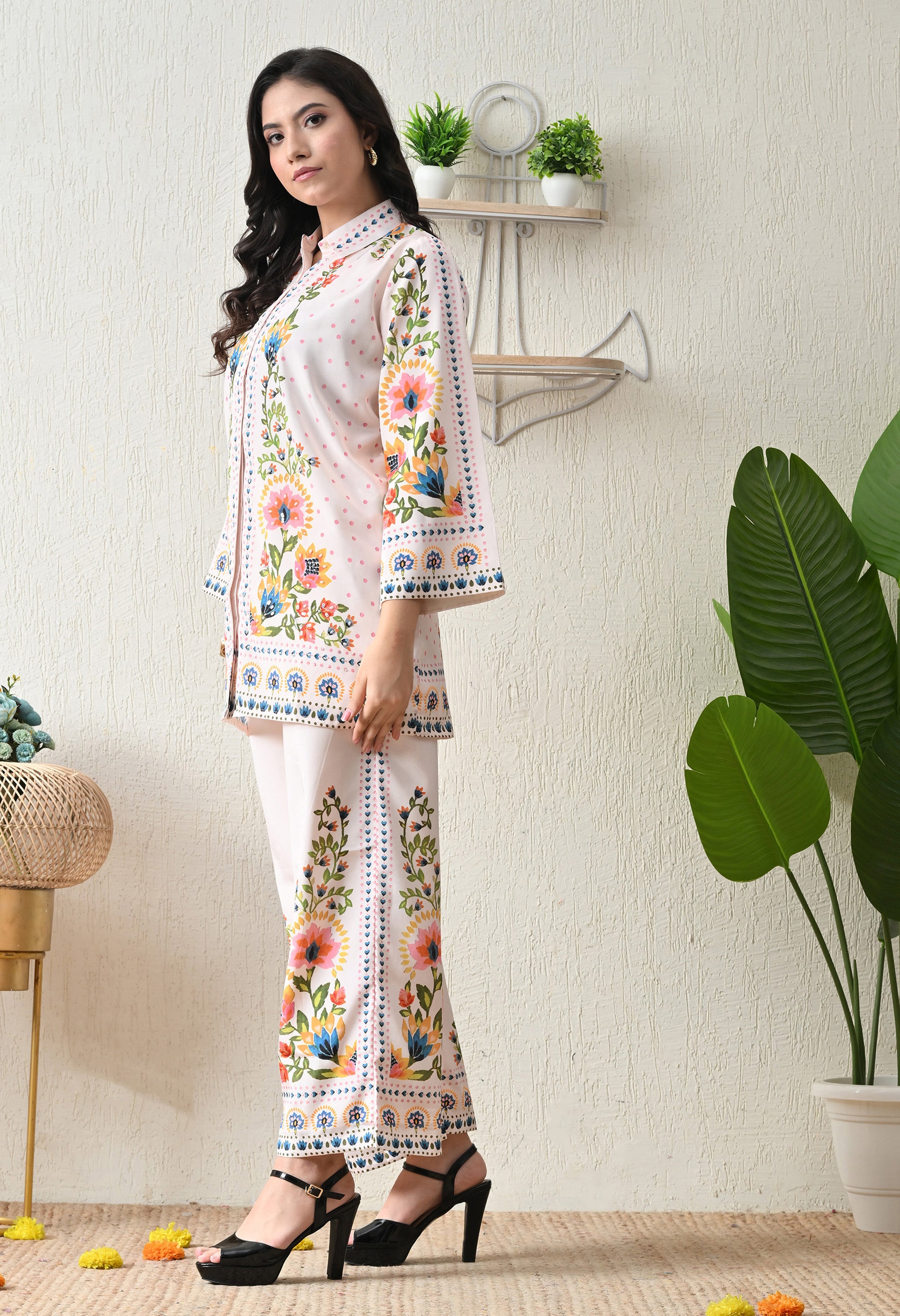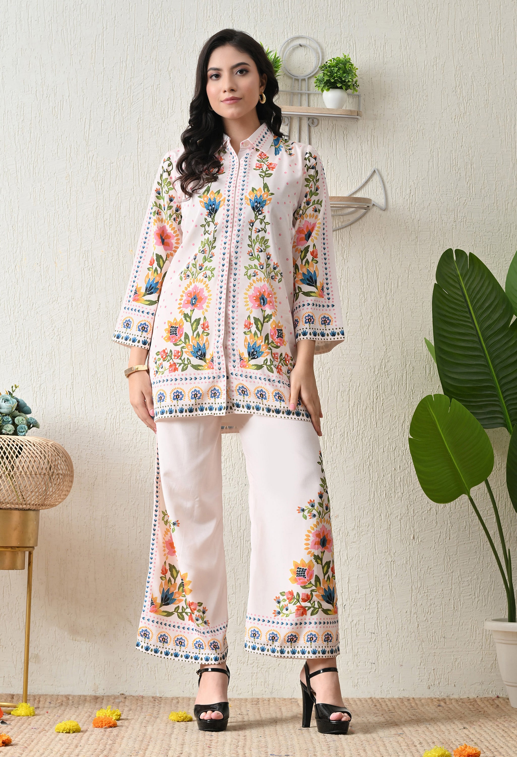 Fresh, vibrant, and effortlessly stylish — this floral symphony co-ord set is a must-have for your summer wardrobe. Designed in a soft white base with colorful botanical prints, the collared kurta and matching straight pants strike the perfect balance between elegance and ease. Ideal for brunches, casual outings, or festive daytime events.