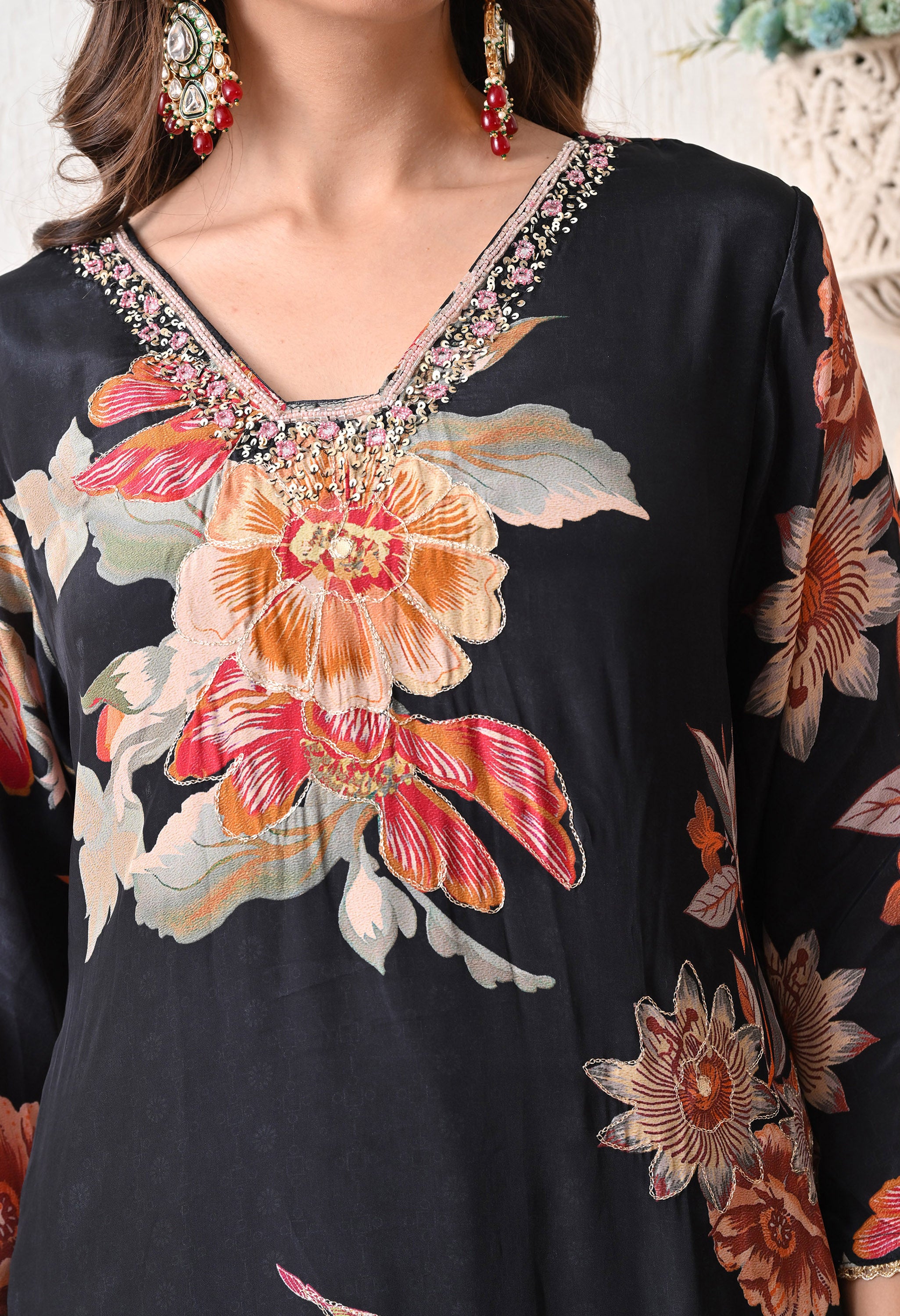 Make a striking style statement with our Floral Noir suit Set, where bold meets beauty. This elegant black kurta is brought to life with large, vibrant floral prints in warm shades of crimson, coral, and gold — giving it a luxurious yet effortless vibe. The neckline is delicately embellished, and it pairs seamlessly with solid black straight pants. The contrasting dupatta with dual-tone panels and gota edging adds an artistic flair. Perfect for festive evenings, get-togethers, or cultural celebrations, this set is your go-to for blooming in style.
