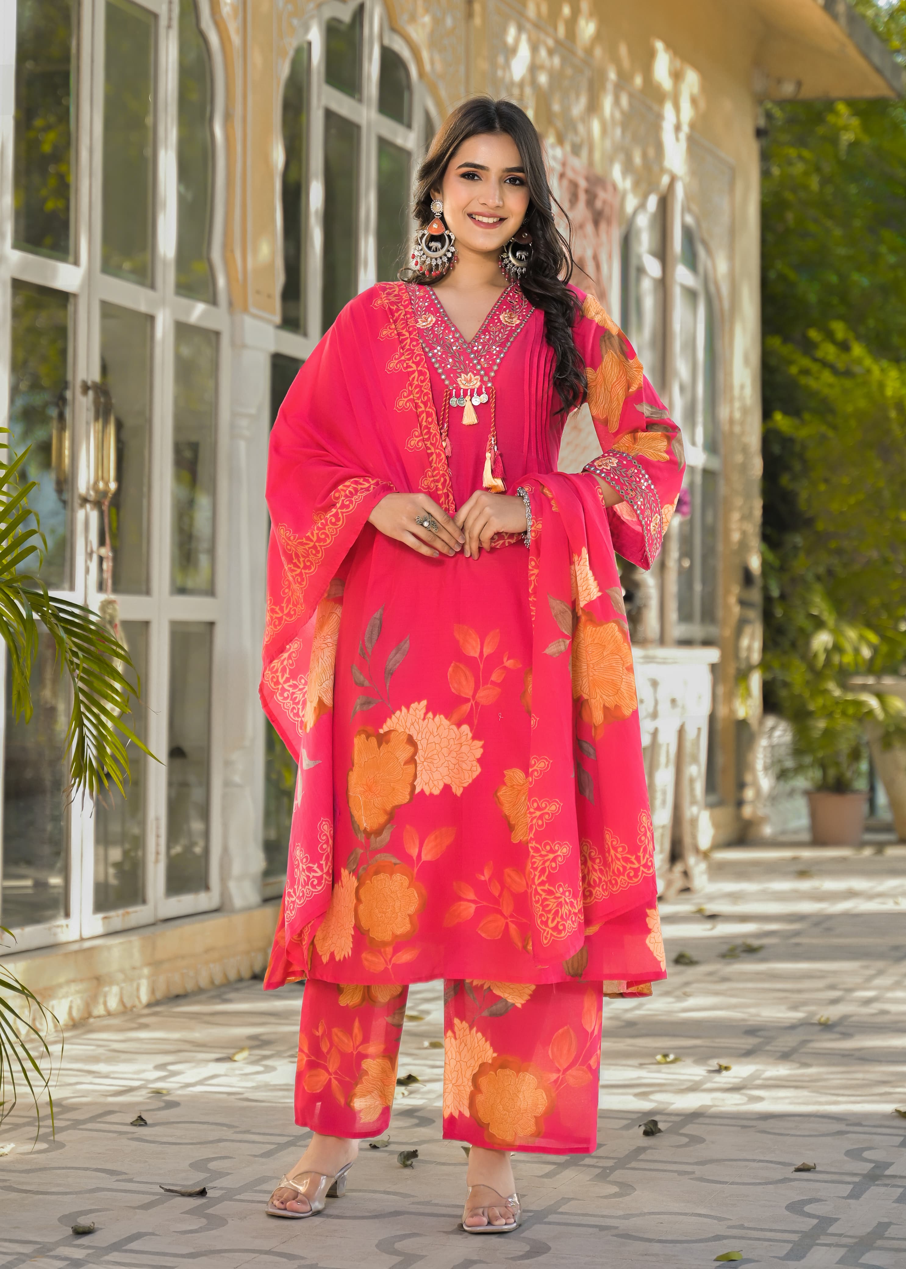 Embrace timeless grace with this ivory suit set adorned with bold floral prints in shades of grey, pink, and beige. The straight kurta is accentuated with a delicate embroidered neckline featuring tassel tie-ups, adding a playful touch to its elegance.
