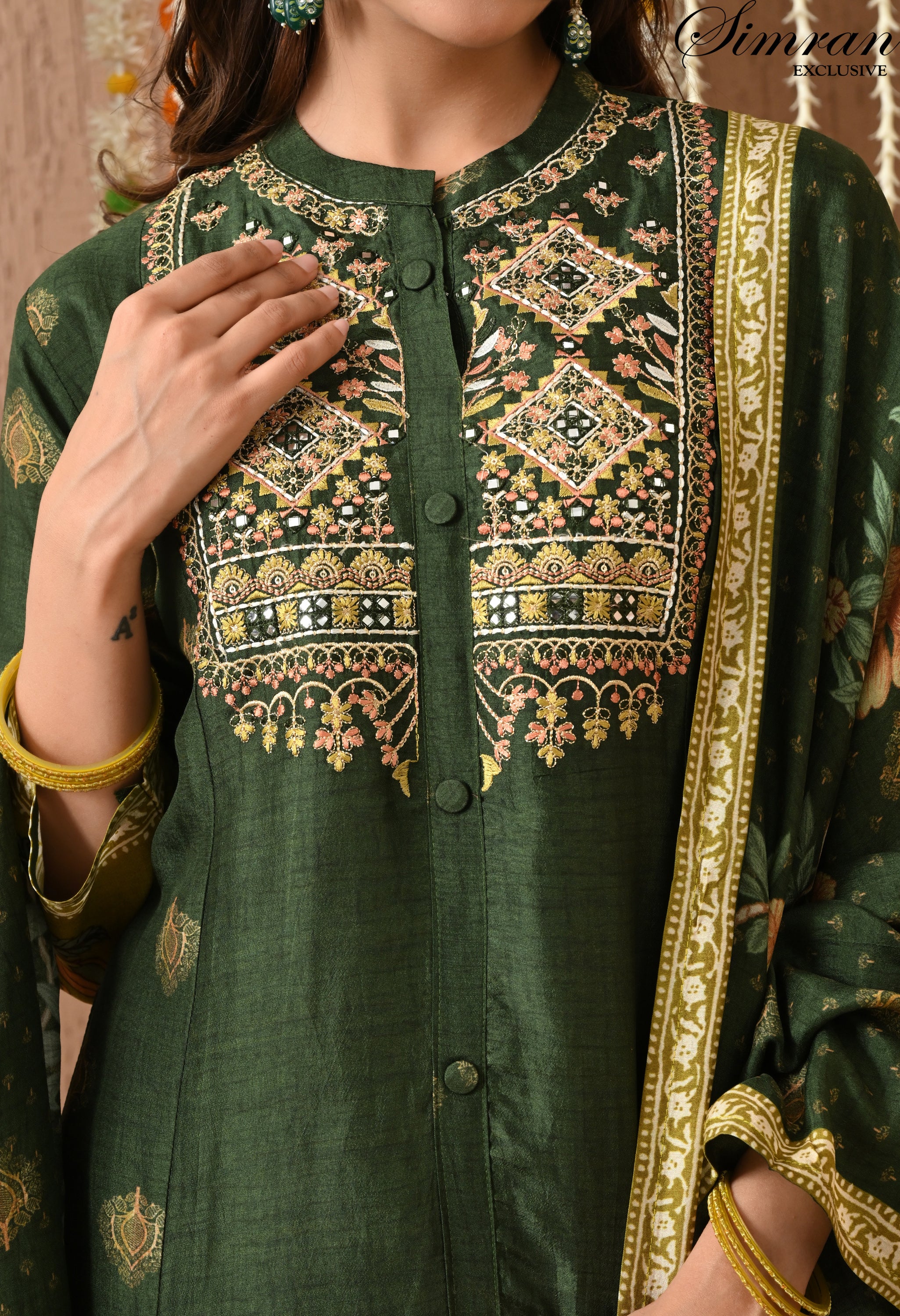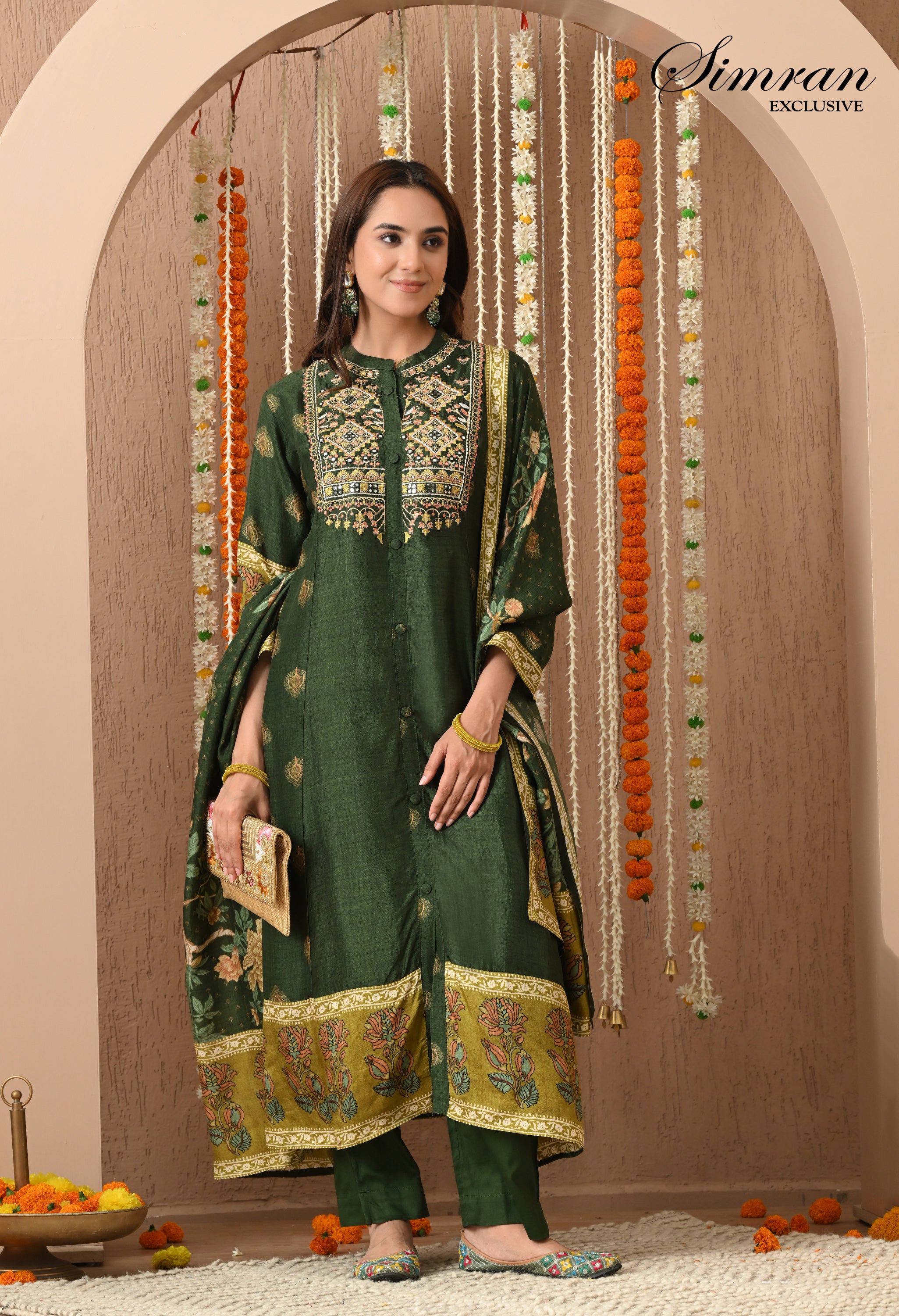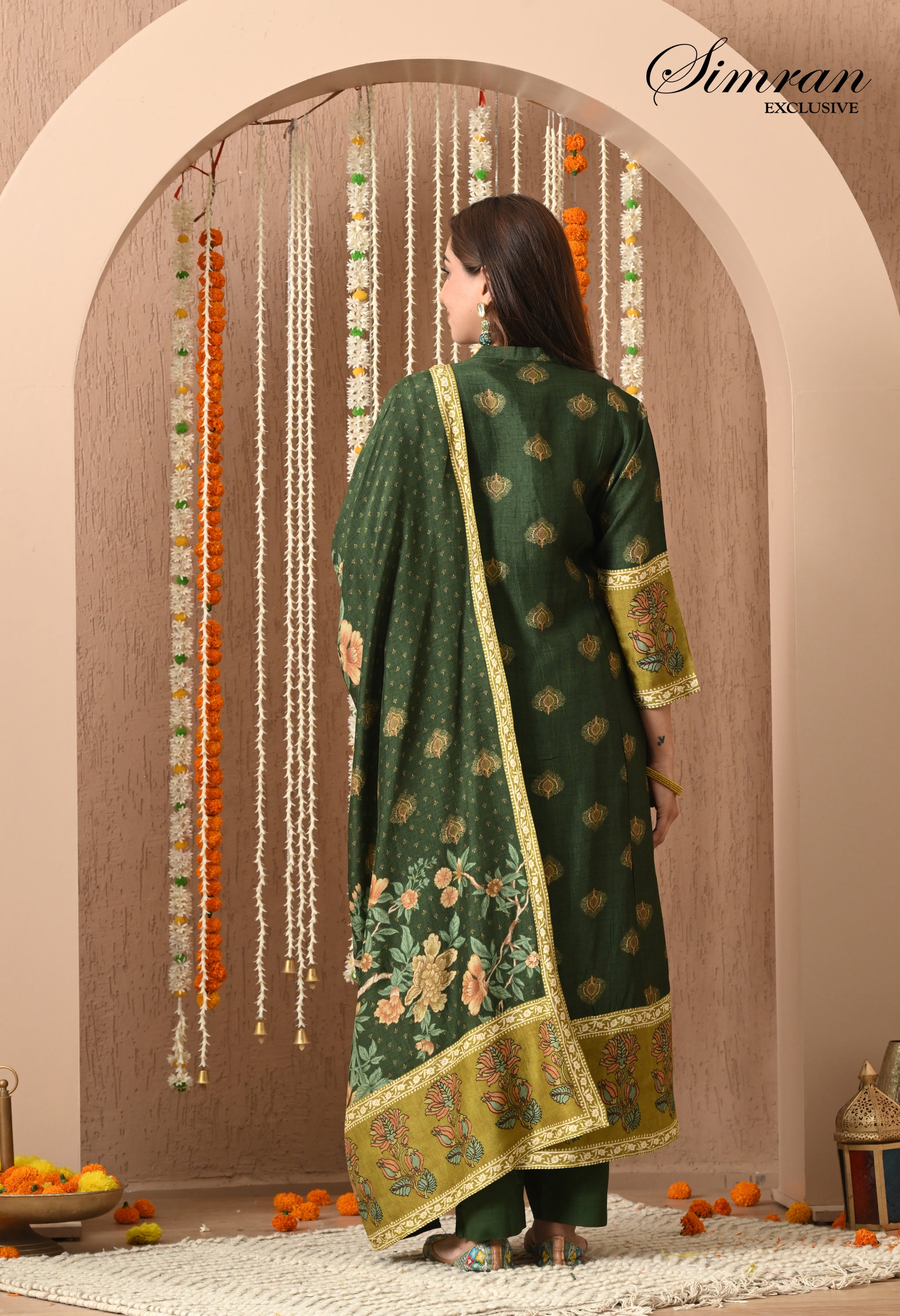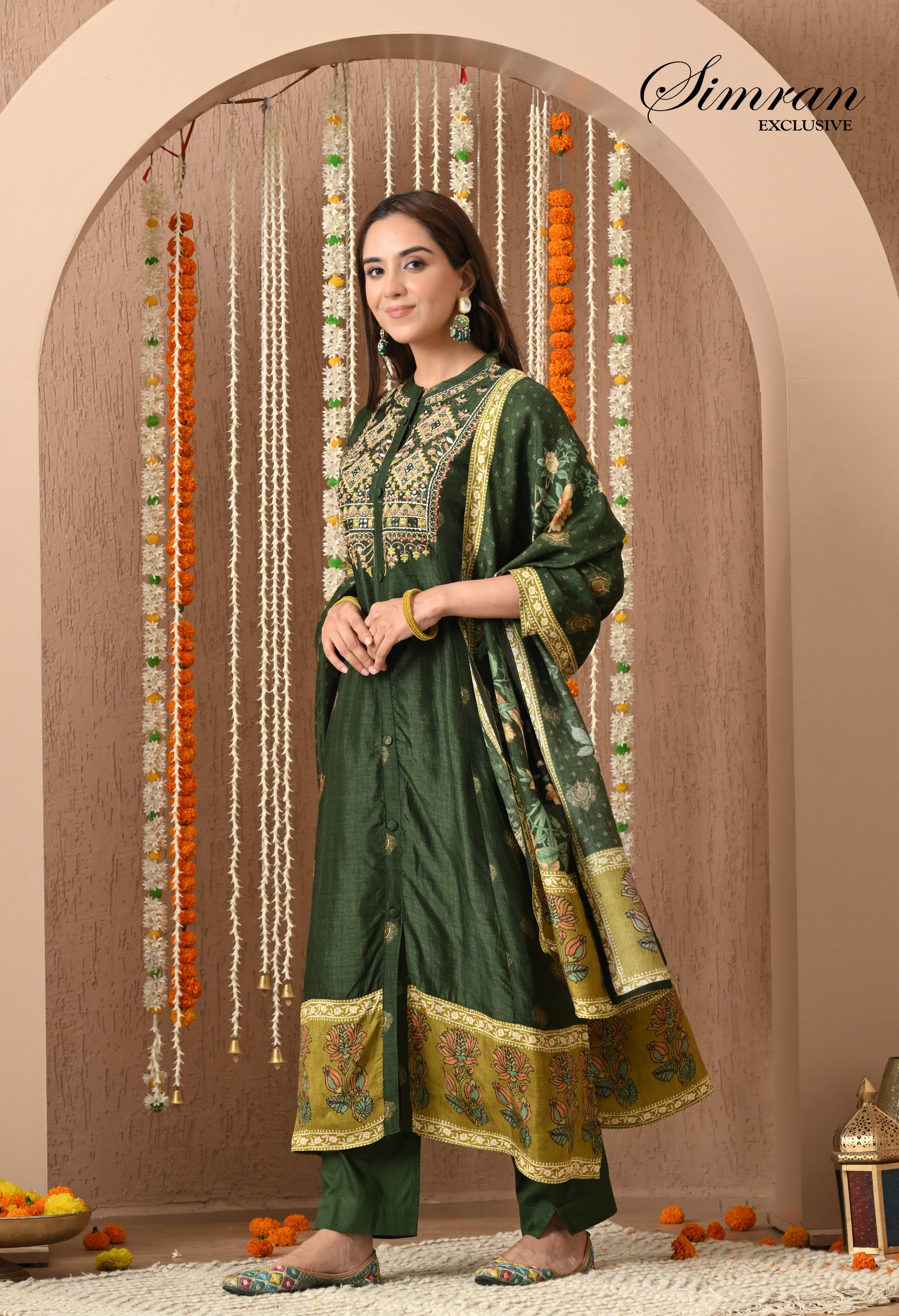 Elegant forest green suit adorned with intricate embroidery and heritage prints — a perfect blend of festive charm and timeless tradition.
