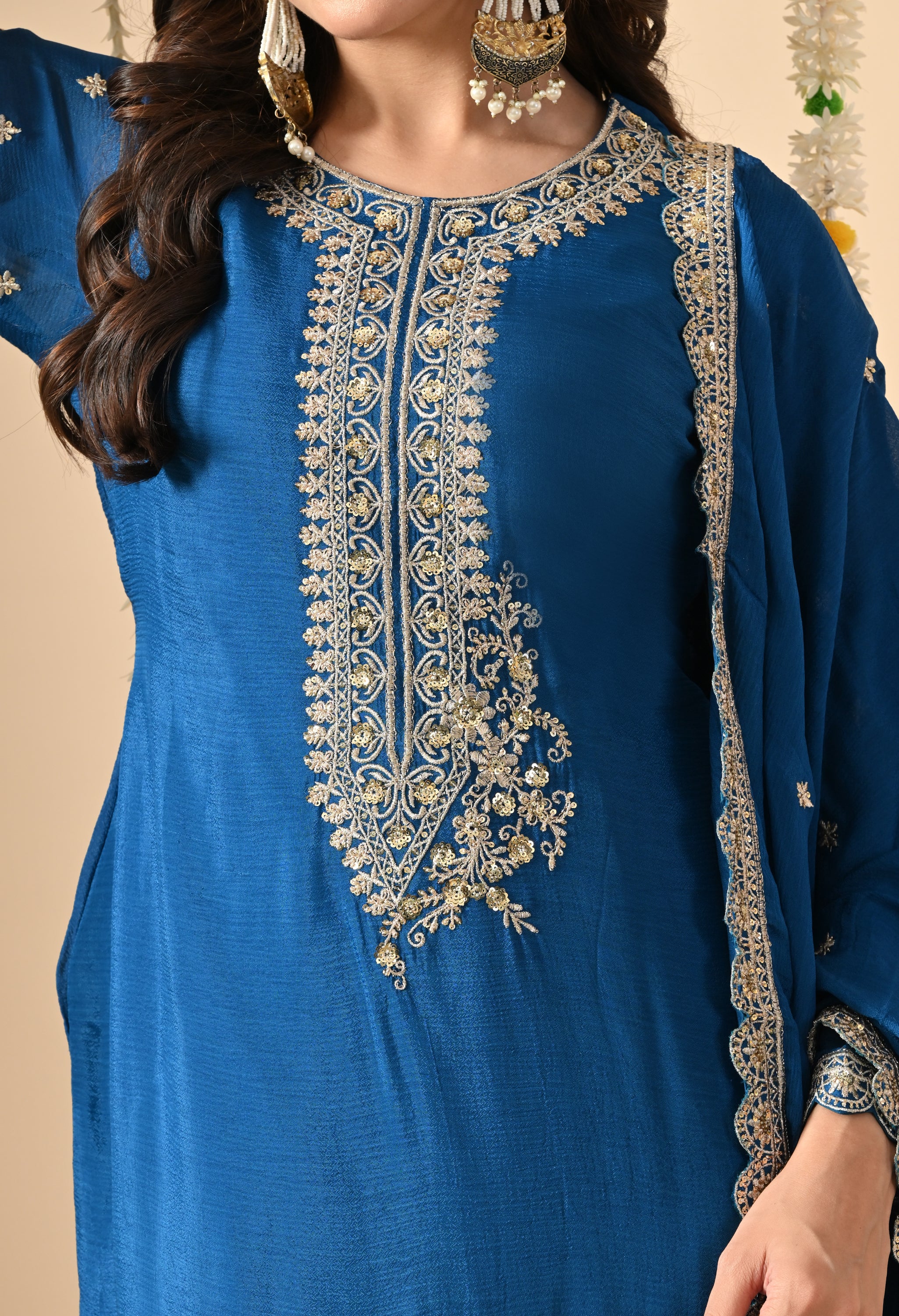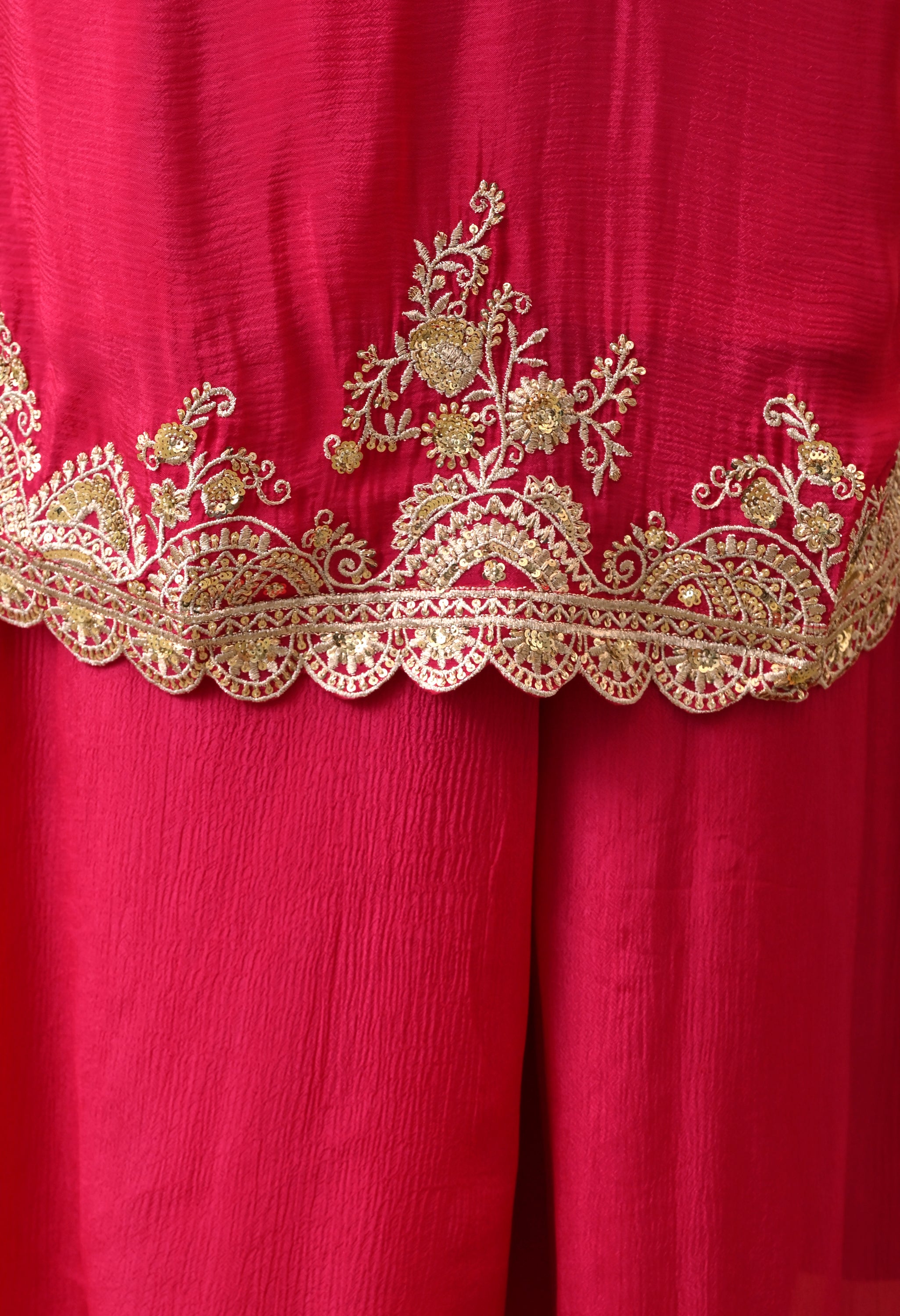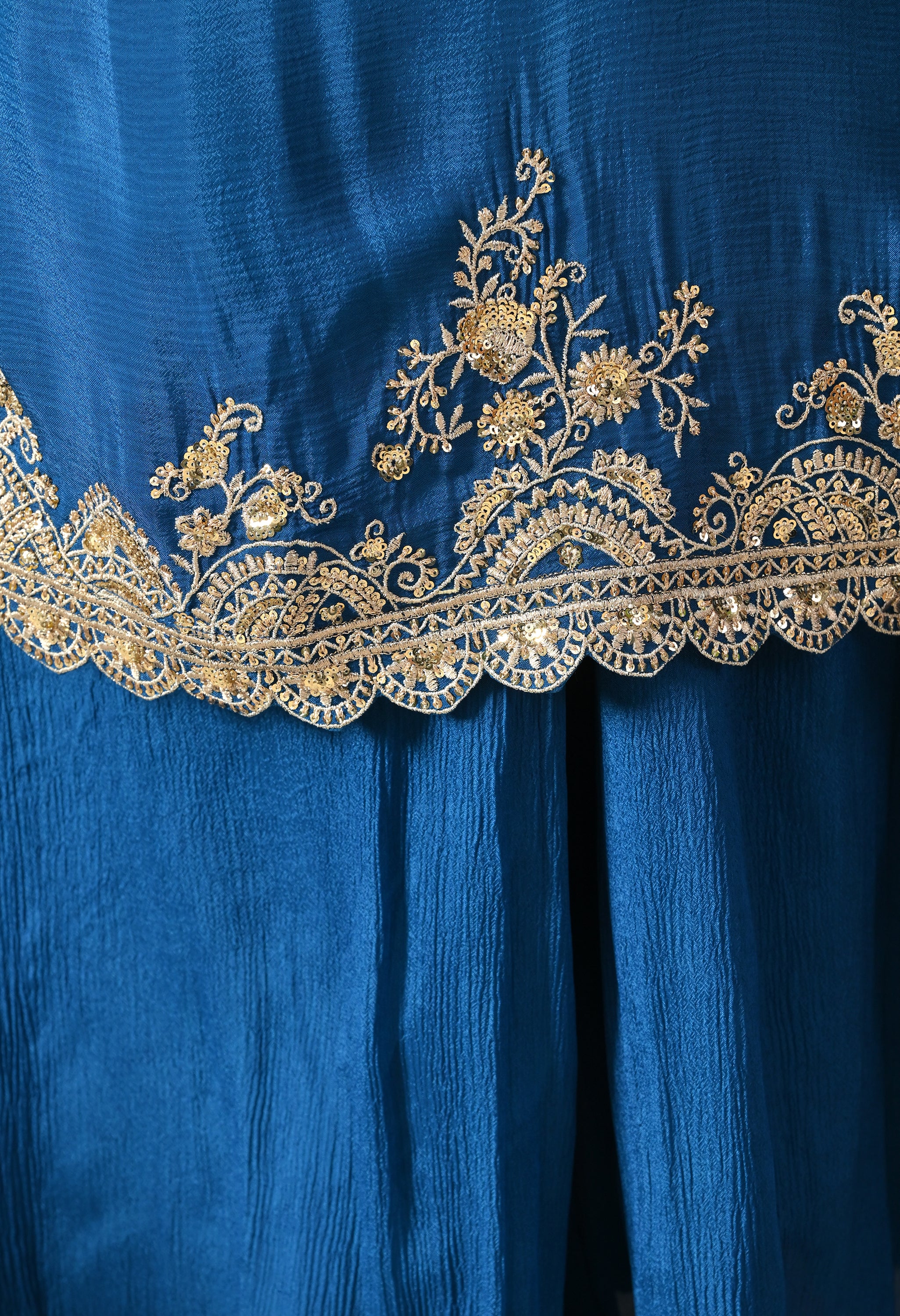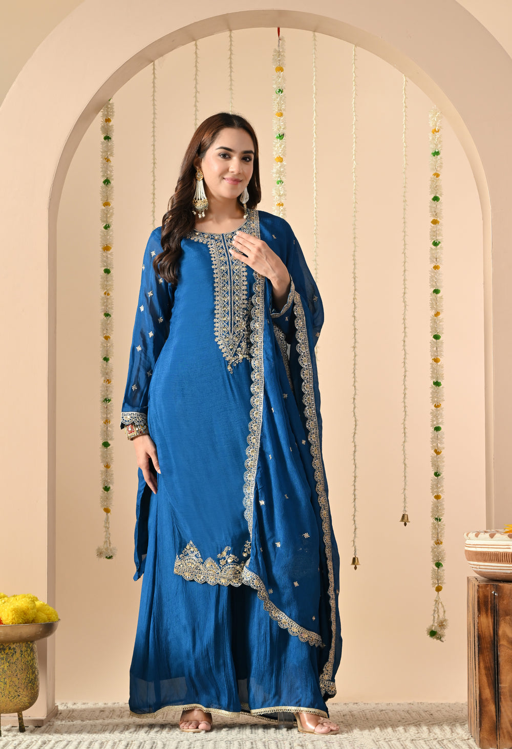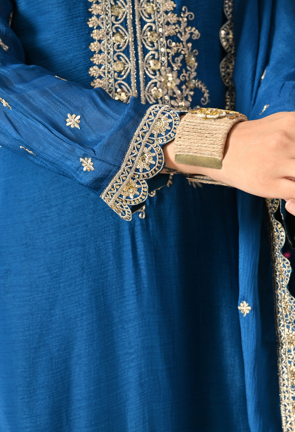 A regal sharara suit set with exquisite embroidery and graceful styling. This elegant attire is a perfect blend of tradition and modern sophistication, making it suitable for weddings, festive gatherings, and cultural events.