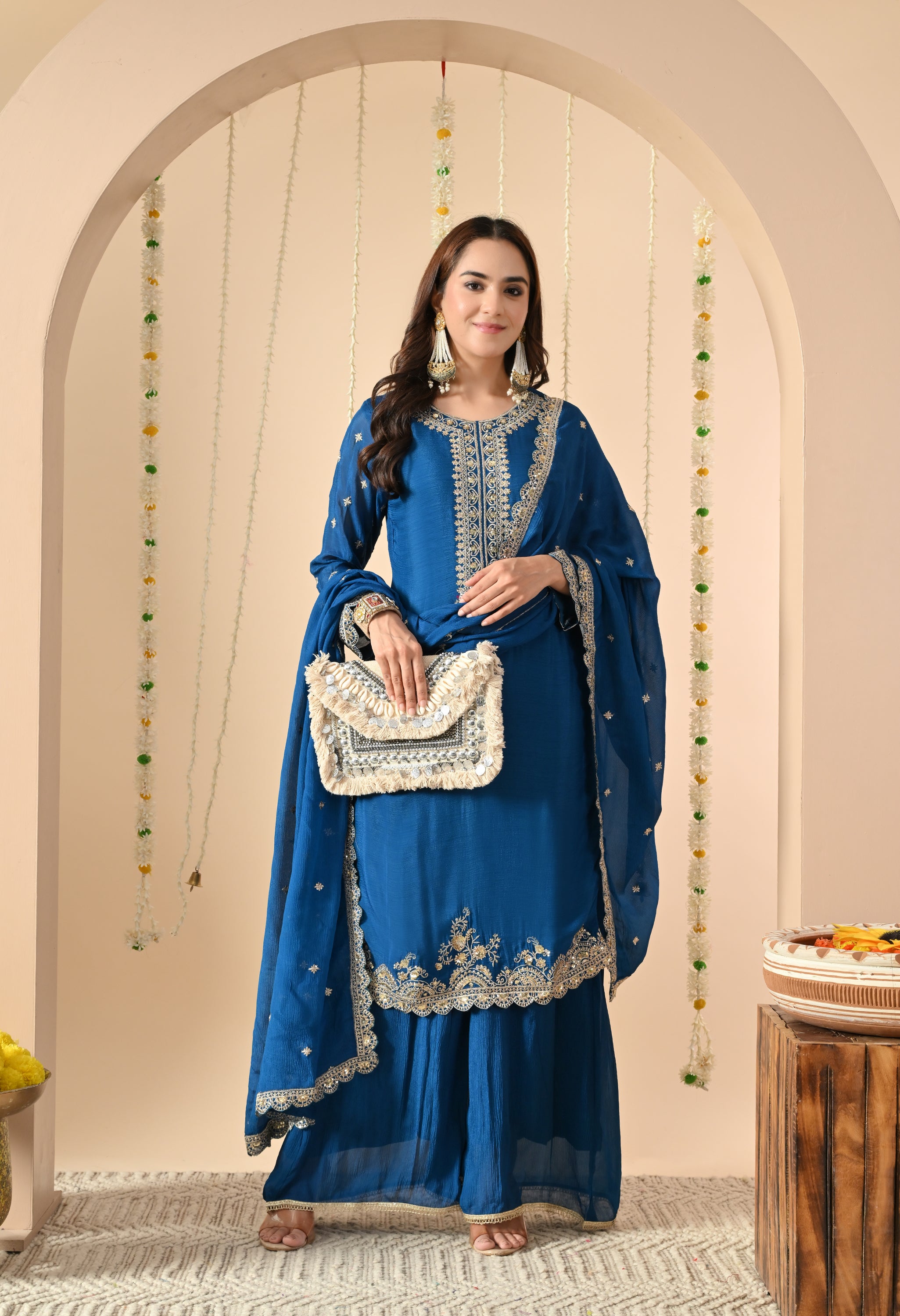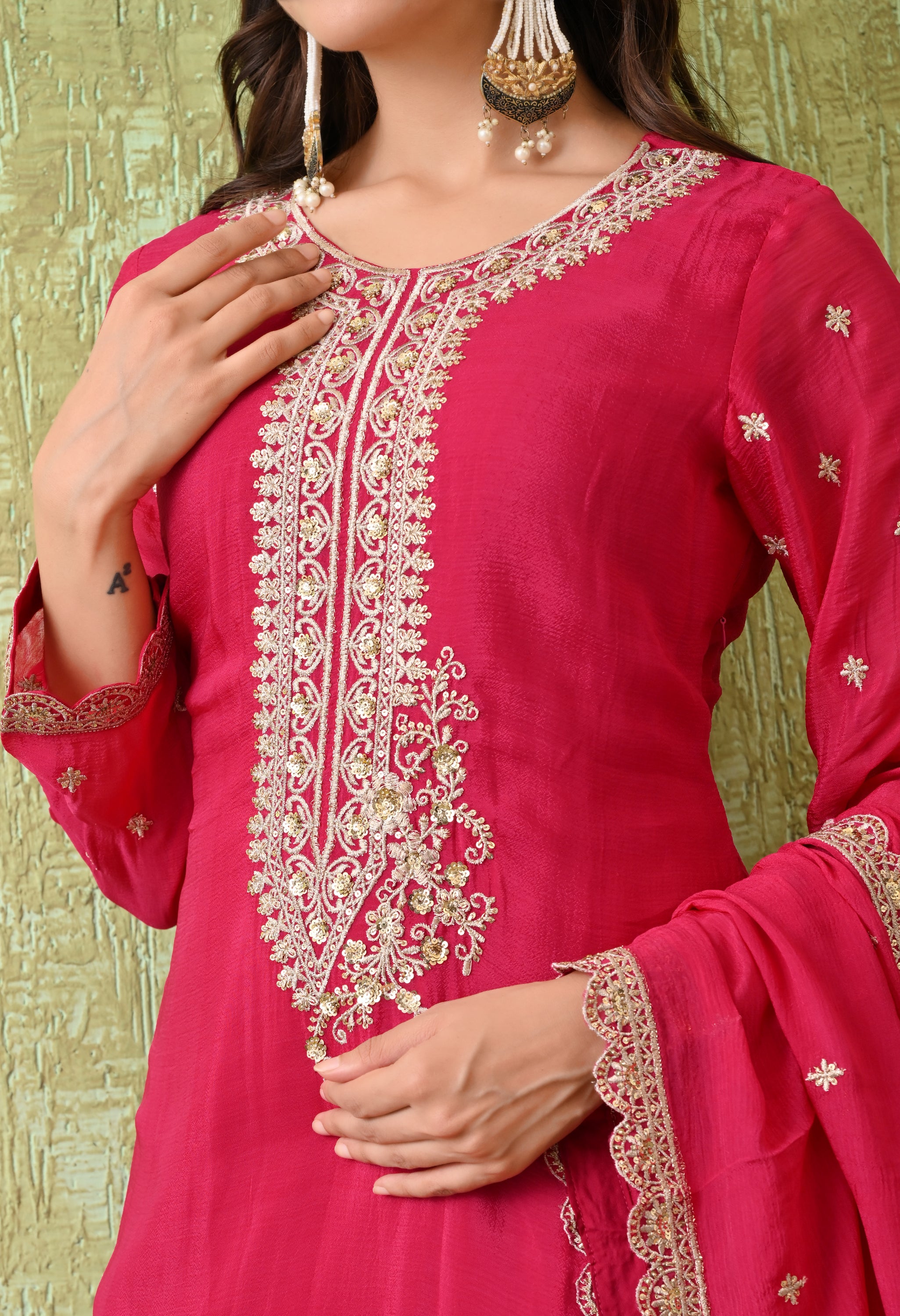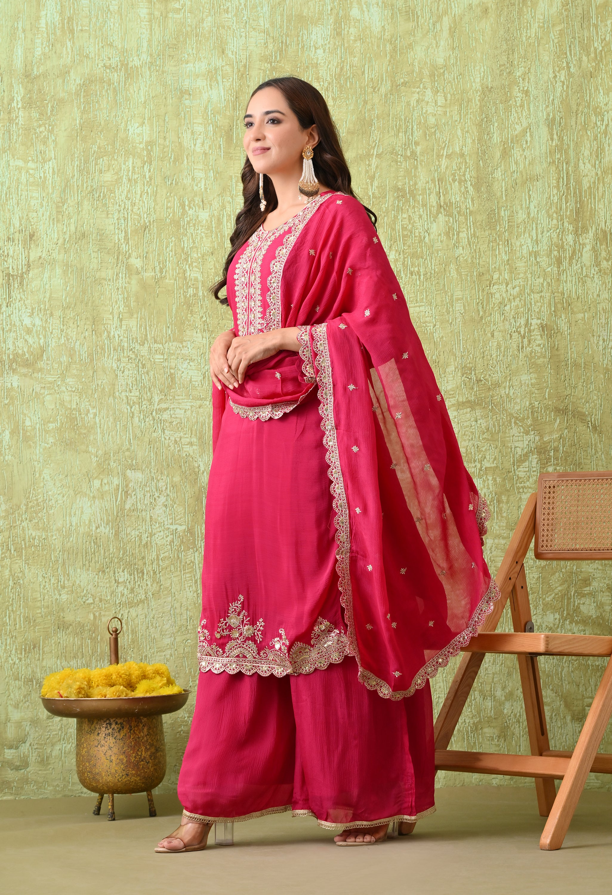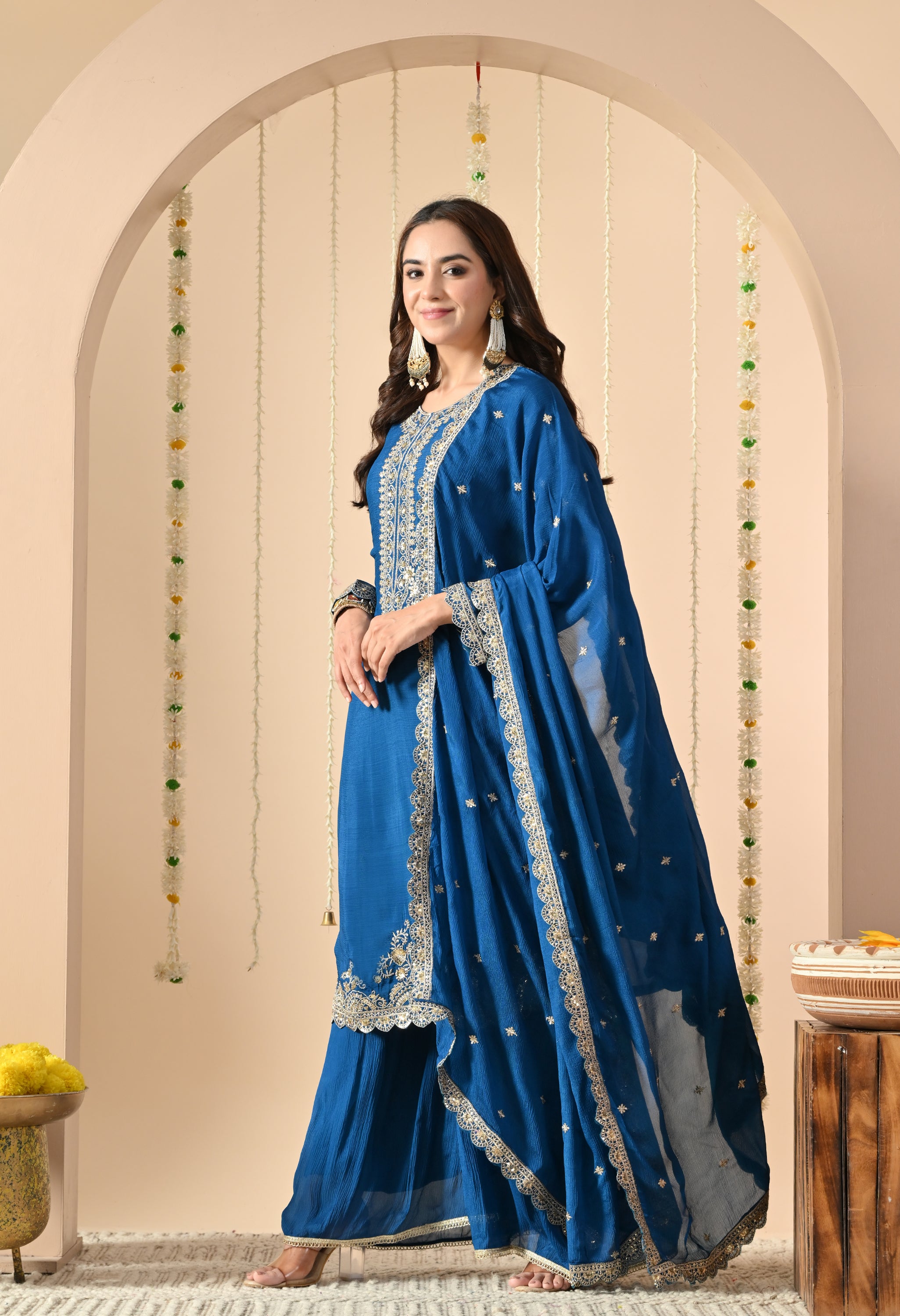 A regal sharara suit set with exquisite embroidery and graceful styling. This elegant attire is a perfect blend of tradition and modern sophistication, making it suitable for weddings, festive gatherings, and cultural events.