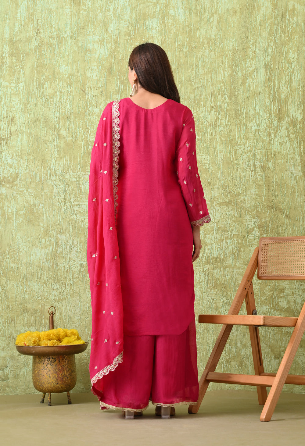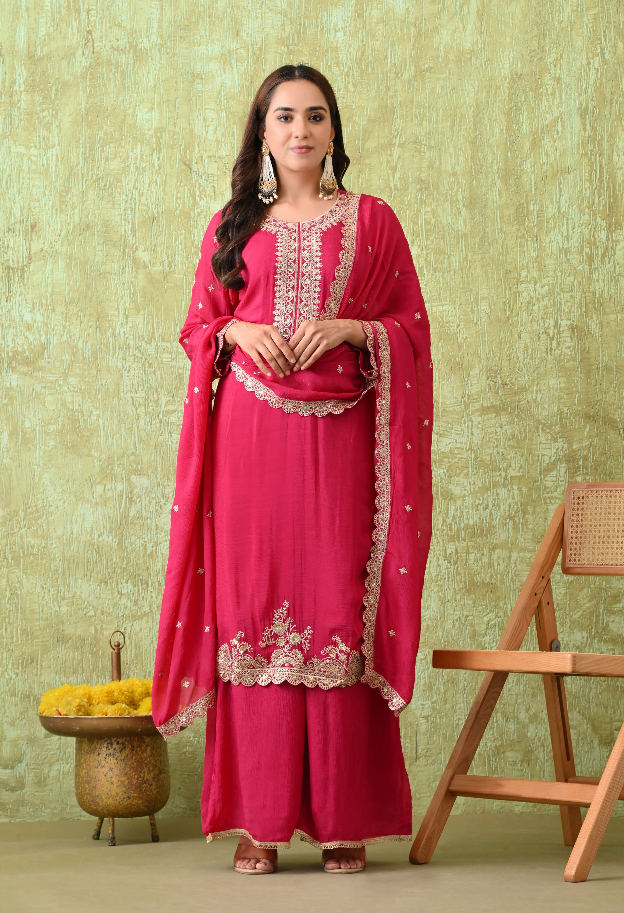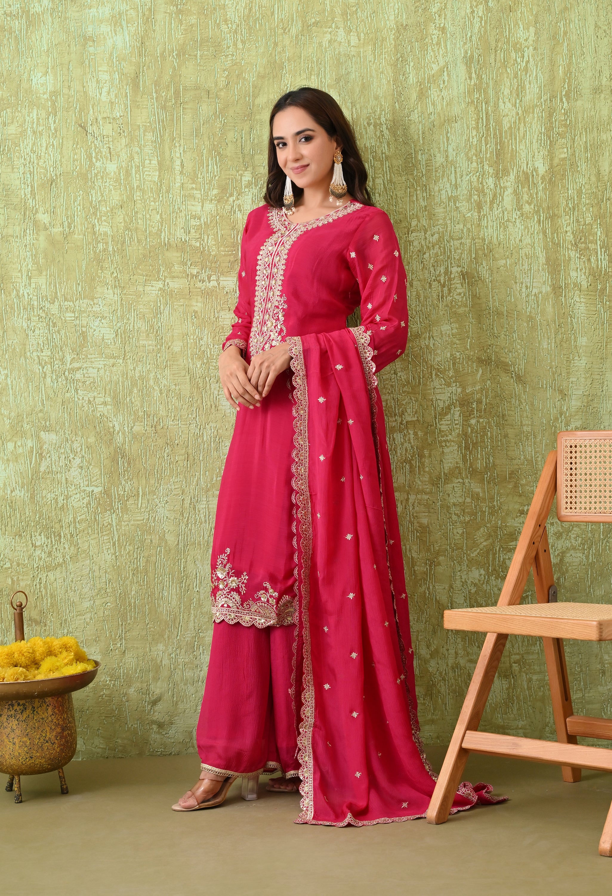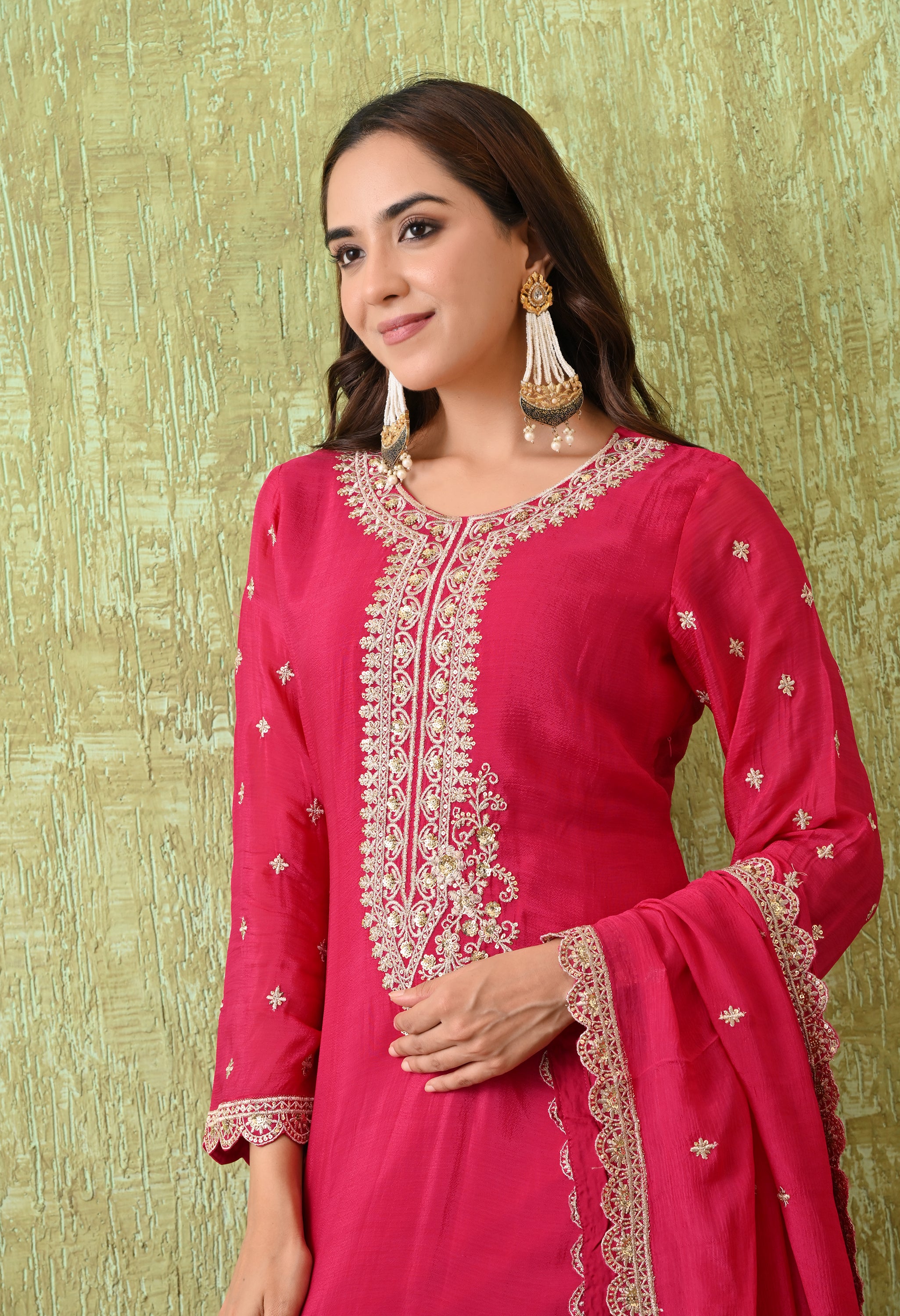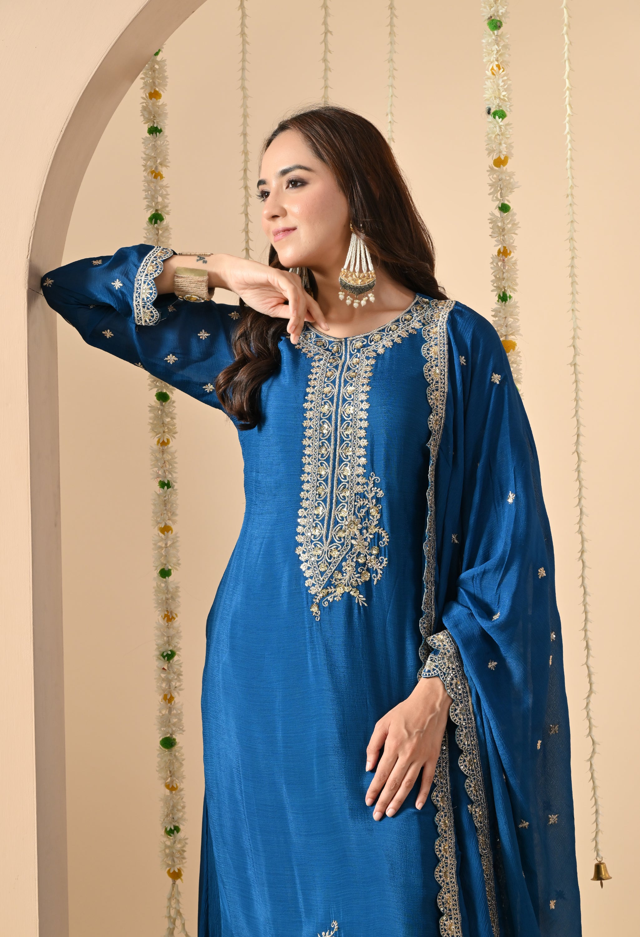 A regal sharara suit set with exquisite embroidery and graceful styling. This elegant attire is a perfect blend of tradition and modern sophistication, making it suitable for weddings, festive gatherings, and cultural events.